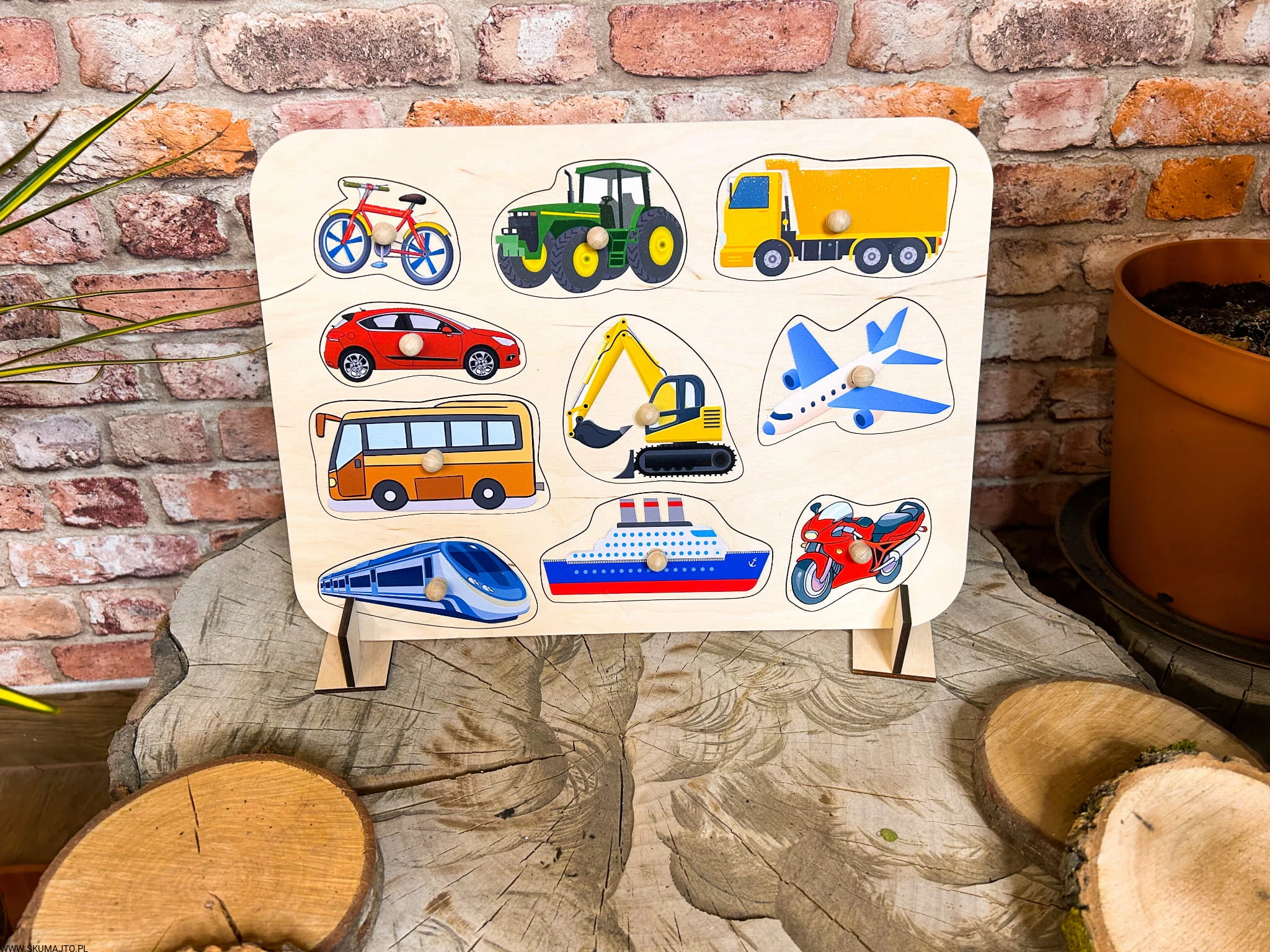 Układanka "Pojazdy" to idealna zabawka edukacyjna dla najmłodszych, która łączy naukę i zabawę. Na drewnianej planszy znajdują się 10 otworów z podpisami, a zadaniem dziecka jest dopasowanie odpowiednich pojazdów do właściwych miejsc.