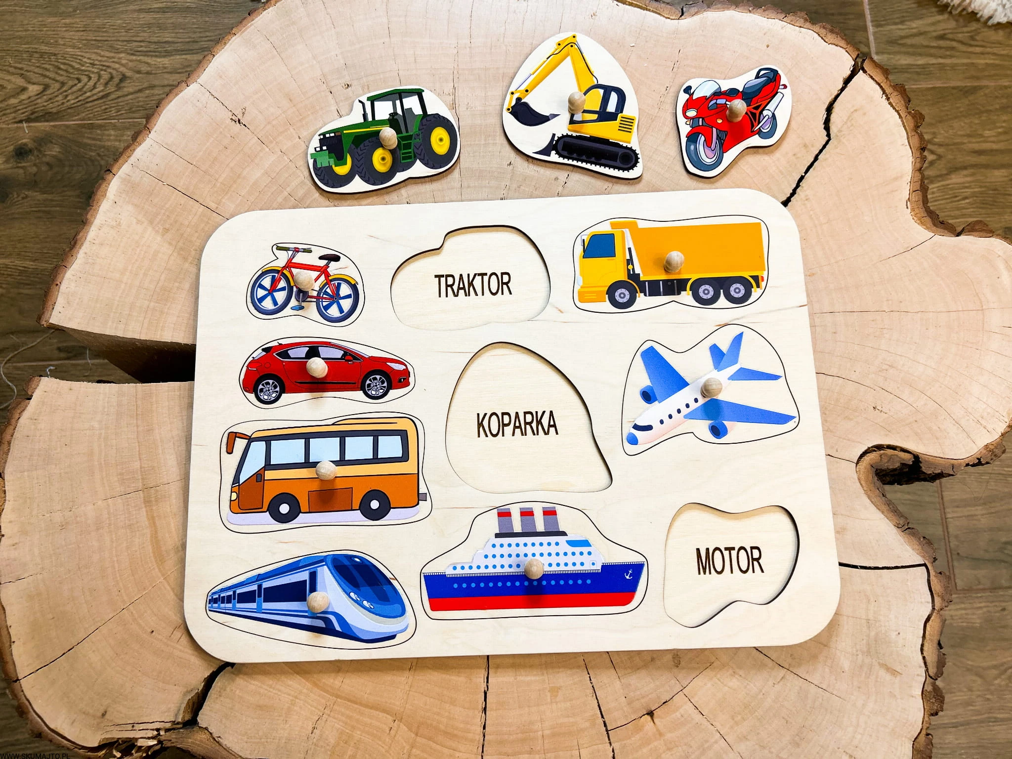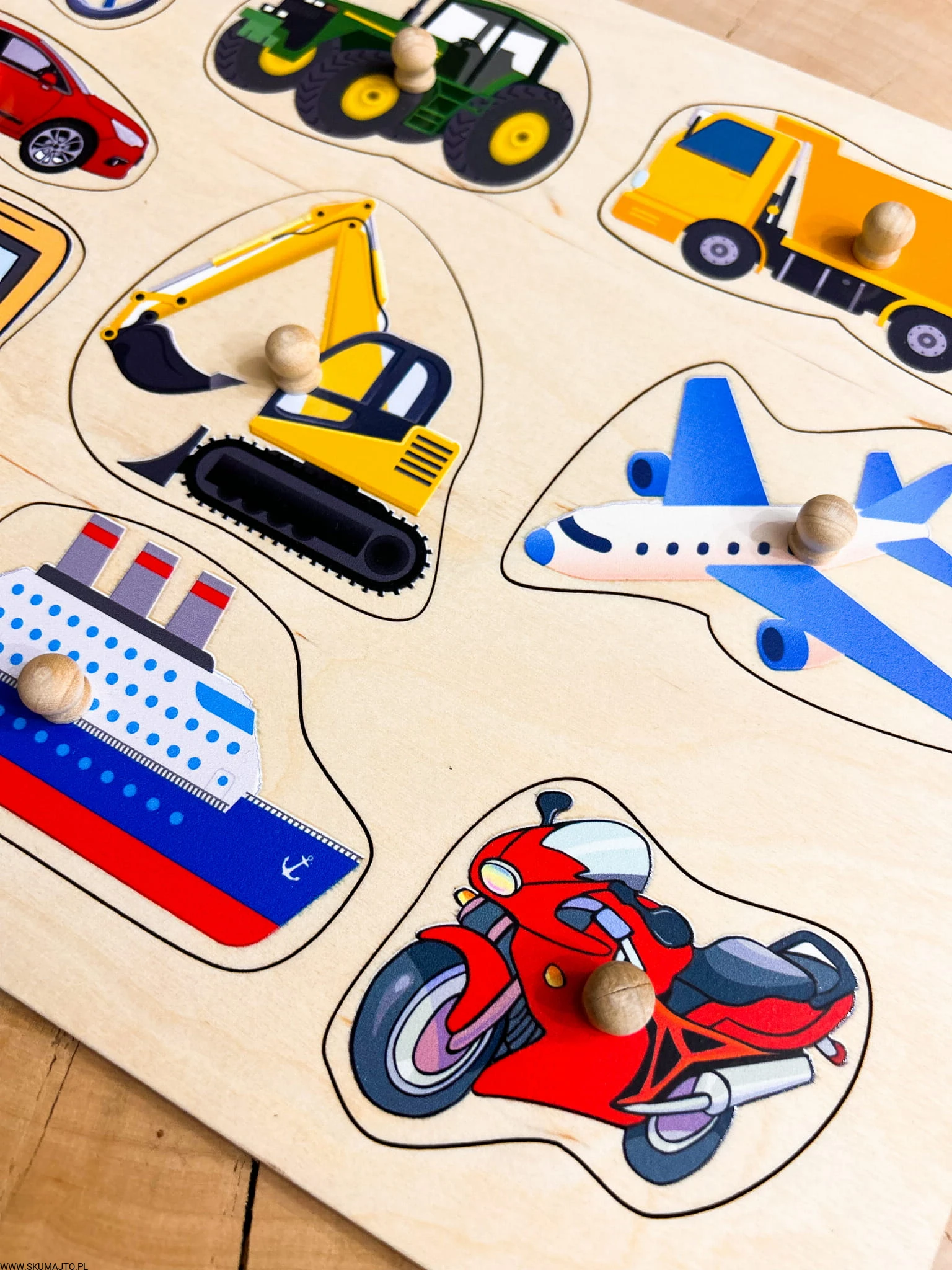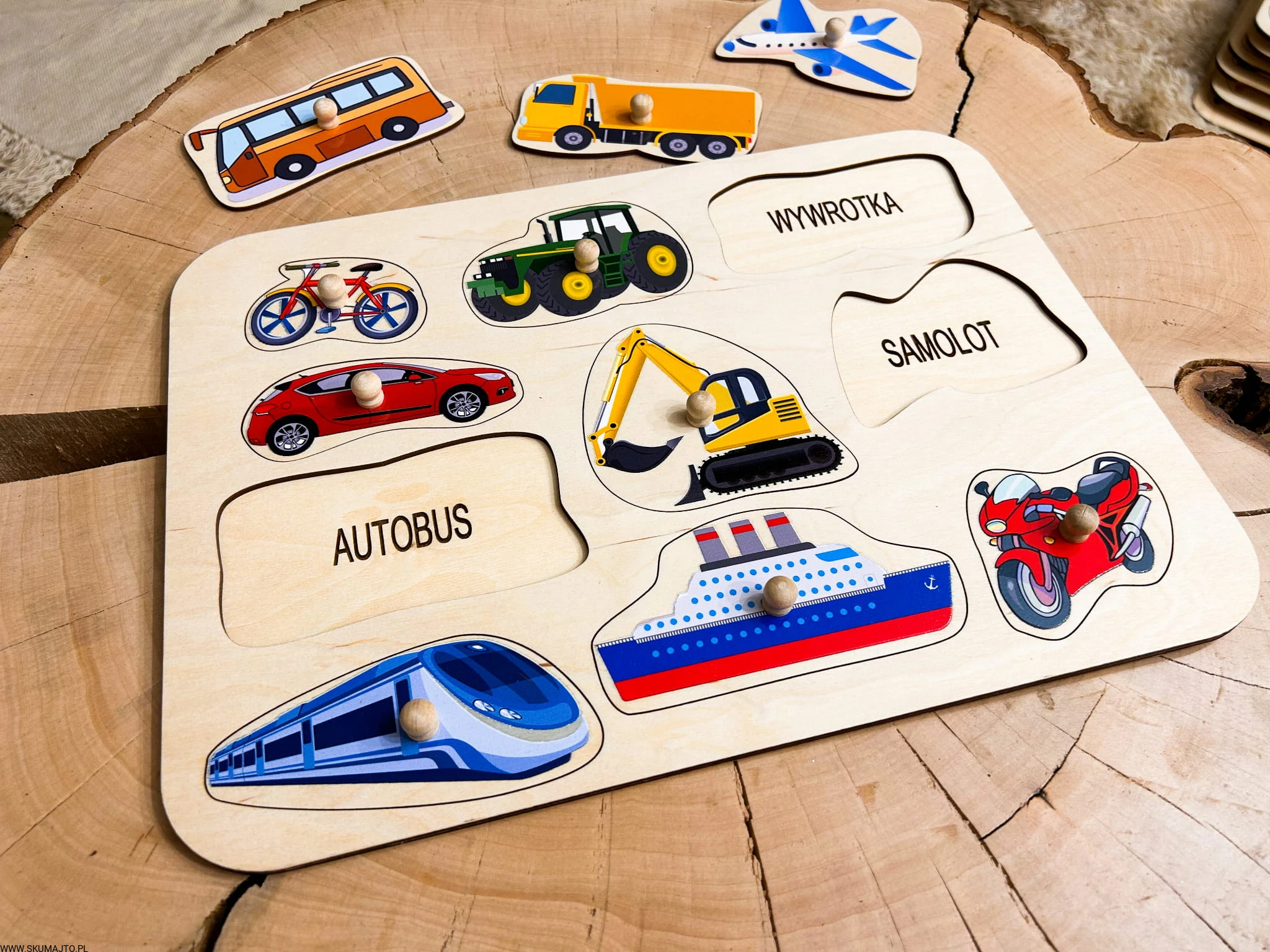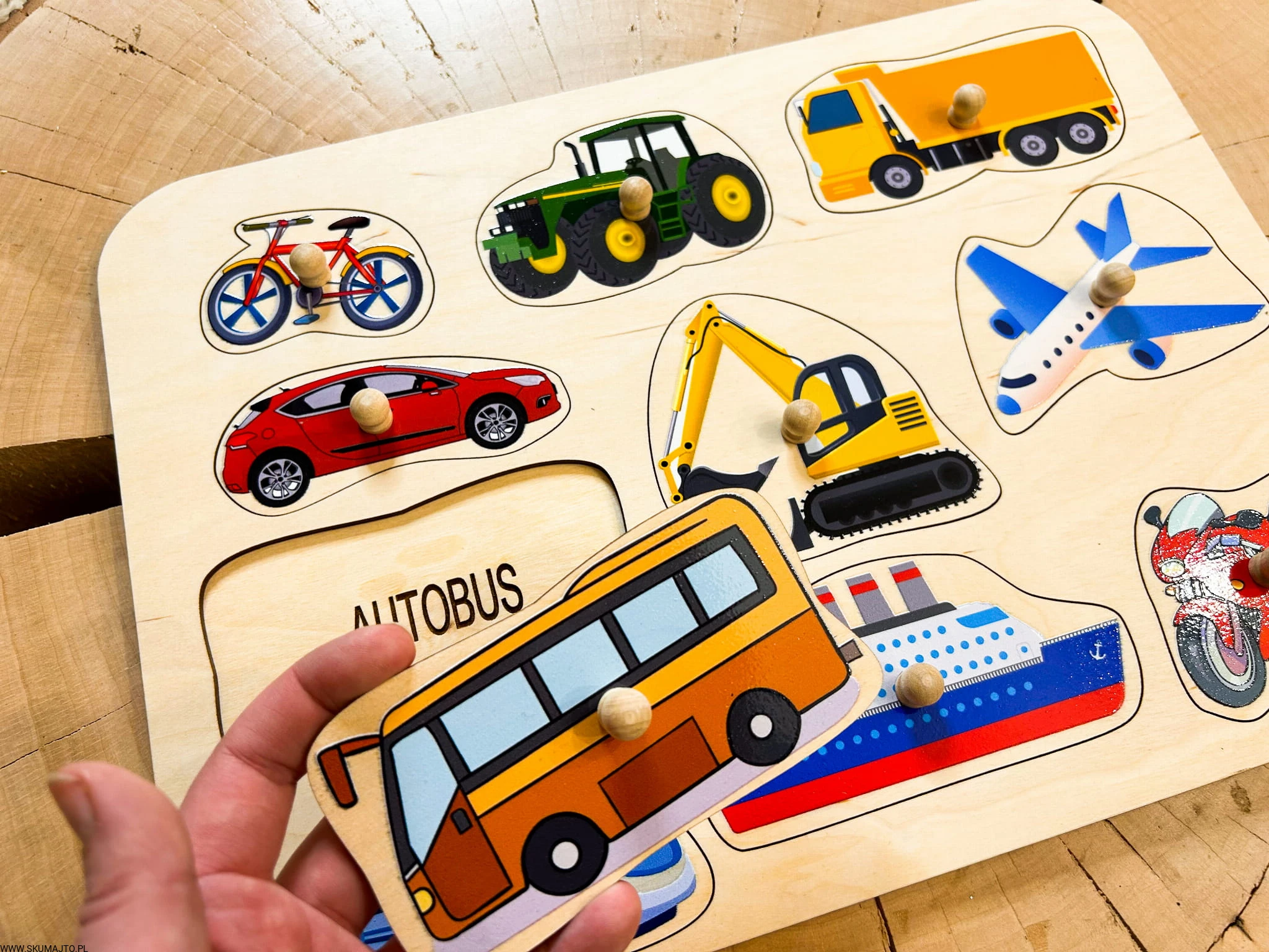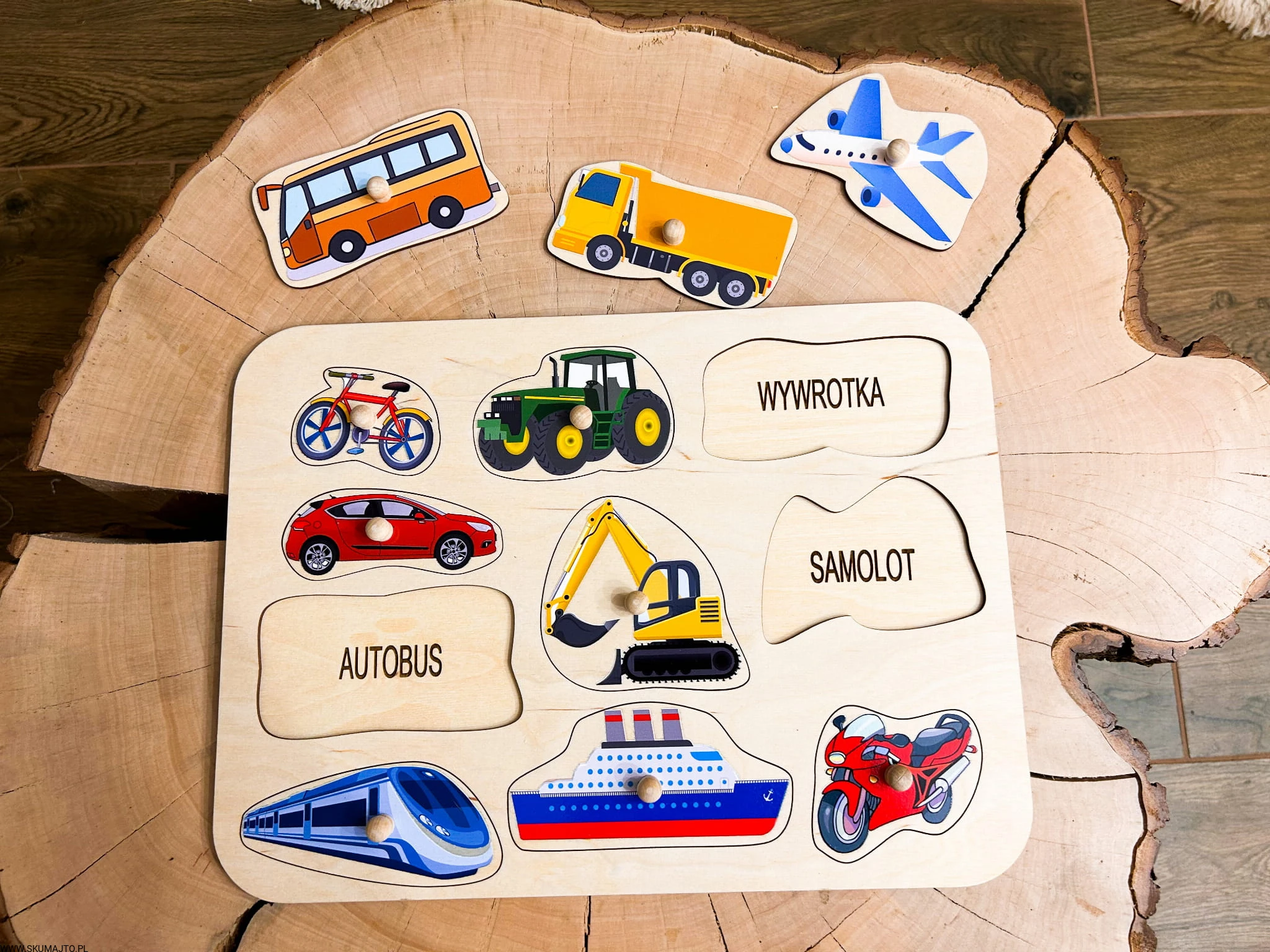 Pojazdy , drewniane puzzle z uchwytami i podpisami, pierwsze puzzle