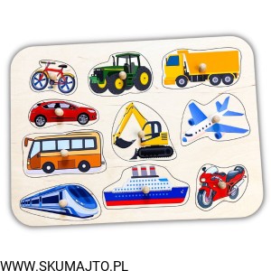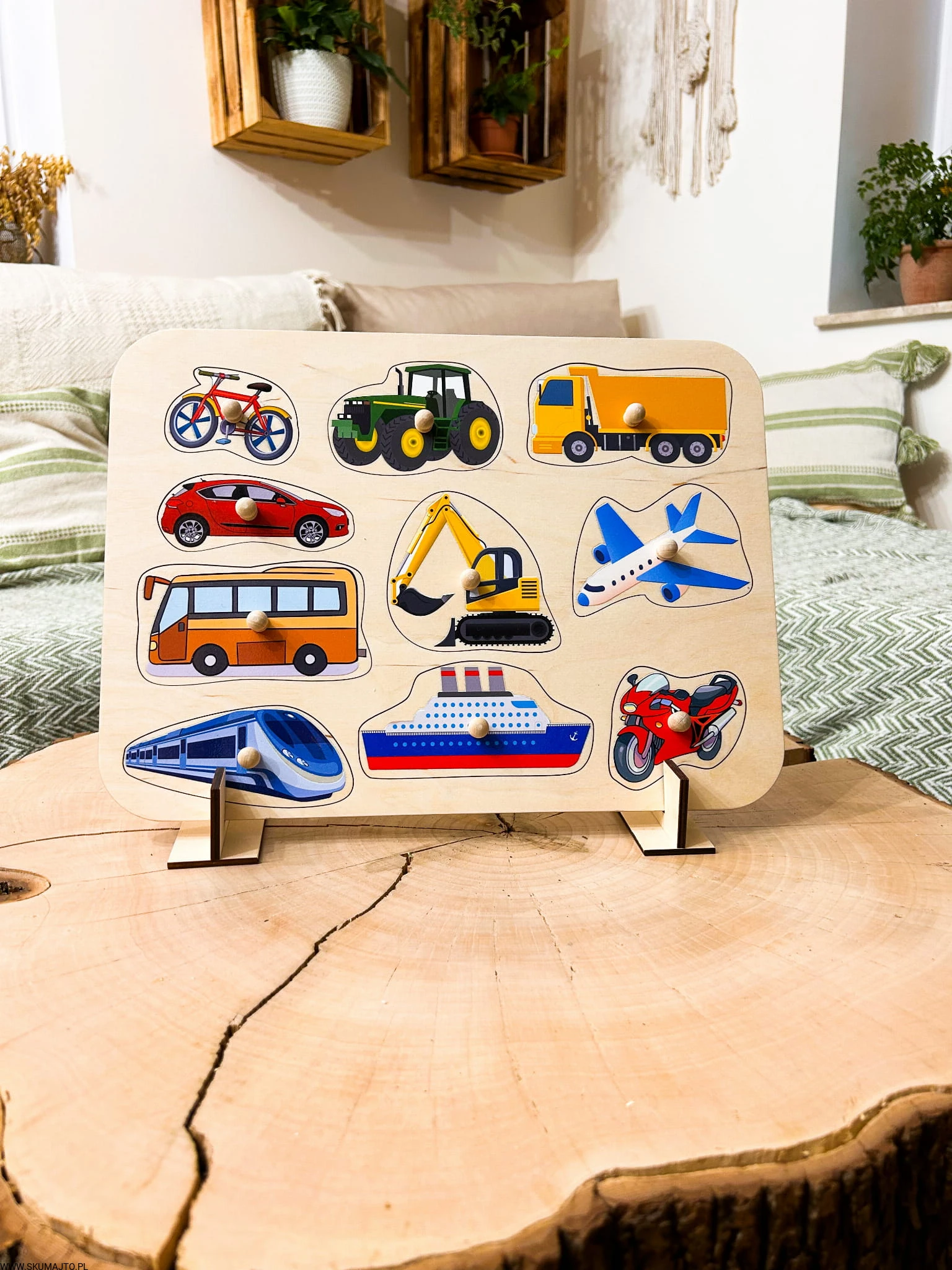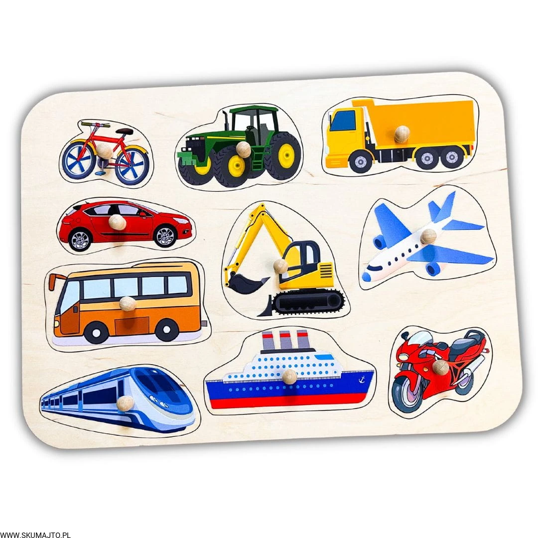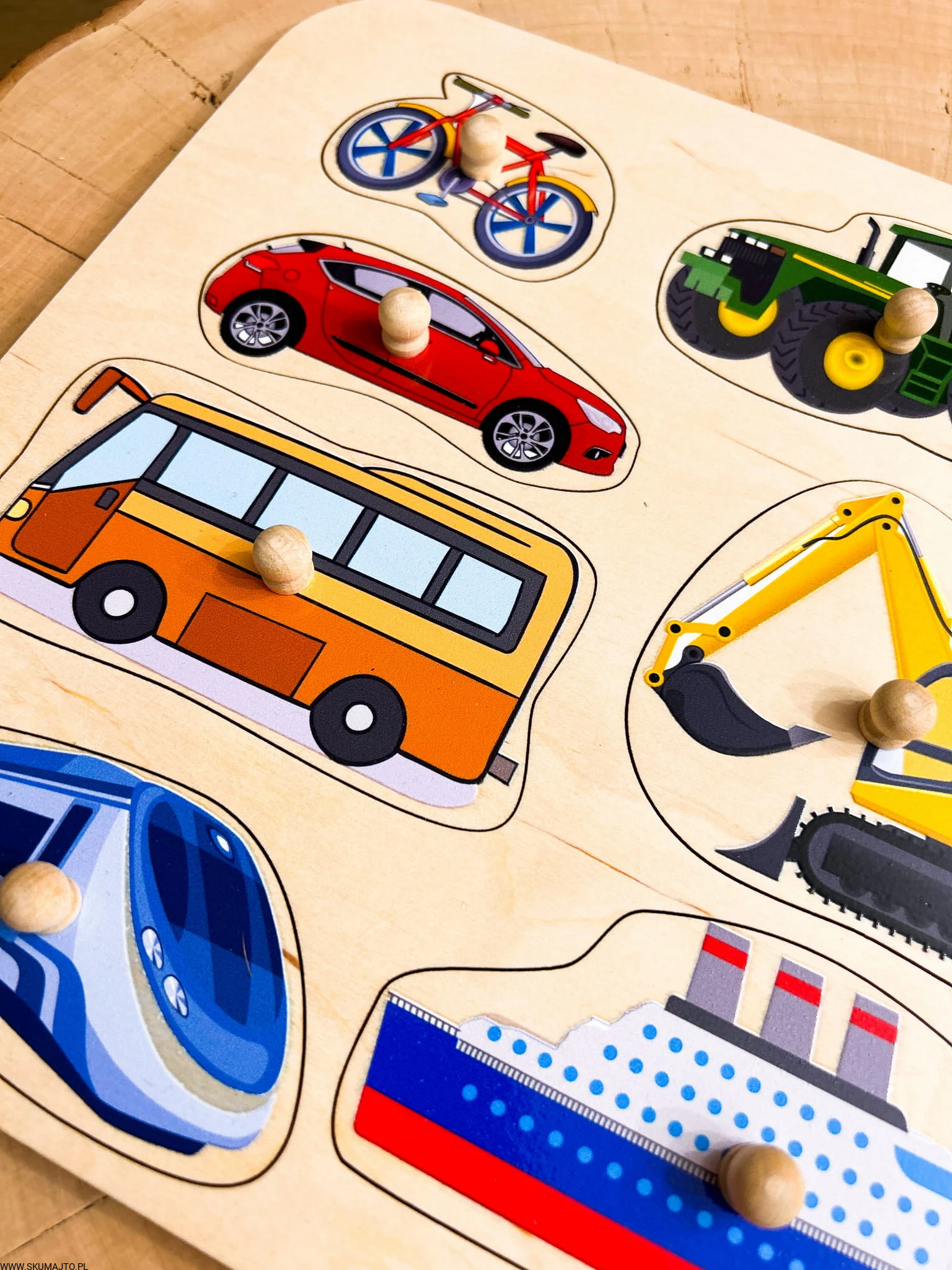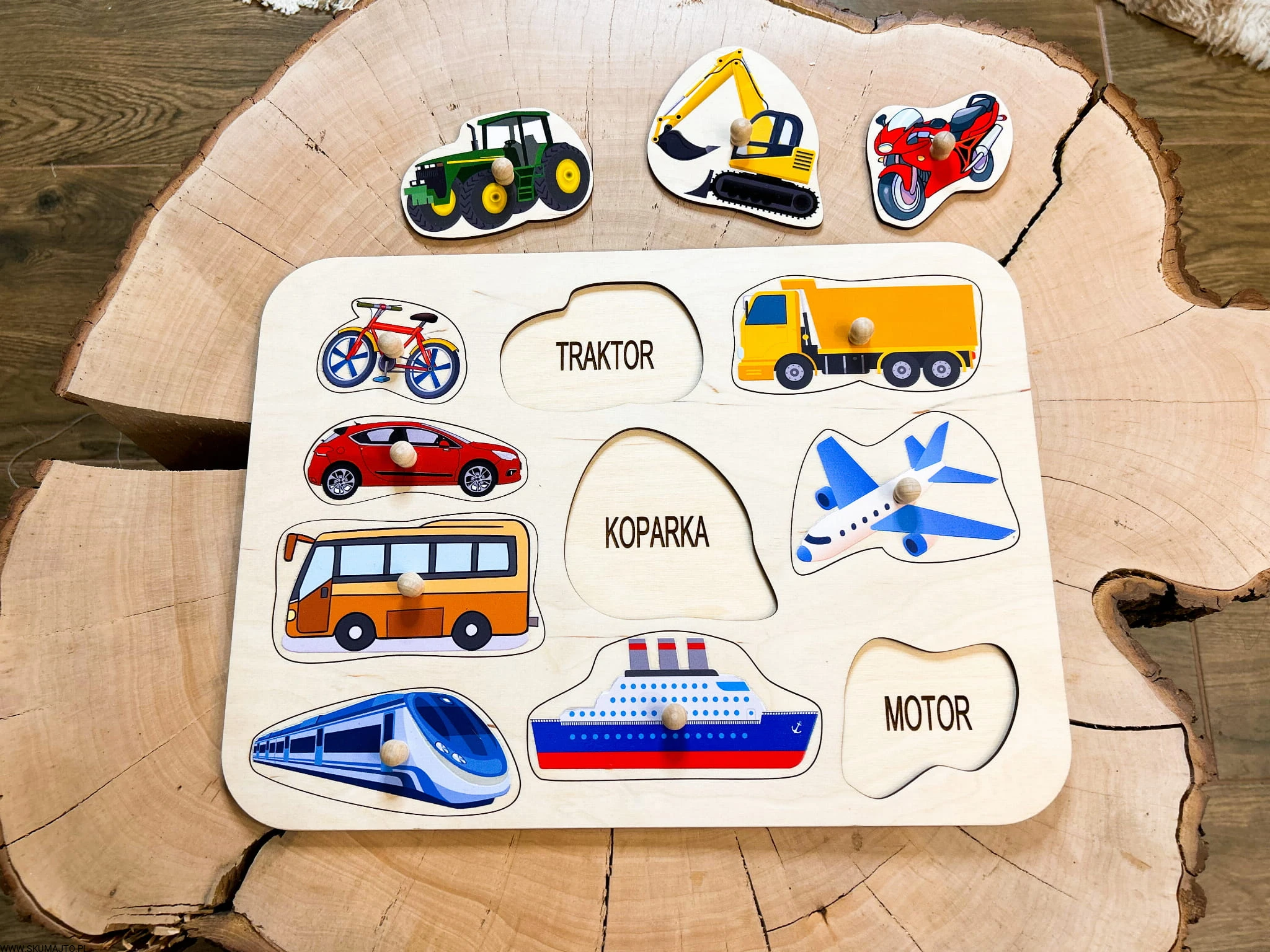 Pojazdy , drewniane puzzle z uchwytami i podpisami, pierwsze puzzle