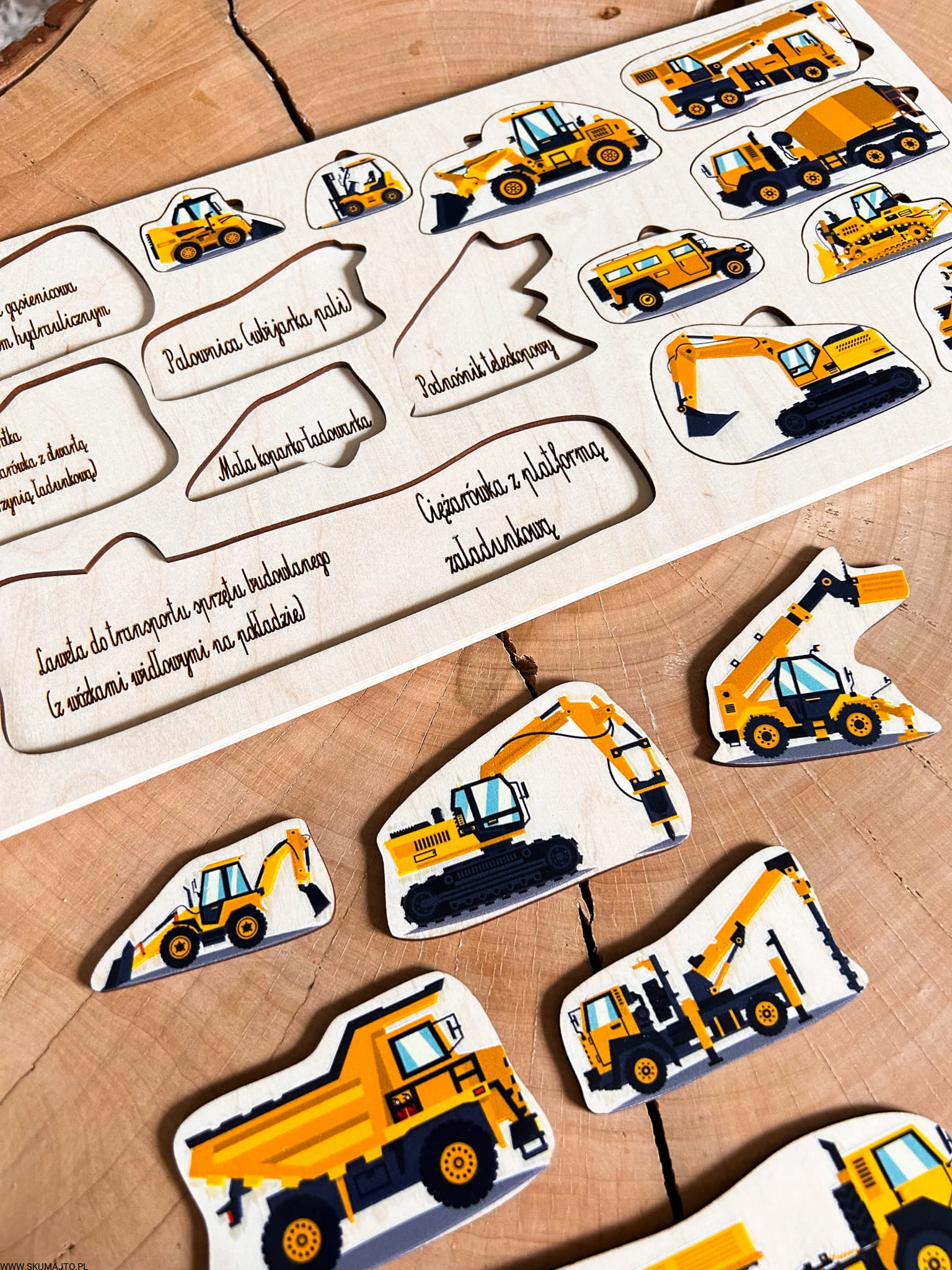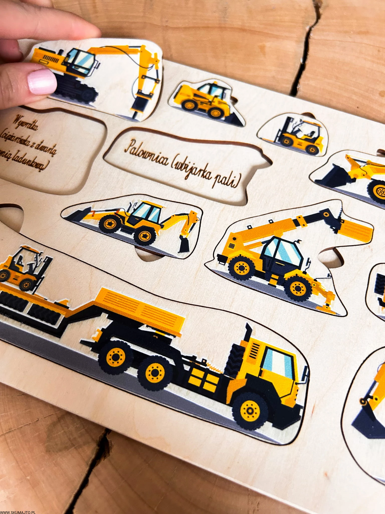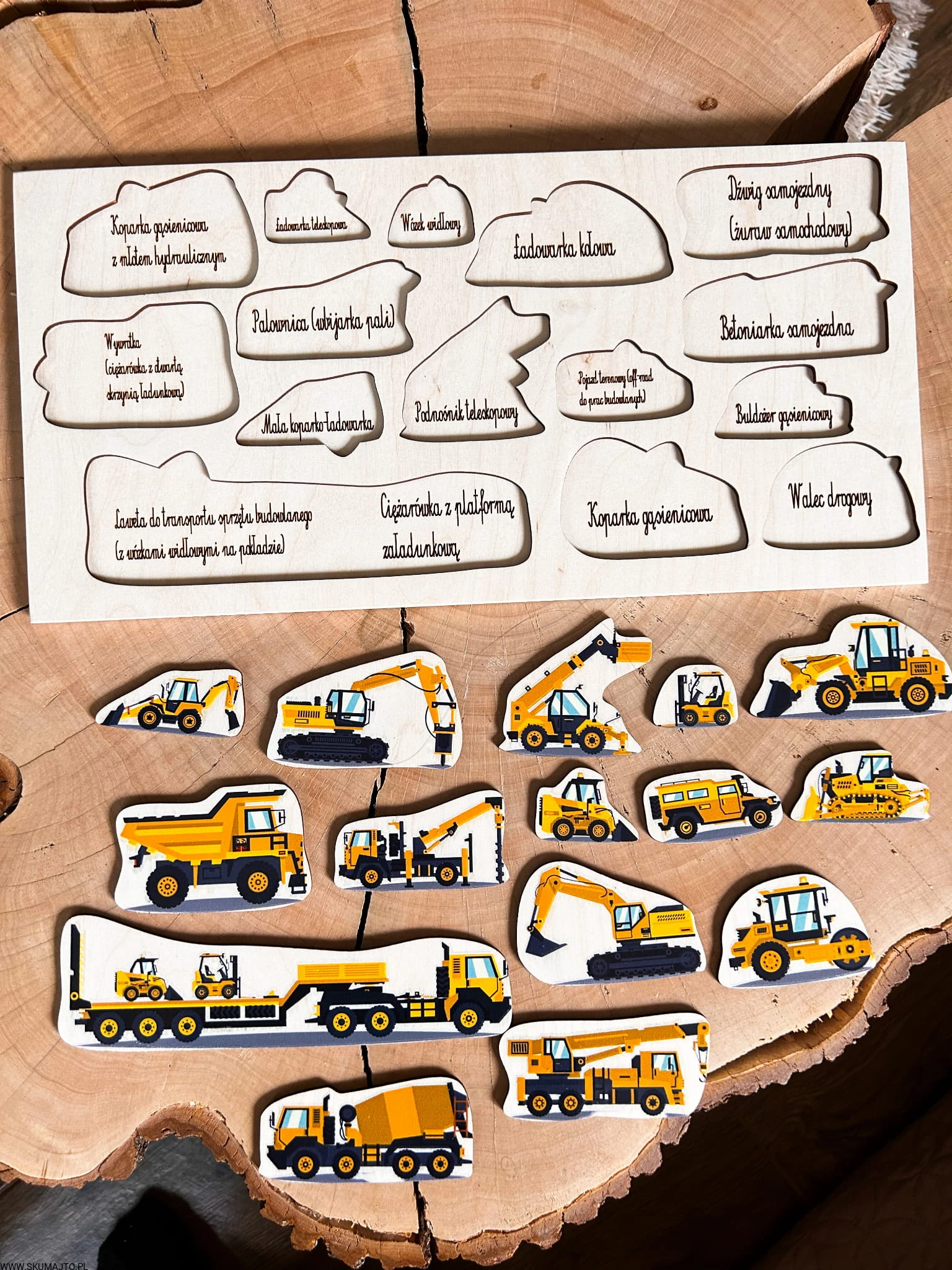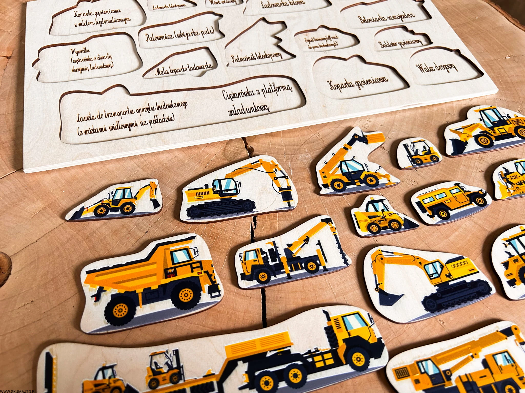 Fascynujący świat maszyn budowlanych teraz na wyciągnięcie ręki! Ta wyjątkowa drewniana układanka to prawdziwa gratka dla małych miłośników koparek, dźwigów i wywrotek. Dzięki niej dziecko nie tylko pozna różne pojazdy budowlane, ale także dowie się, do czego służą i jakie mają funkcje.