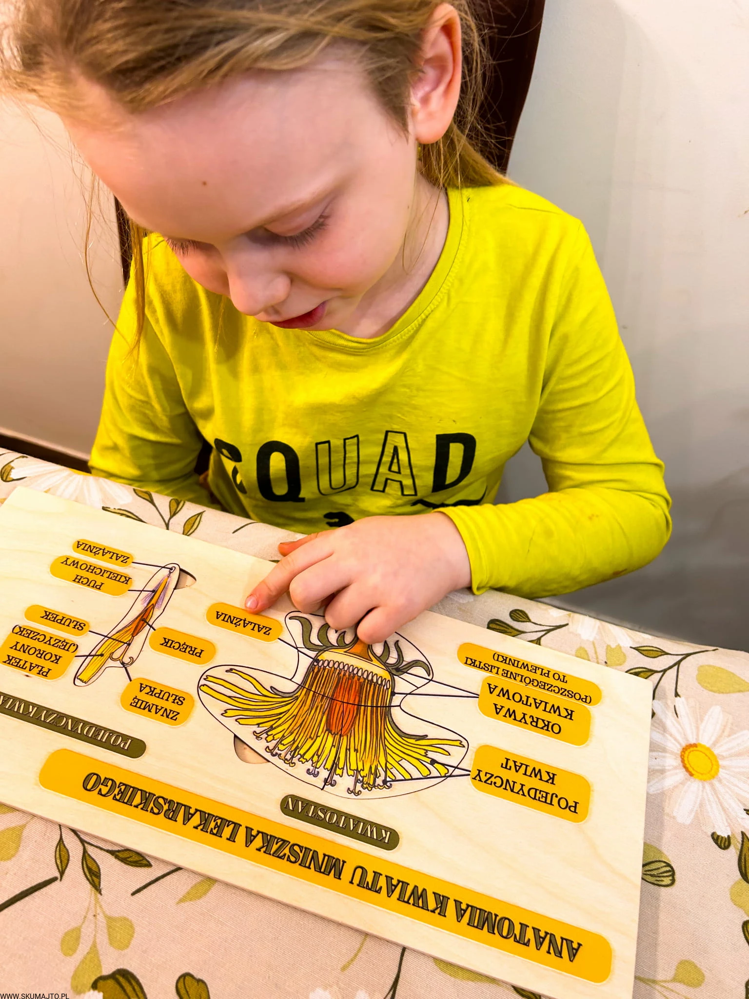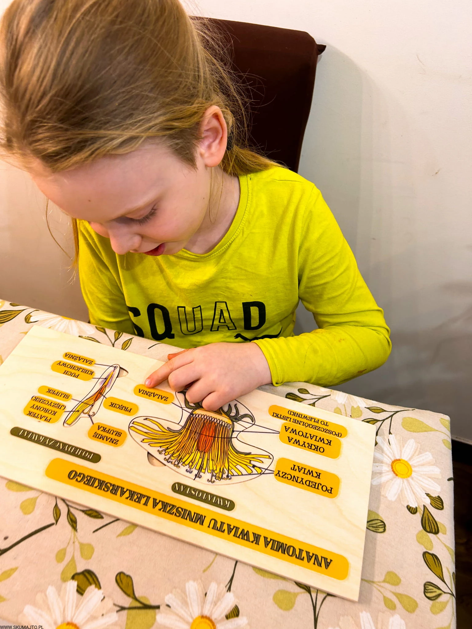 Zaprojektowana z dbałością o detale, każda część kwiatu została starannie oznaczona i pokolorowana, by maksymalnie ułatwić identyfikację i zapamiętywanie. To idealne narzędzie do nauki przez zabawę, które wspiera koordynację ręka-oko, cierpliwość oraz logiczne myślenie. Niech każde dziecko odkryje przyjemność z nauki anatomii roślin, a przy tym rozwija swoją motorykę i zdolności poznawcze.