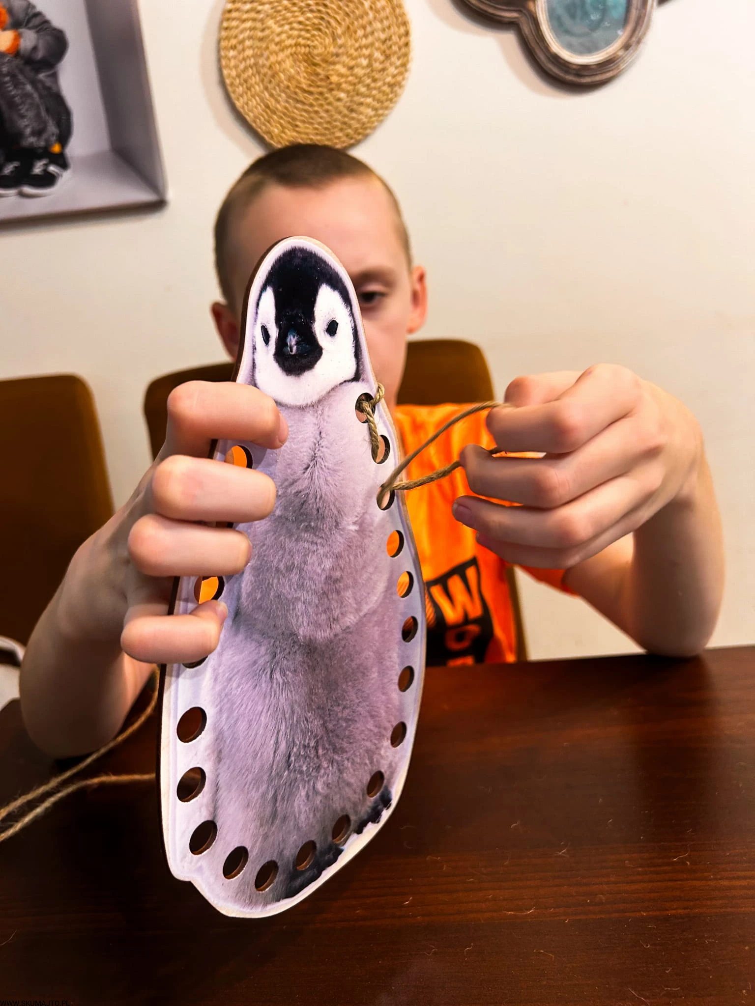 Wyobraź sobie, jak Twoje dziecko z radością siada przy stole z pingwinkiem w rękach. Na początku może być nieco nieporadne – sznurek nie chce przejść przez otwór, a rączki próbują znaleźć odpowiedni sposób, by poradzić sobie z zadaniem. Z czasem jednak ruchy stają się pewniejsze, sznurek zaczyna płynnie przechodzić przez kolejne dziurki, a na twarzy dziecka pojawia się duma. Pingwinek ożywa pod jego palcami, a każda chwila z przeplatanką to krok w kierunku nowych umiejętności.