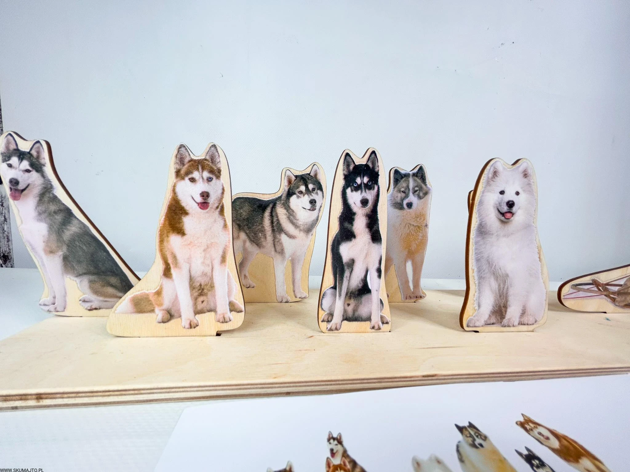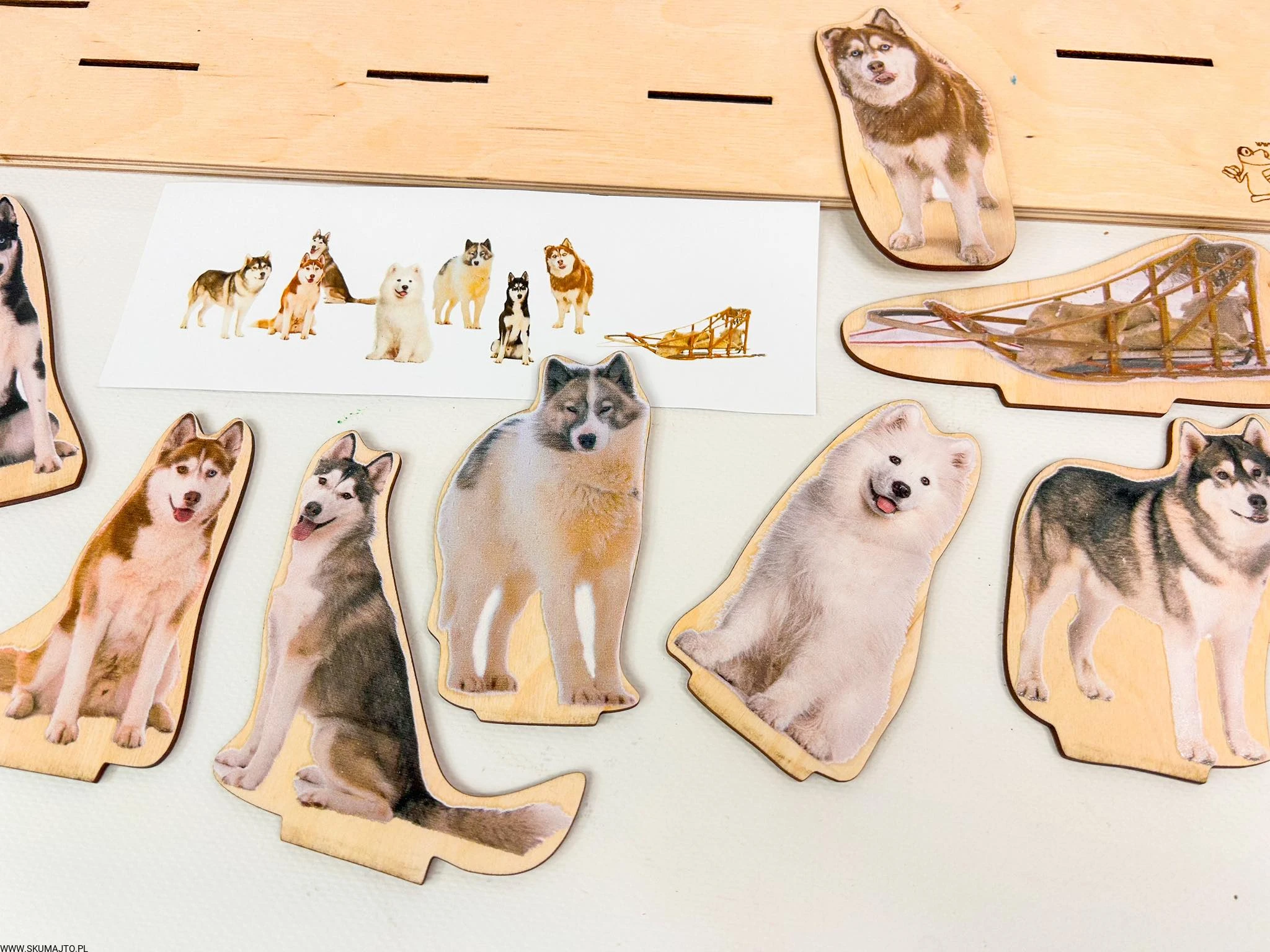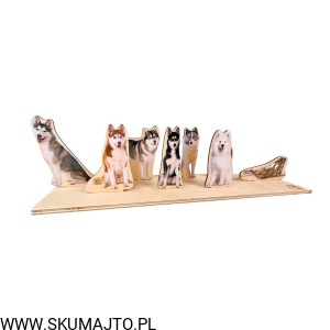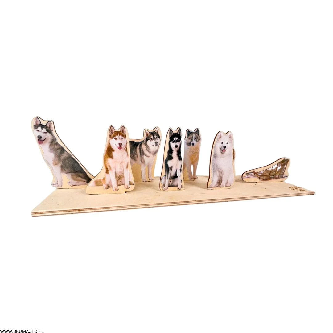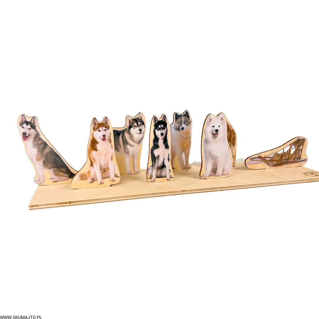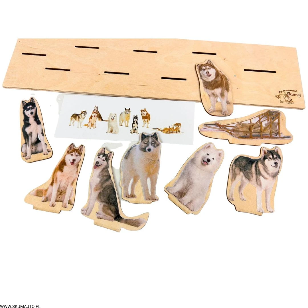Psi zaprzęg, drewniana układanka do odwzorowywania, makieta sań i psów