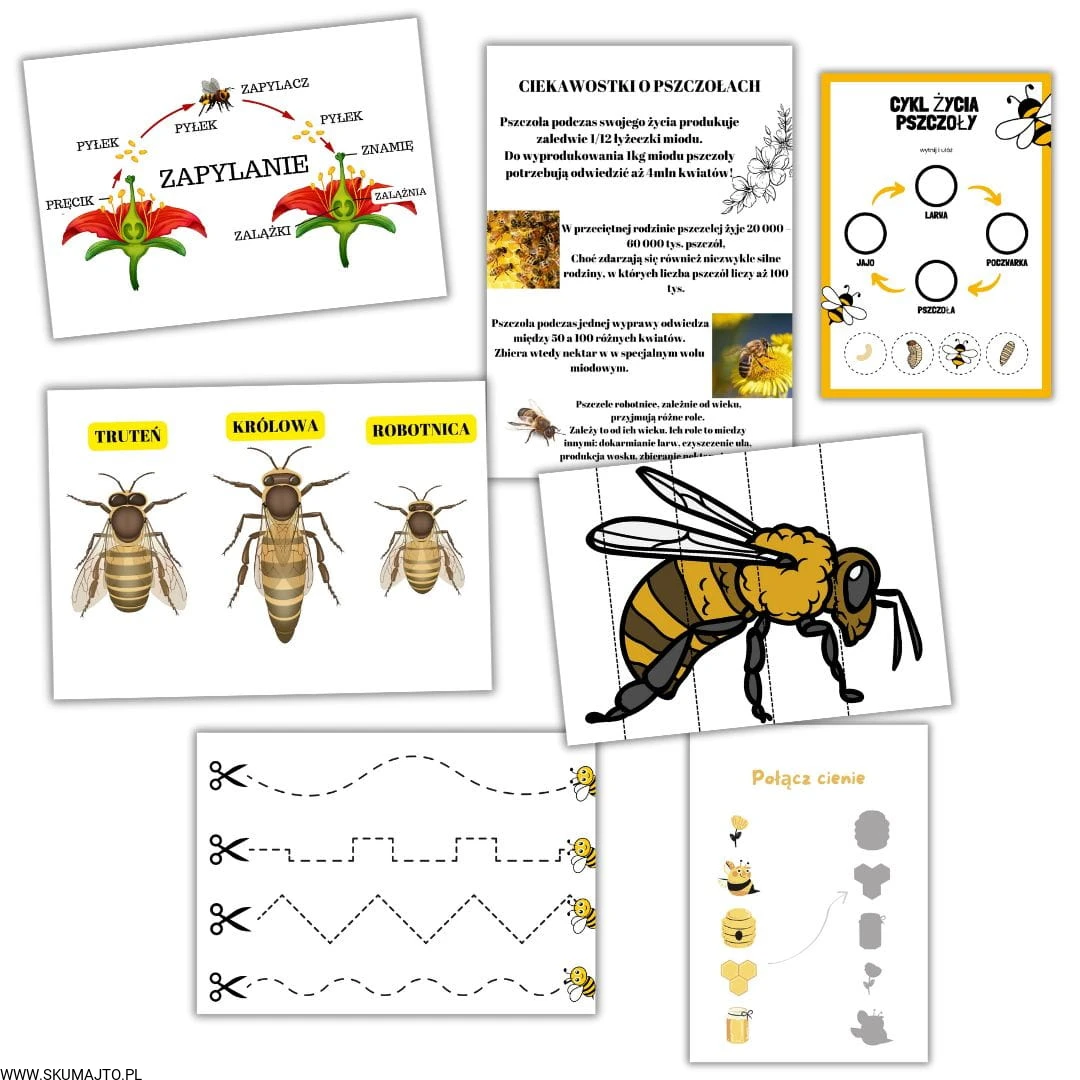 W zestawie znajdziesz karty z ciekawostkami o pszczołach, cyklem rozwojowym, przebiegiem zapylania, mieszkańcami ula oraz zadaniami dla dzieci - labirynty, wycinanki, cienie. 11 kart w wersji PDF.