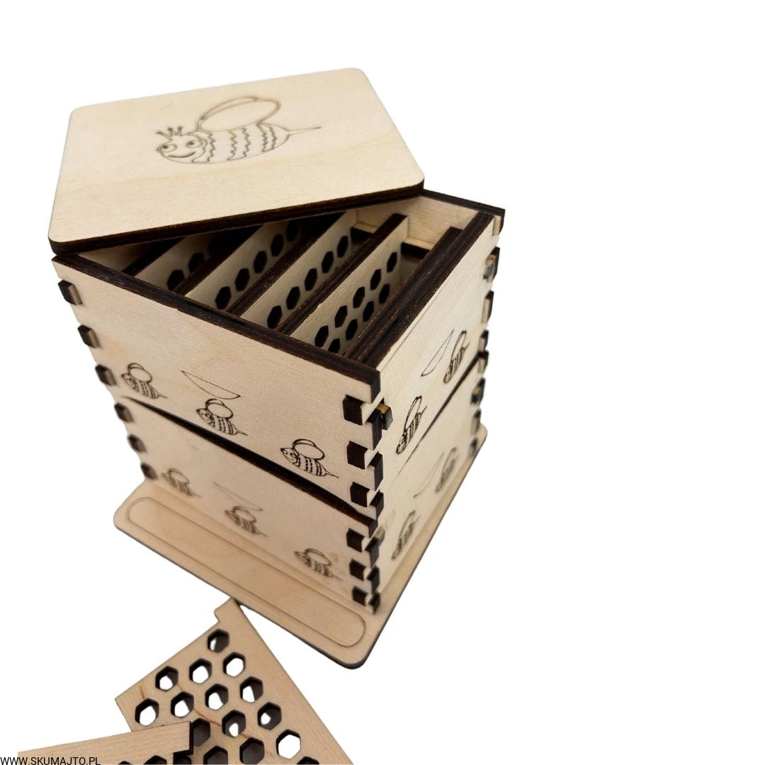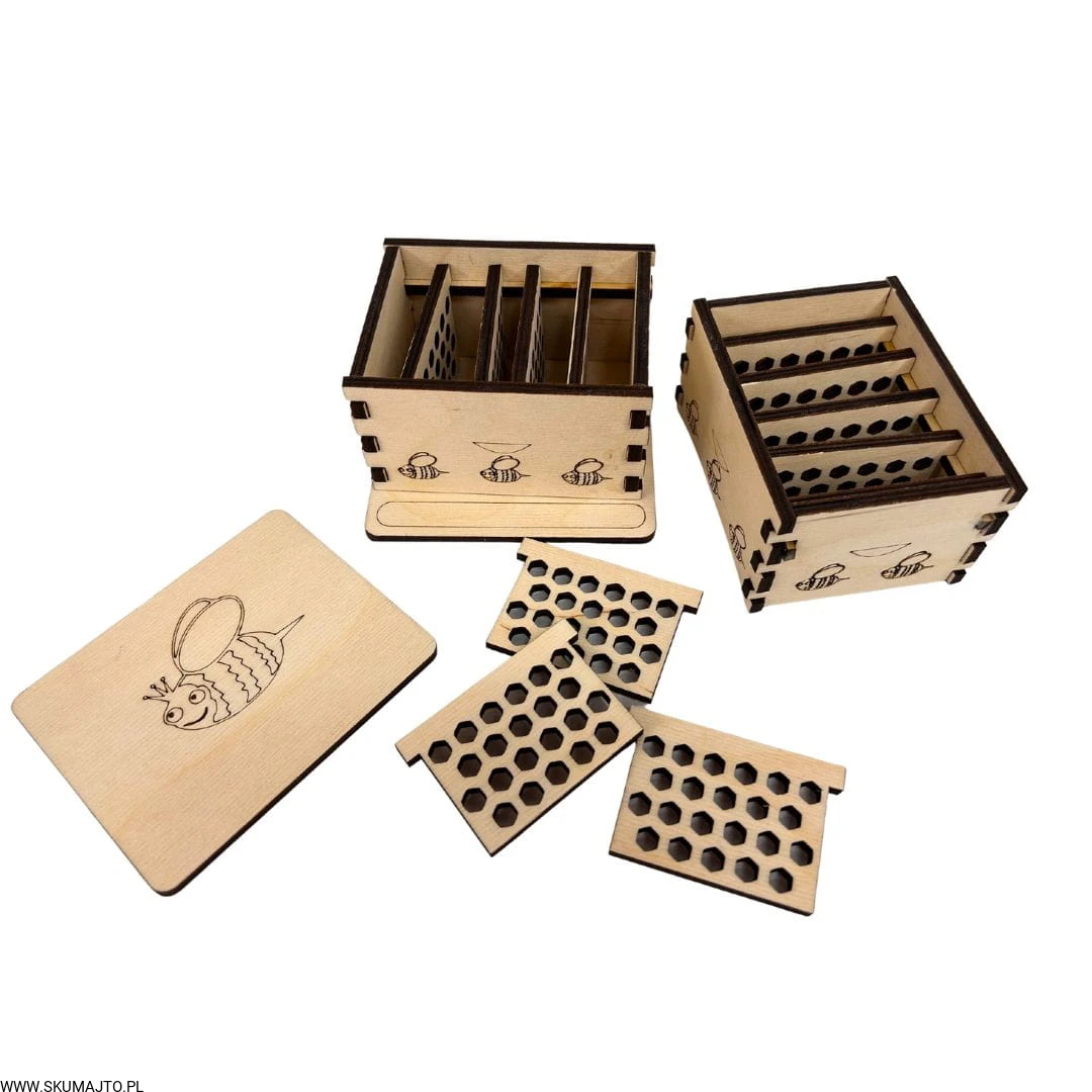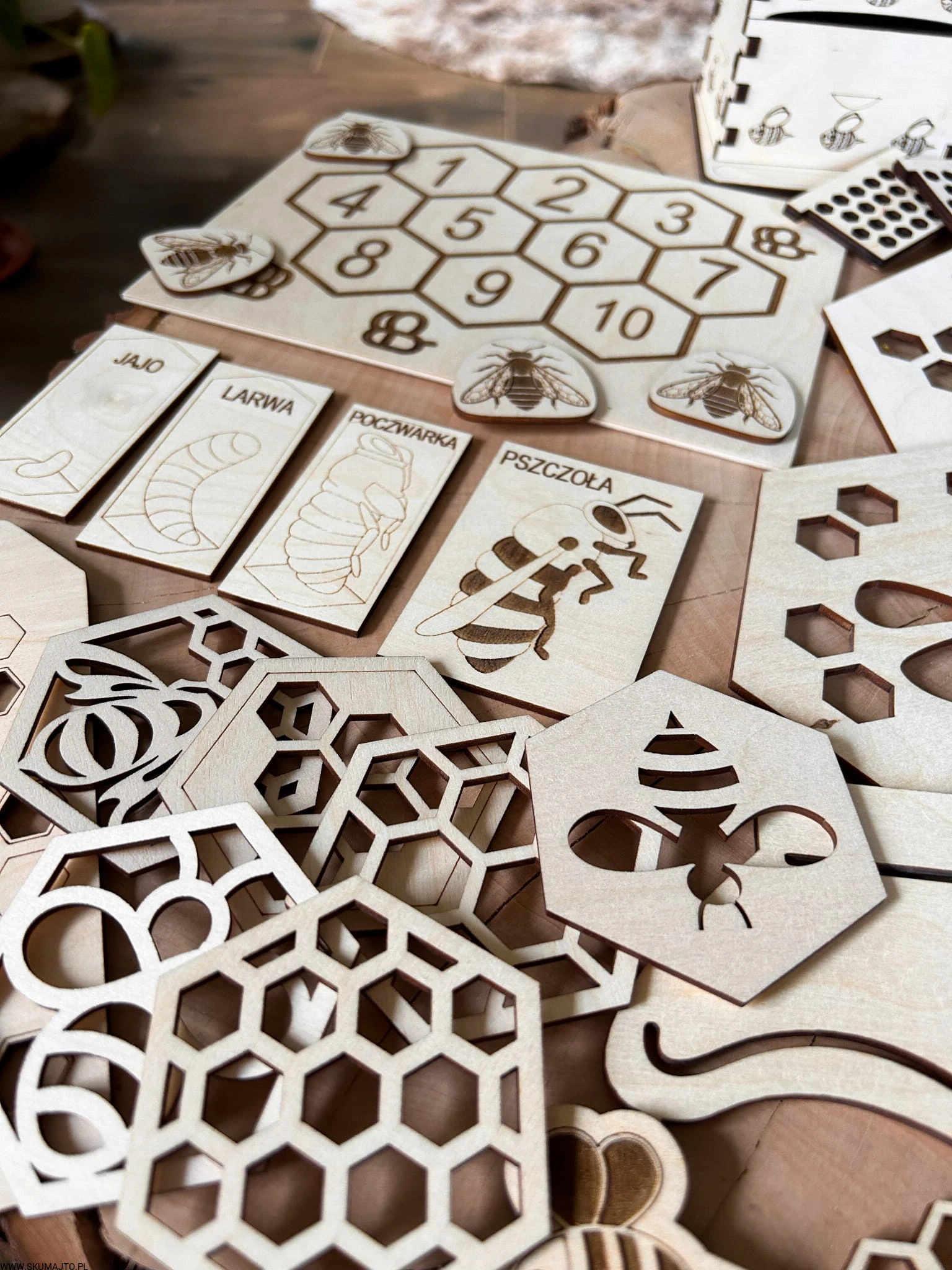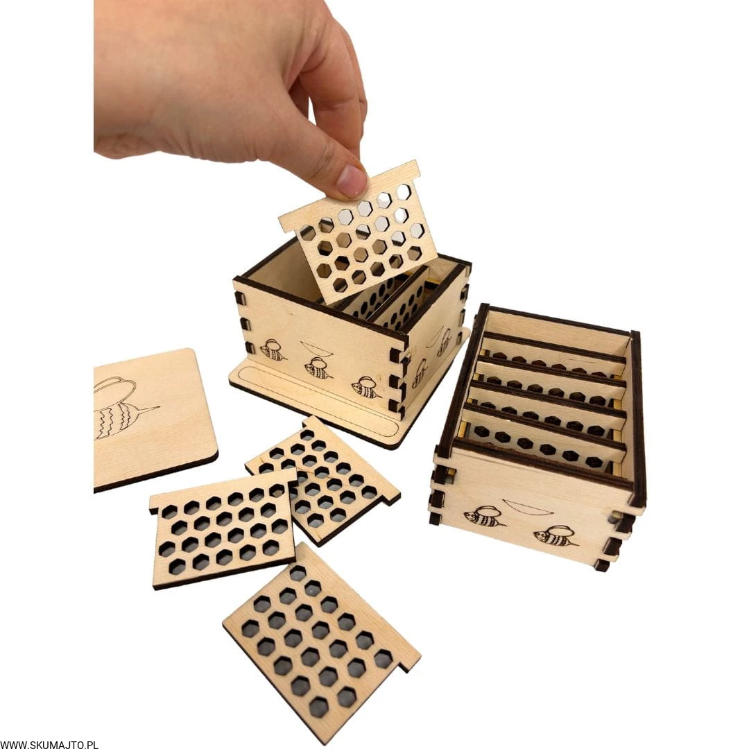 - Ul - replika ula: Składa się z dwóch skrzyneczek z plastrami miodu, podkładką i wieczkiem (20x10 cm). Ruchome elementy ula trenują małą motorykę dziecka i uczą precyzji.