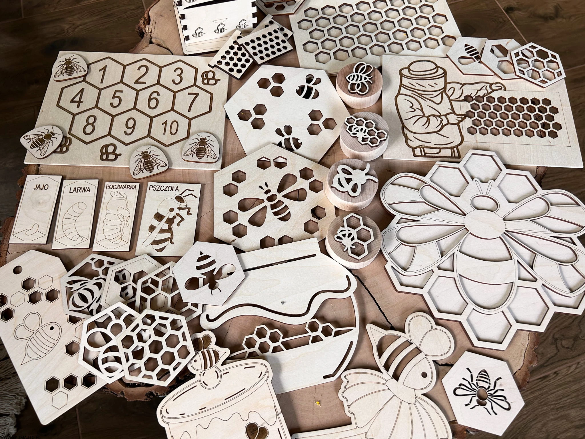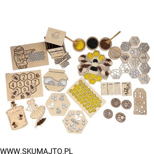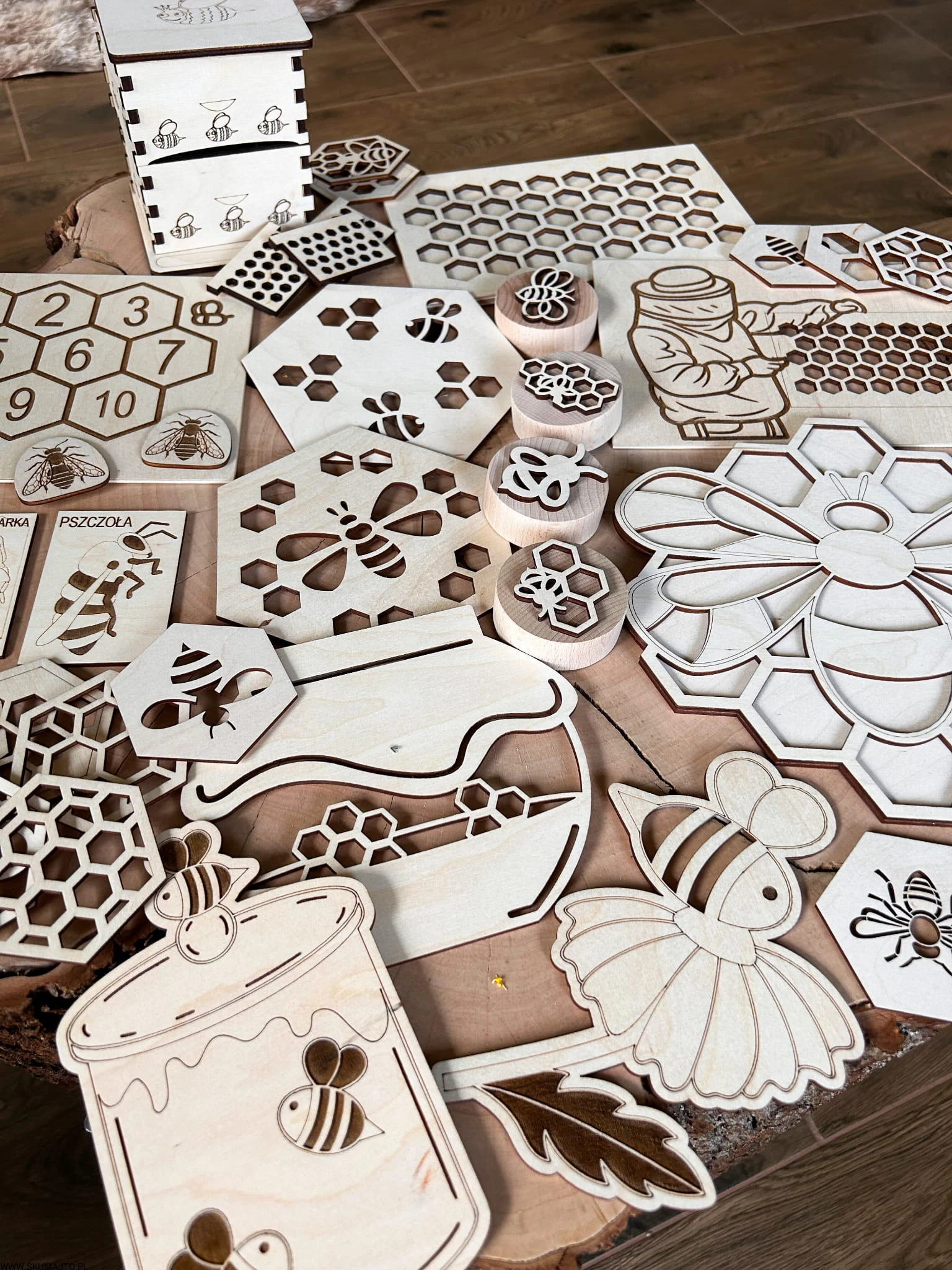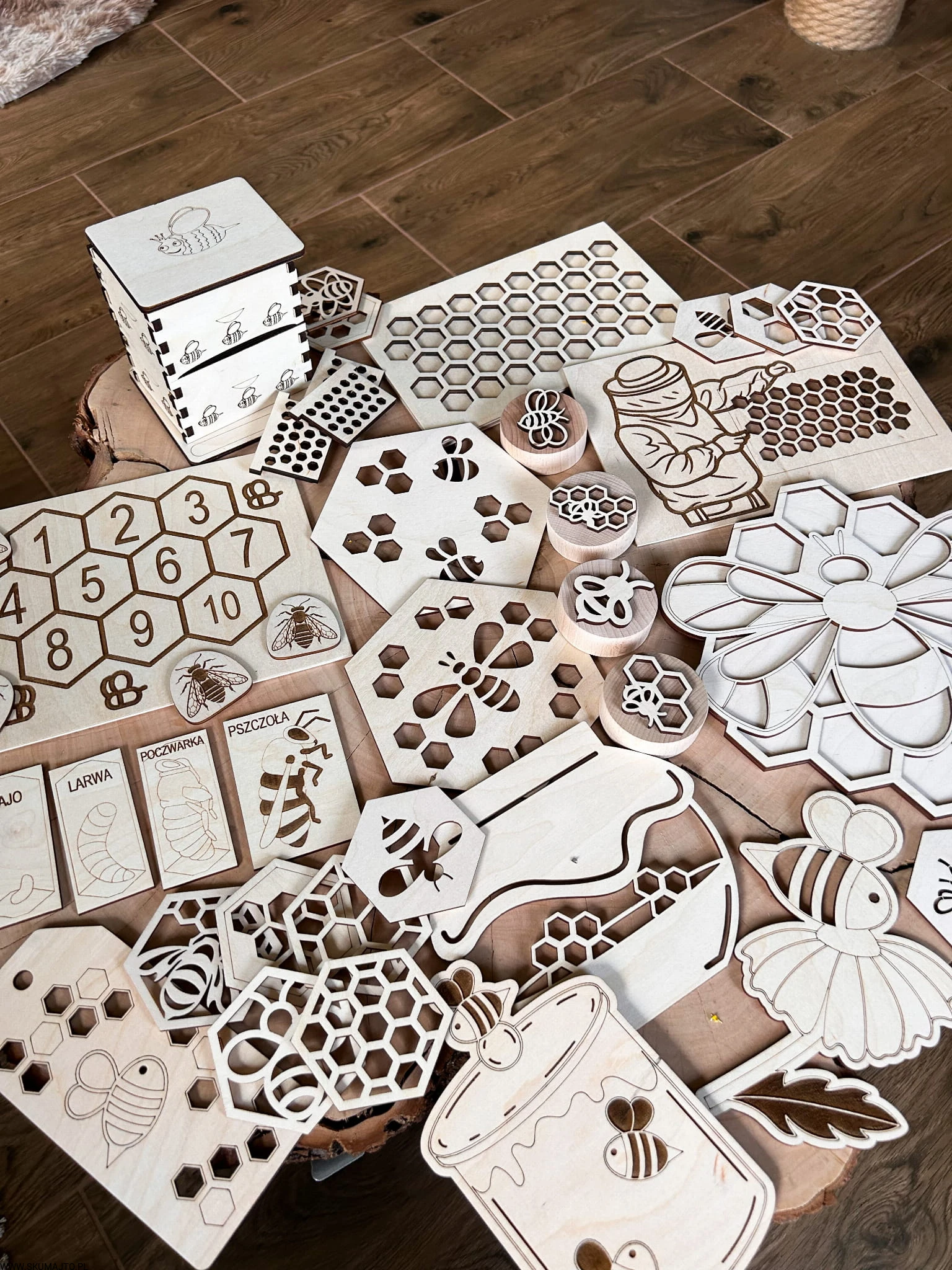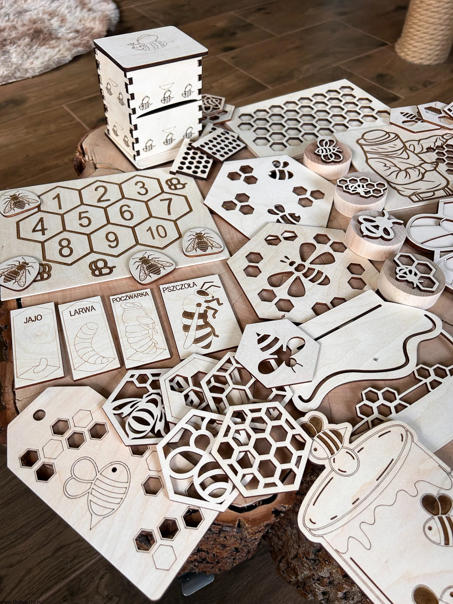 - Ul - replika ula: Składa się z dwóch skrzyneczek z plastrami miodu, podkładką i wieczkiem (20x10 cm). Ruchome elementy ula trenują małą motorykę dziecka i uczą precyzji.