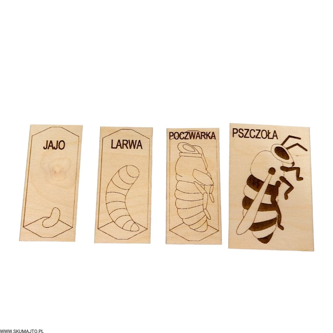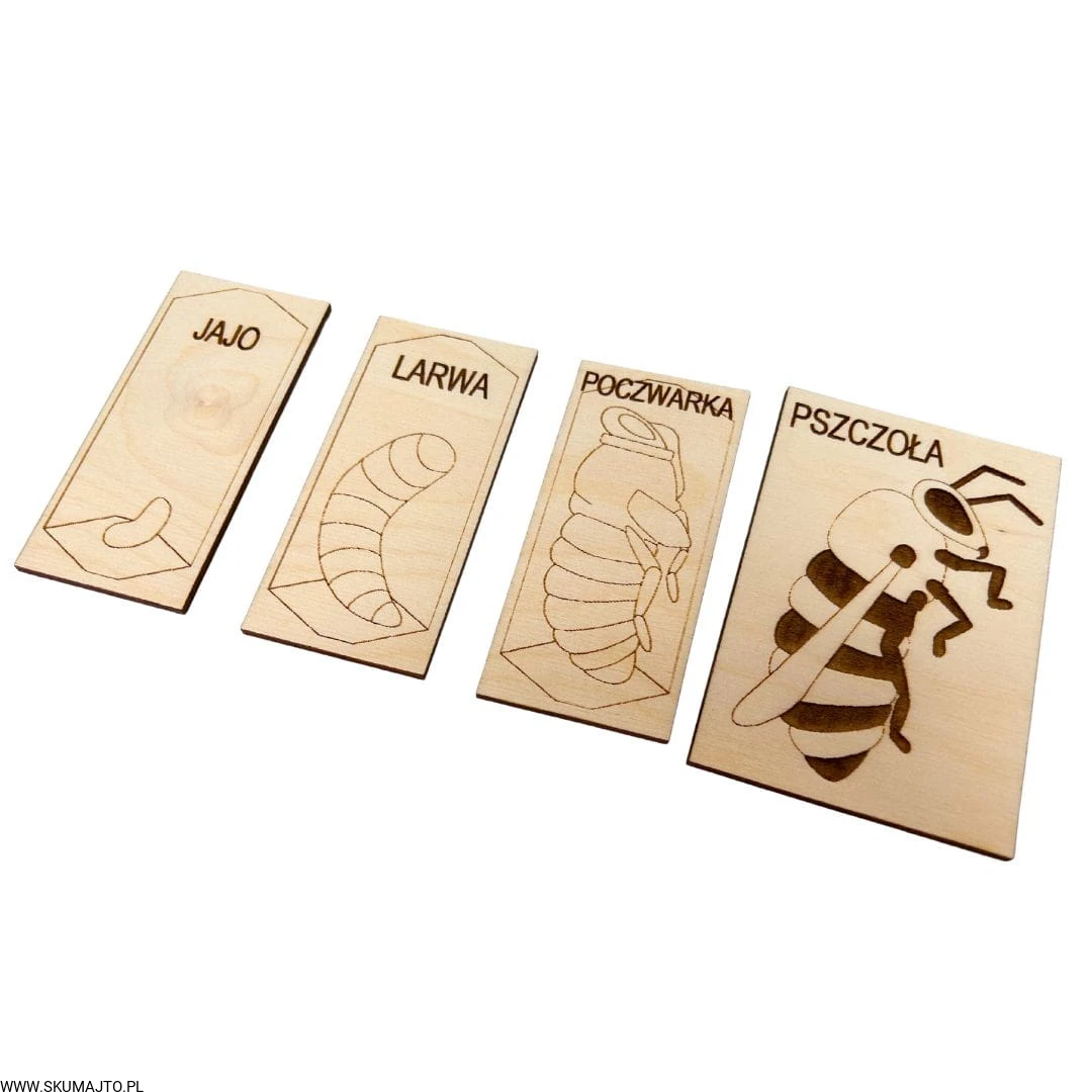 - Tabliczki z etapami rozwoju pszczoły: Przybliżają dziecku niesamowitą przemianę pszczoły od jaja do dorosłego osobnika.