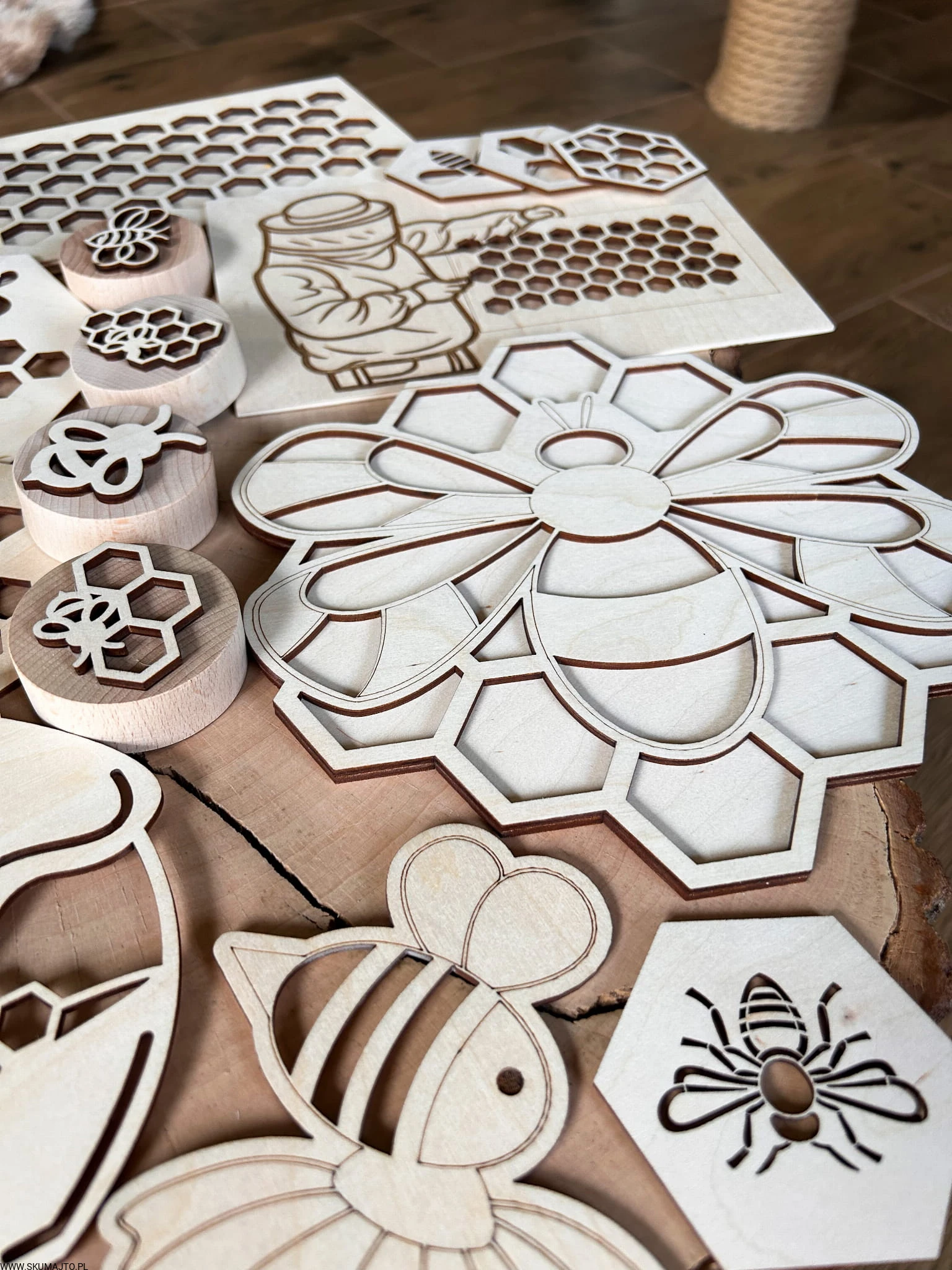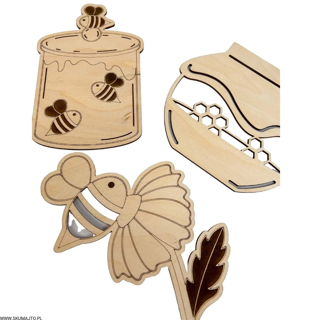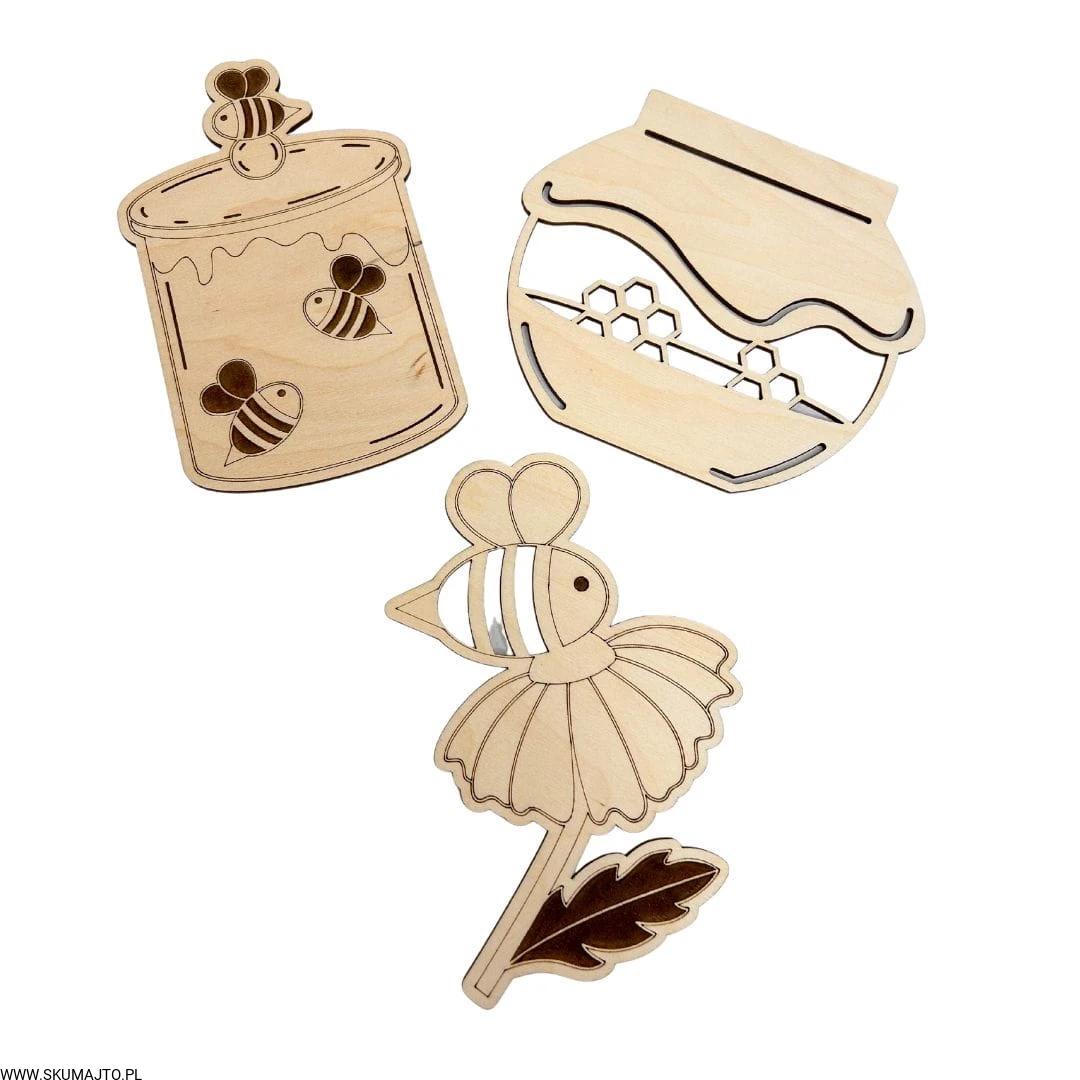 - Trzy kreatywne podstawki: Pszczoła na kwiatku i dwa słoiki miodu - idealne do twórczej zabawy.