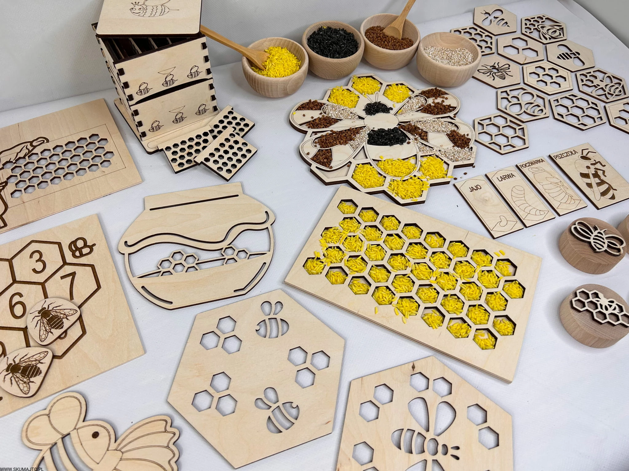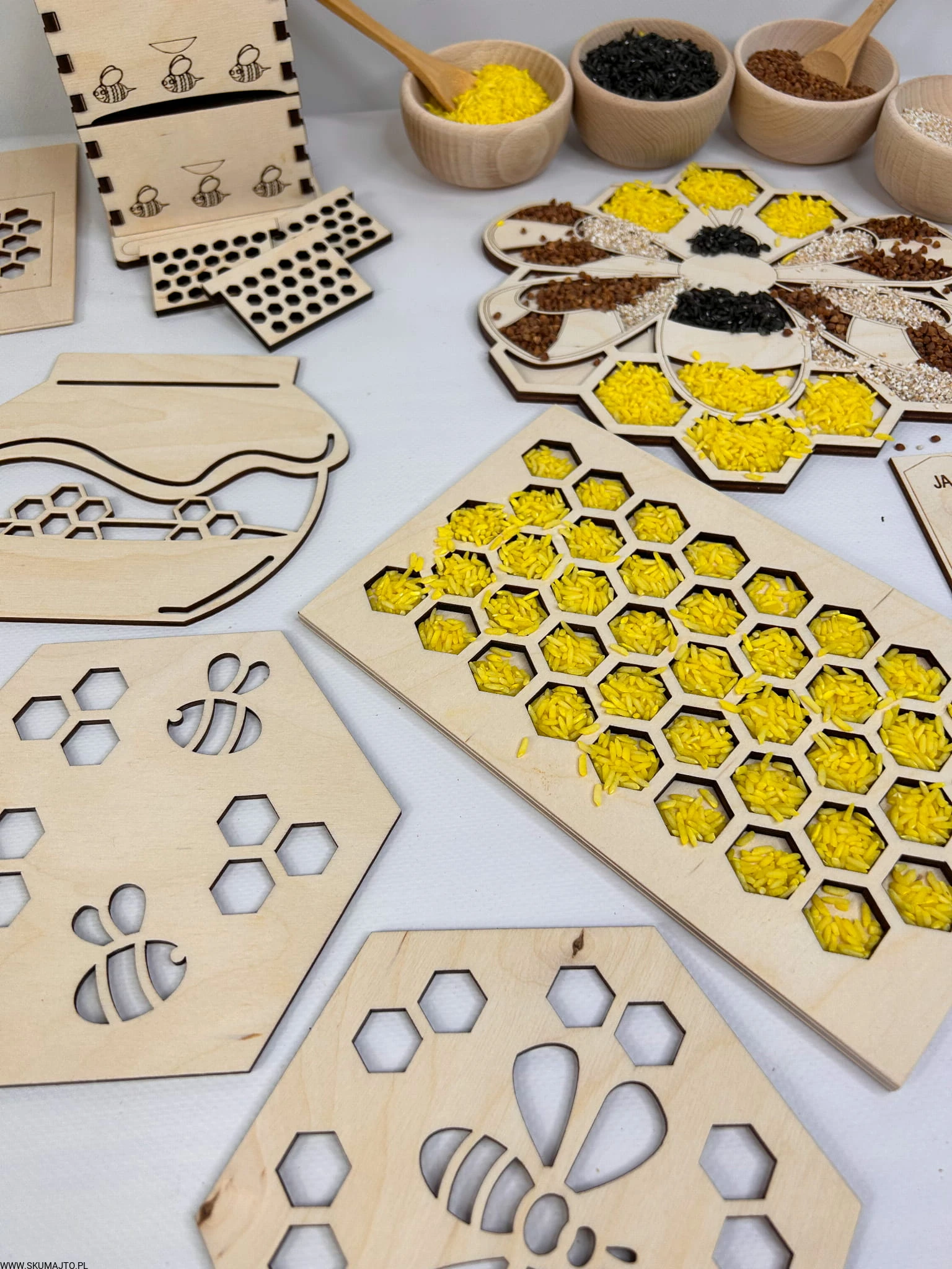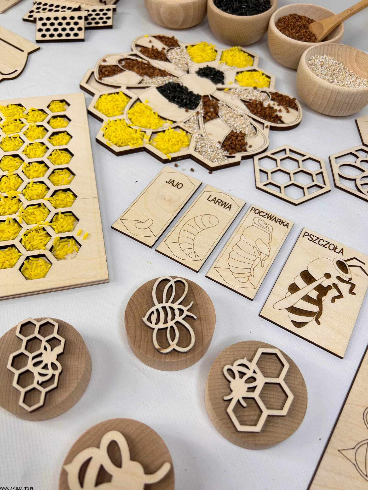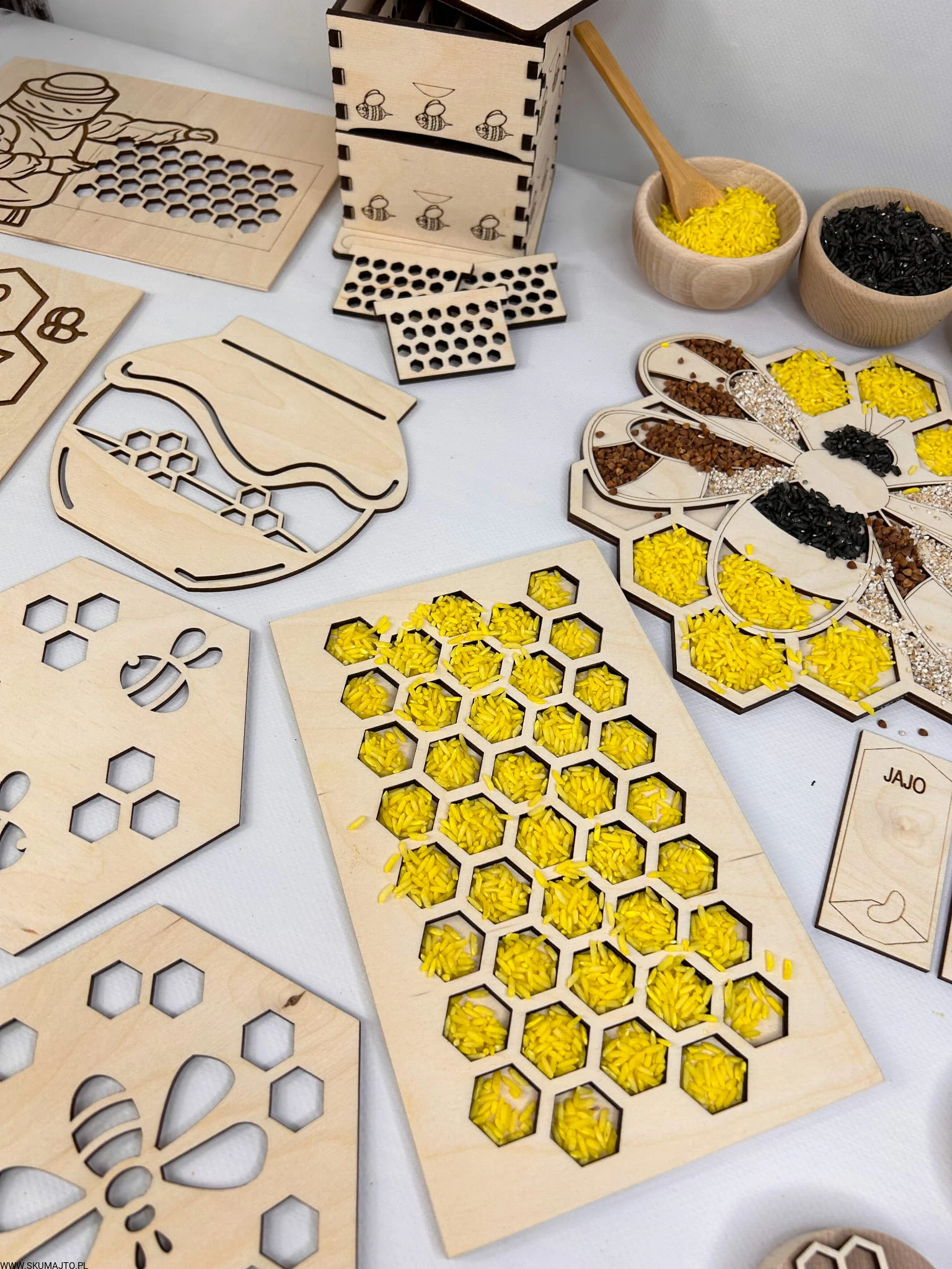 Pszczoły, drewniany zestaw kreatywny, wysypywanki, drewniane kolorowanki, budowa ula