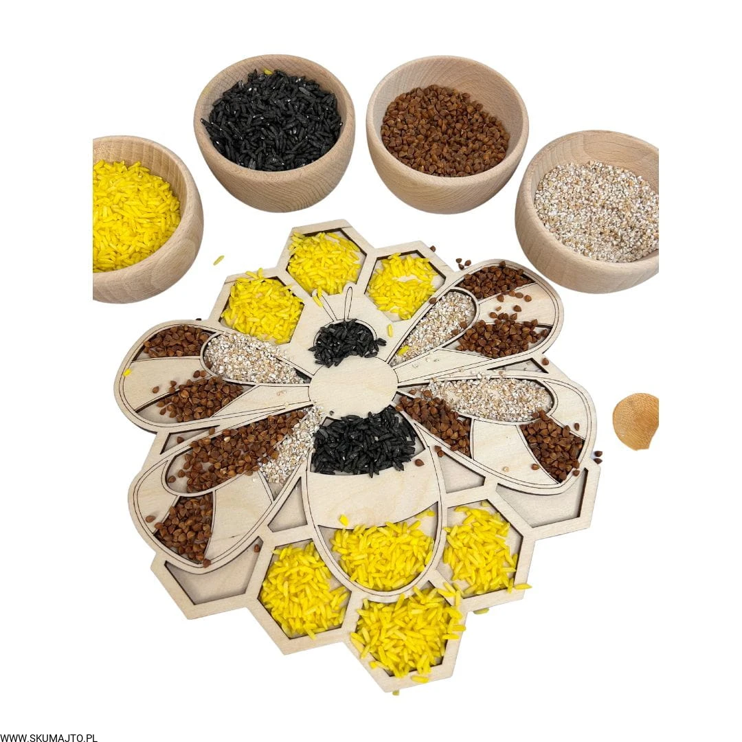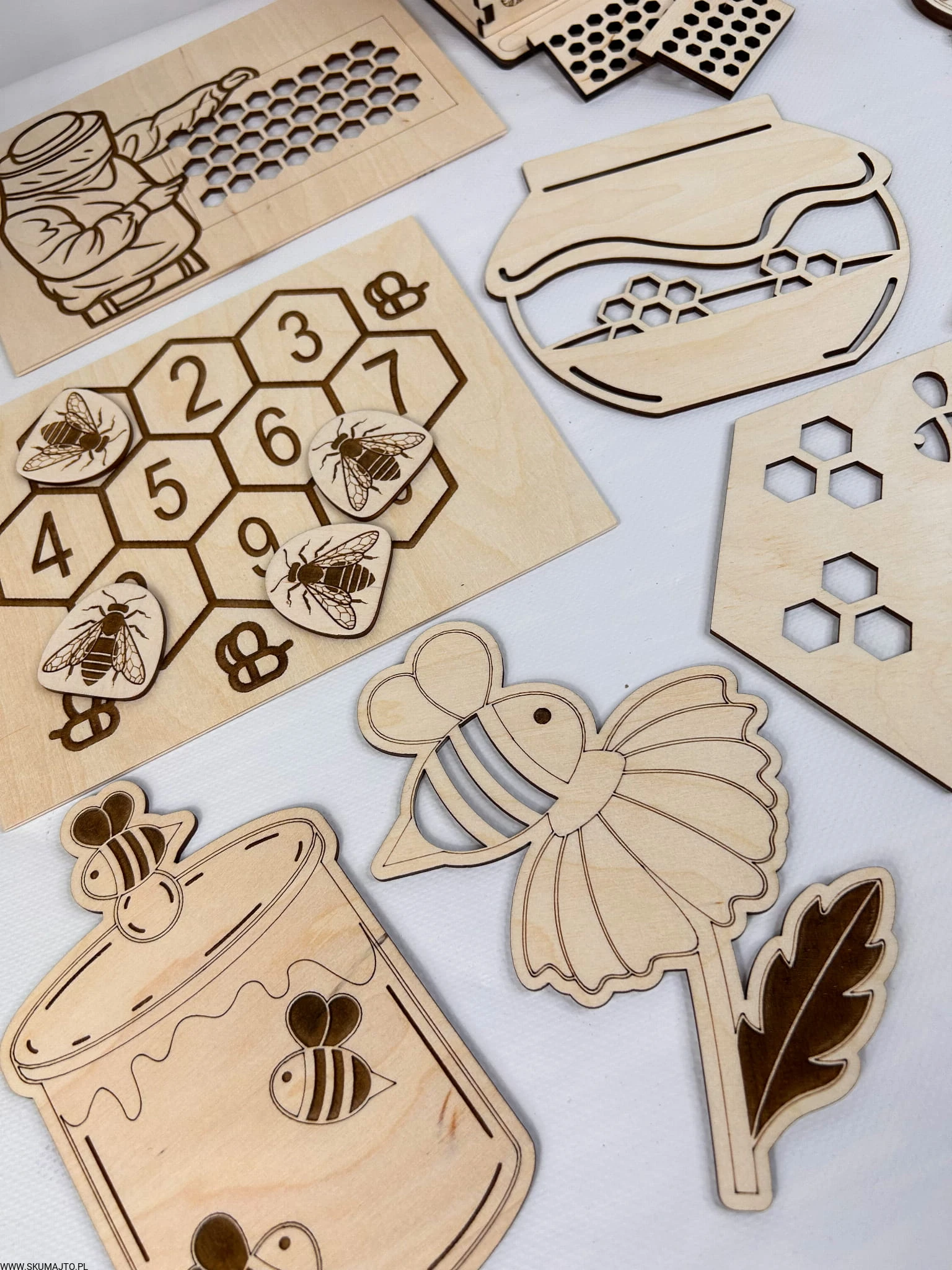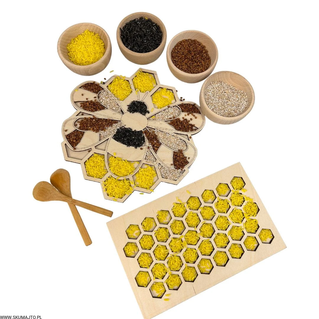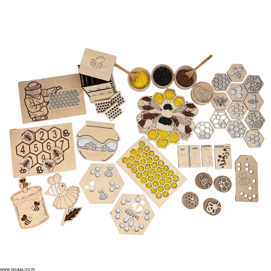 Pszczoły, drewniany zestaw kreatywny, wysypywanki, drewniane kolorowanki, budowa ula