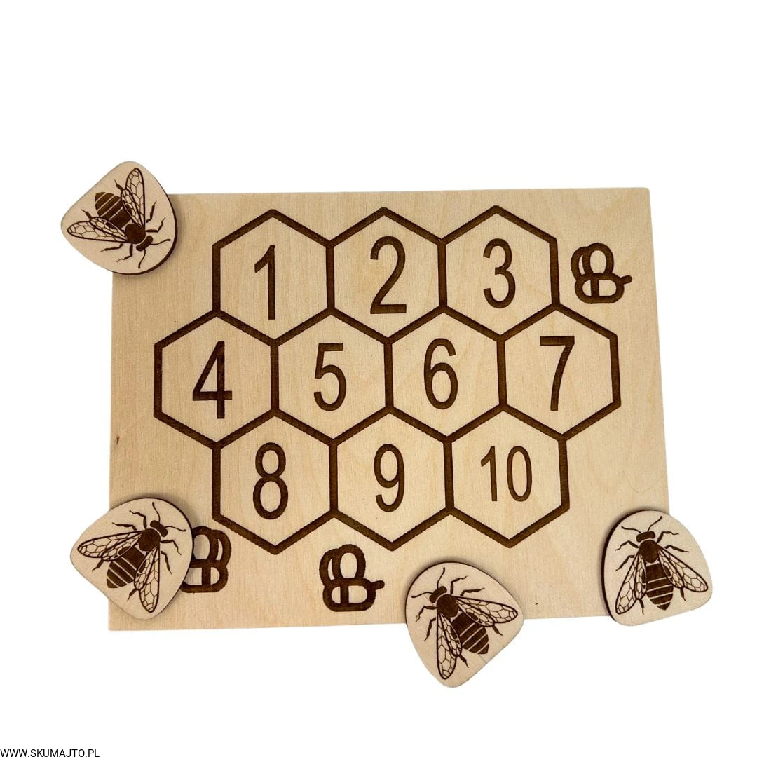 - Matematyczne pszczoły: Podstawka z liczbami do 10 i 10 pszczółek do trenowania przeliczania.