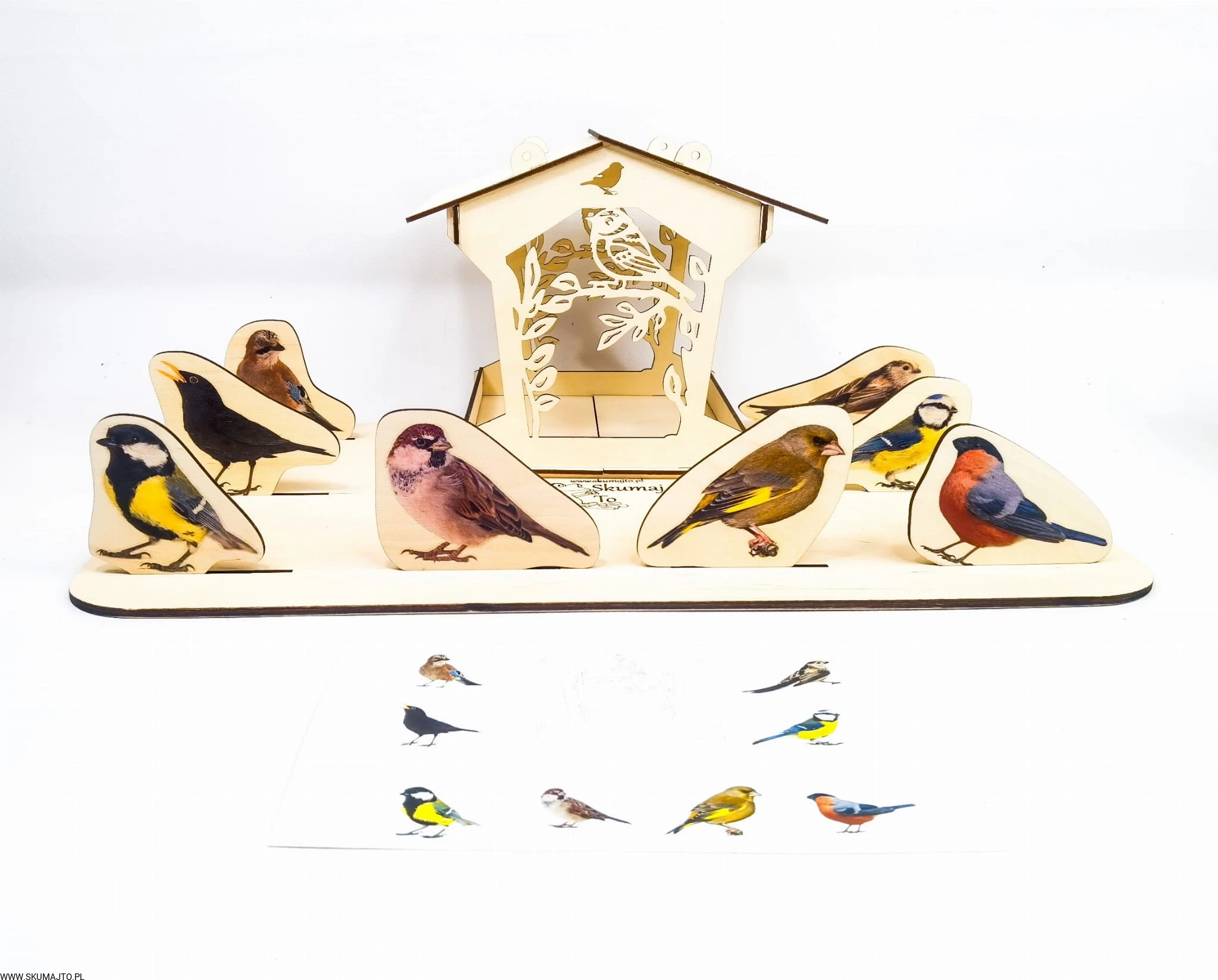 - Odwzorowywanie: Umieść karmnik na podstawie i odwzoruj wokół niego ułożenie ptaszków zgodnie z dołączonymi kartami.