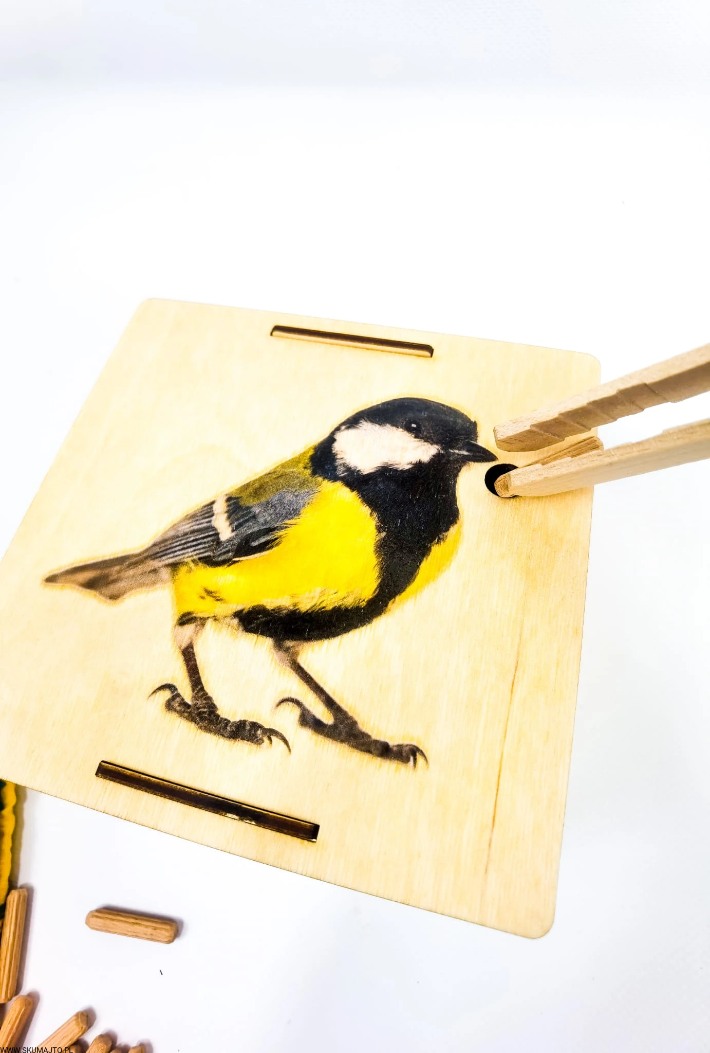 - Karmienie Ptaszków: Używając drewnianych szczypiec, dziecko karmi głodnego ptaszka, wspierając rozwój małej motoryki.