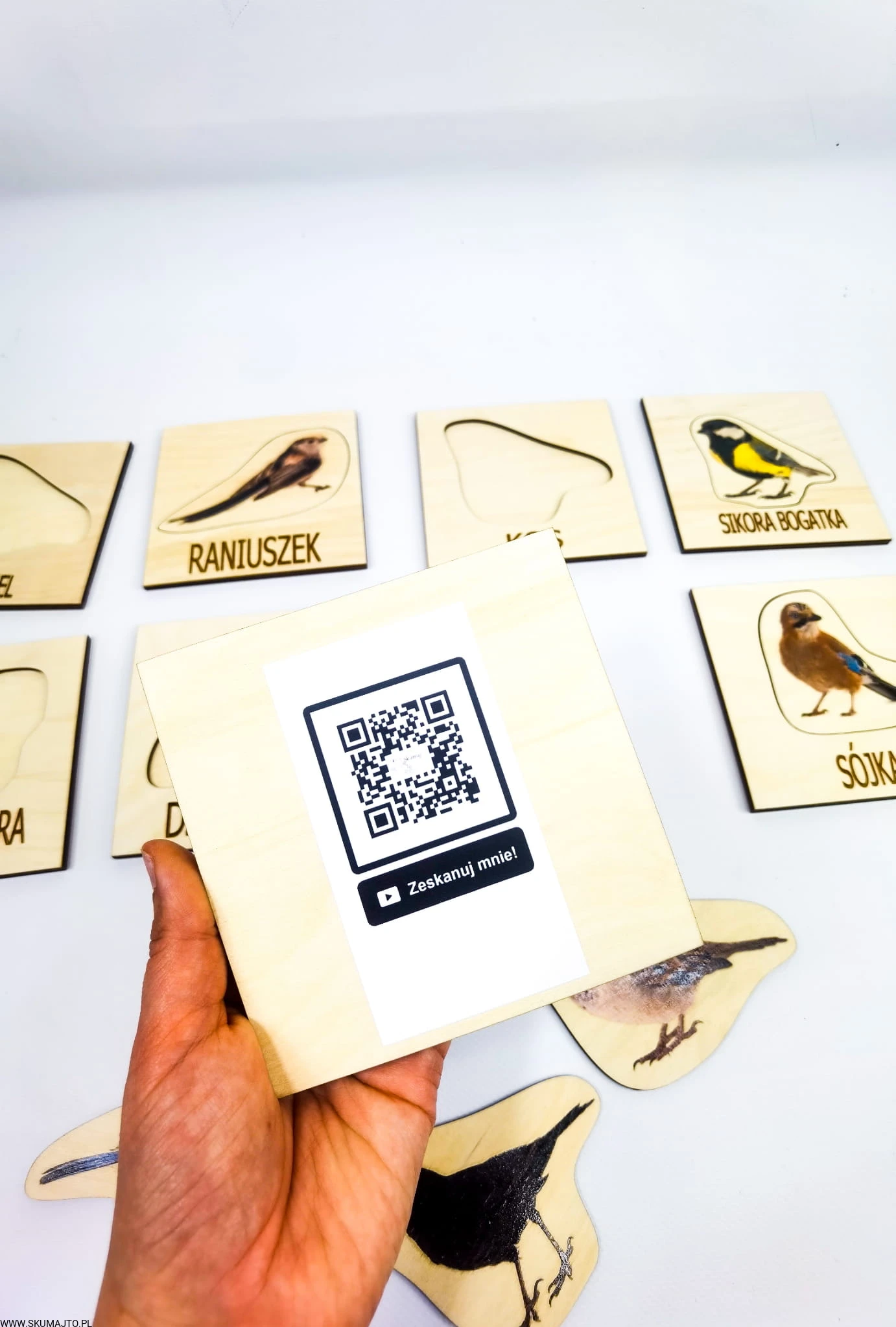 -na odwrocie każdej podstawki znajduje się kod QR, który po zeskanowaniu pozwoli dziecku obejrzeć danego ptaka w jego środowisku naturalnym.