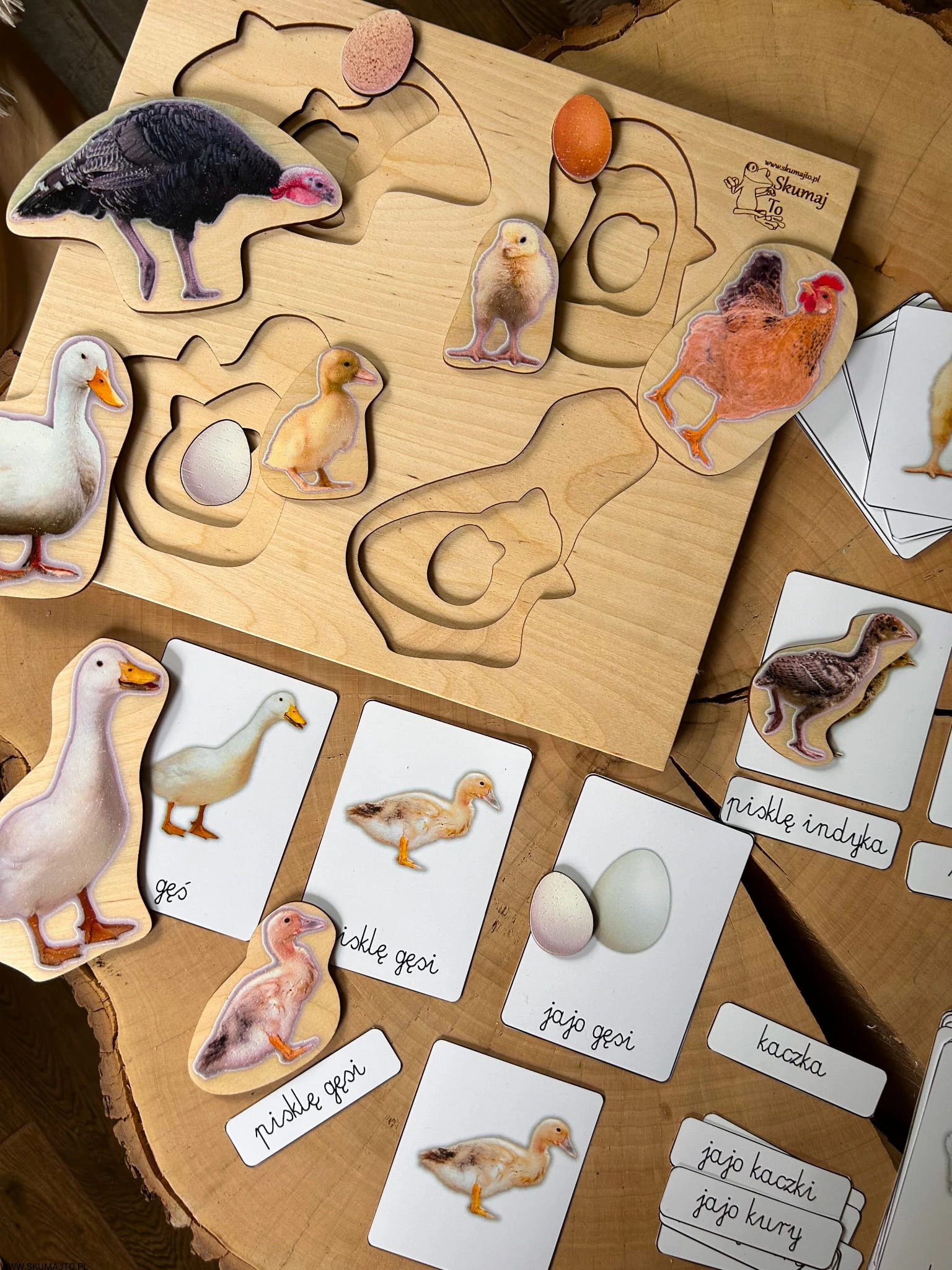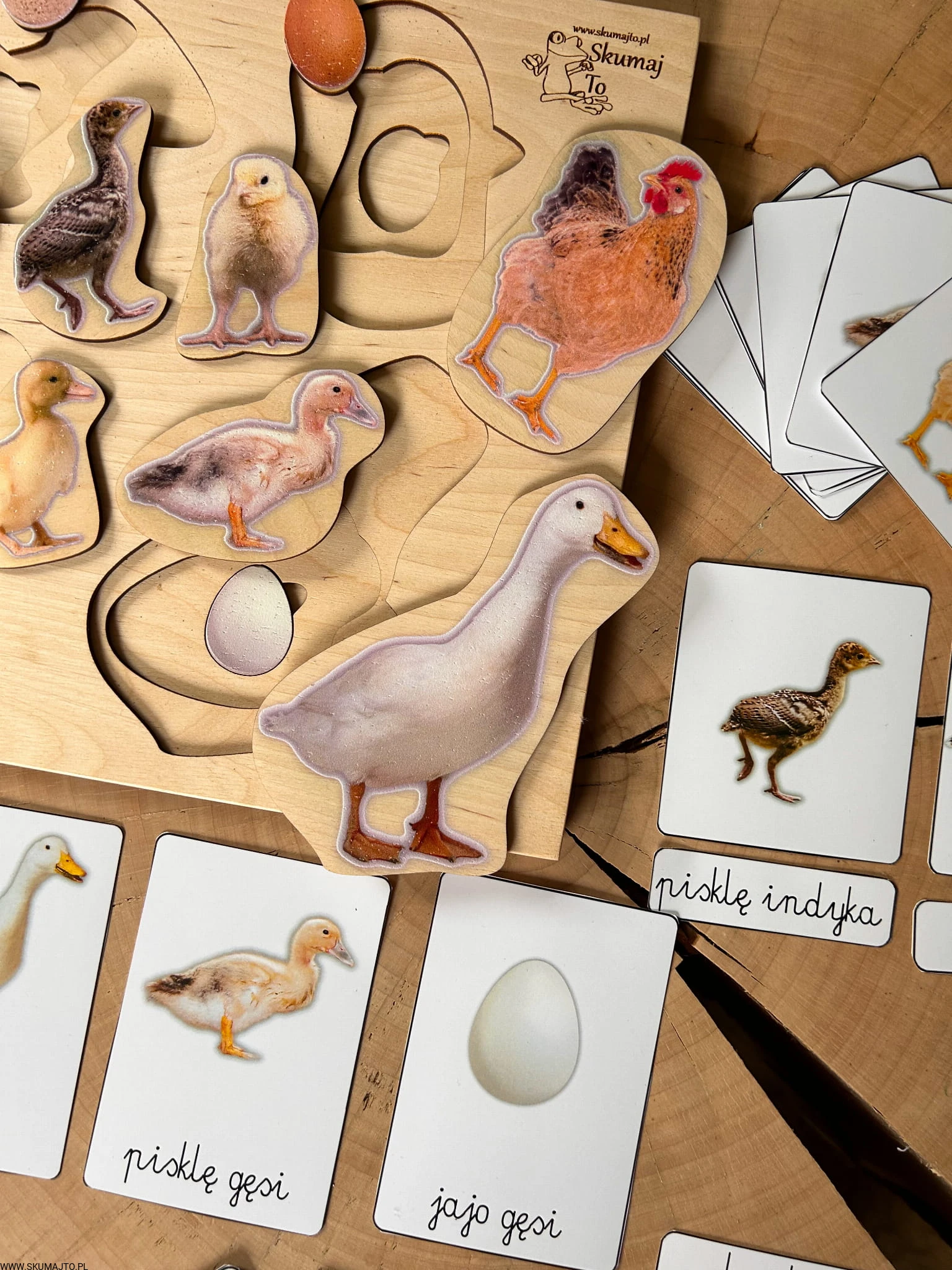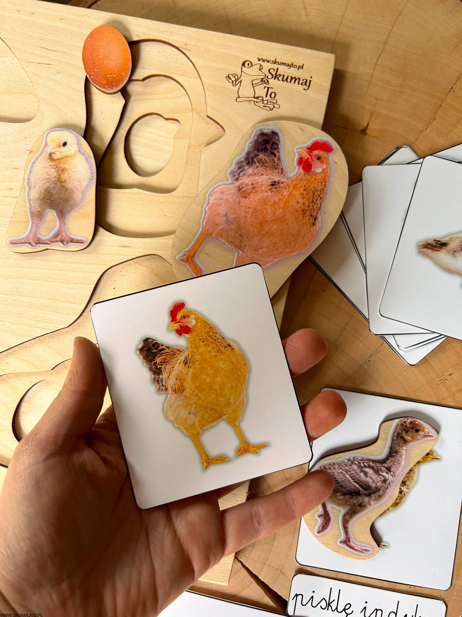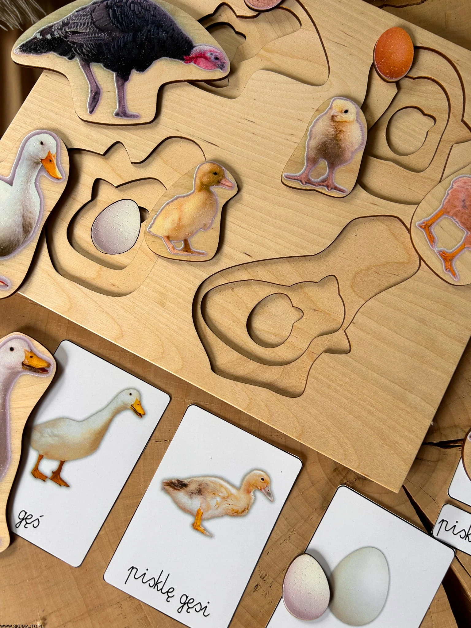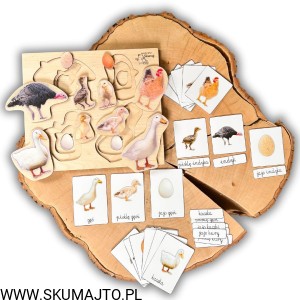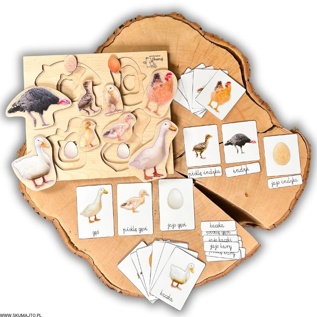Układanka jest 3-warstwowa i prezentuje cztery popularne gatunki ptaków wiejskich: gęś, indyk, kura i kaczka. Każda warstwa ukazuje inny etap życia ptaka – od jaja, przez pisklę, aż po dorosłego osobnika. Maluch, podnosząc element przedstawiający dorosłego ptaka, odkrywa, jak wygląda jego młode, a następnie jajo, z którego się wykluło.