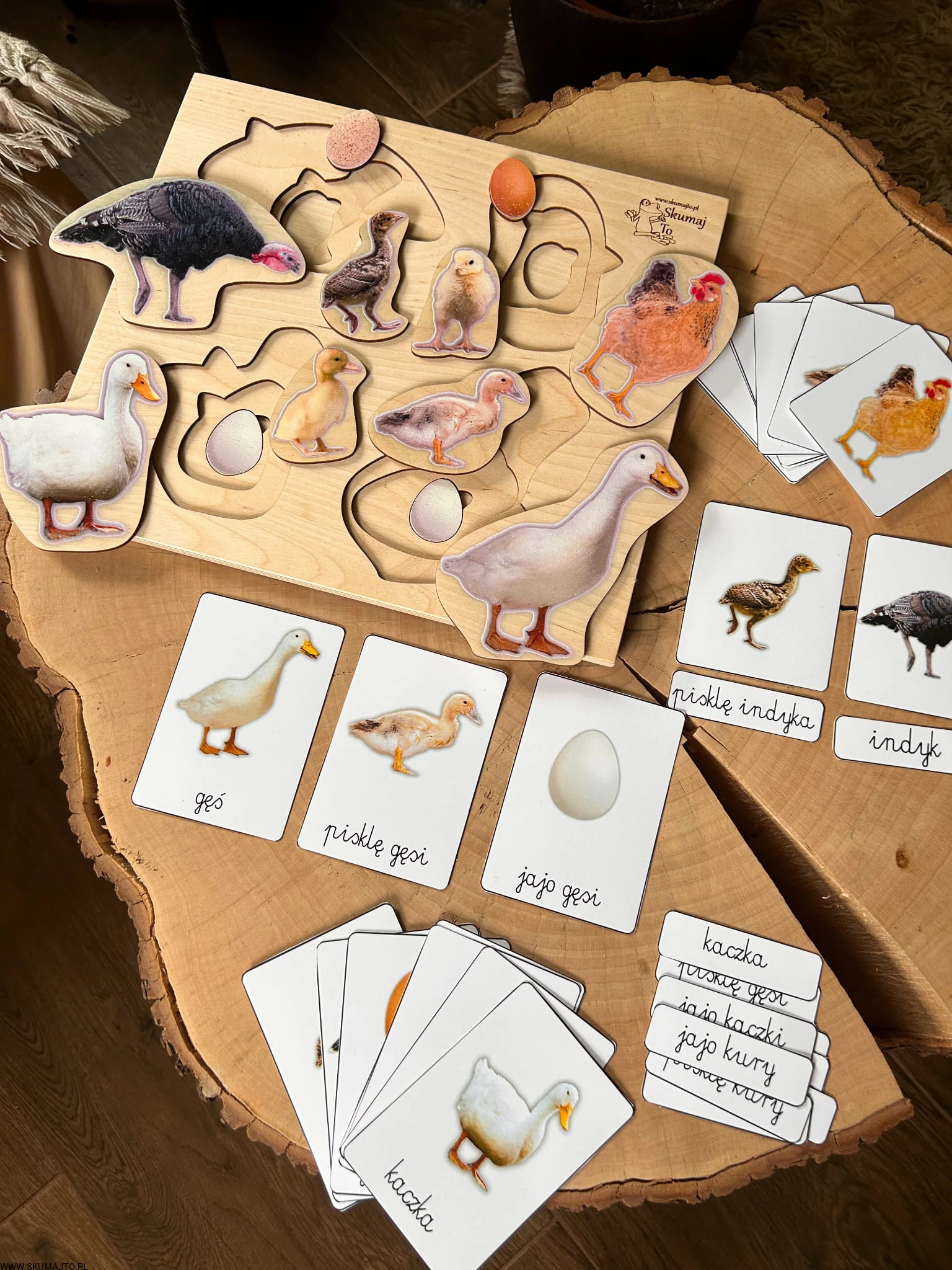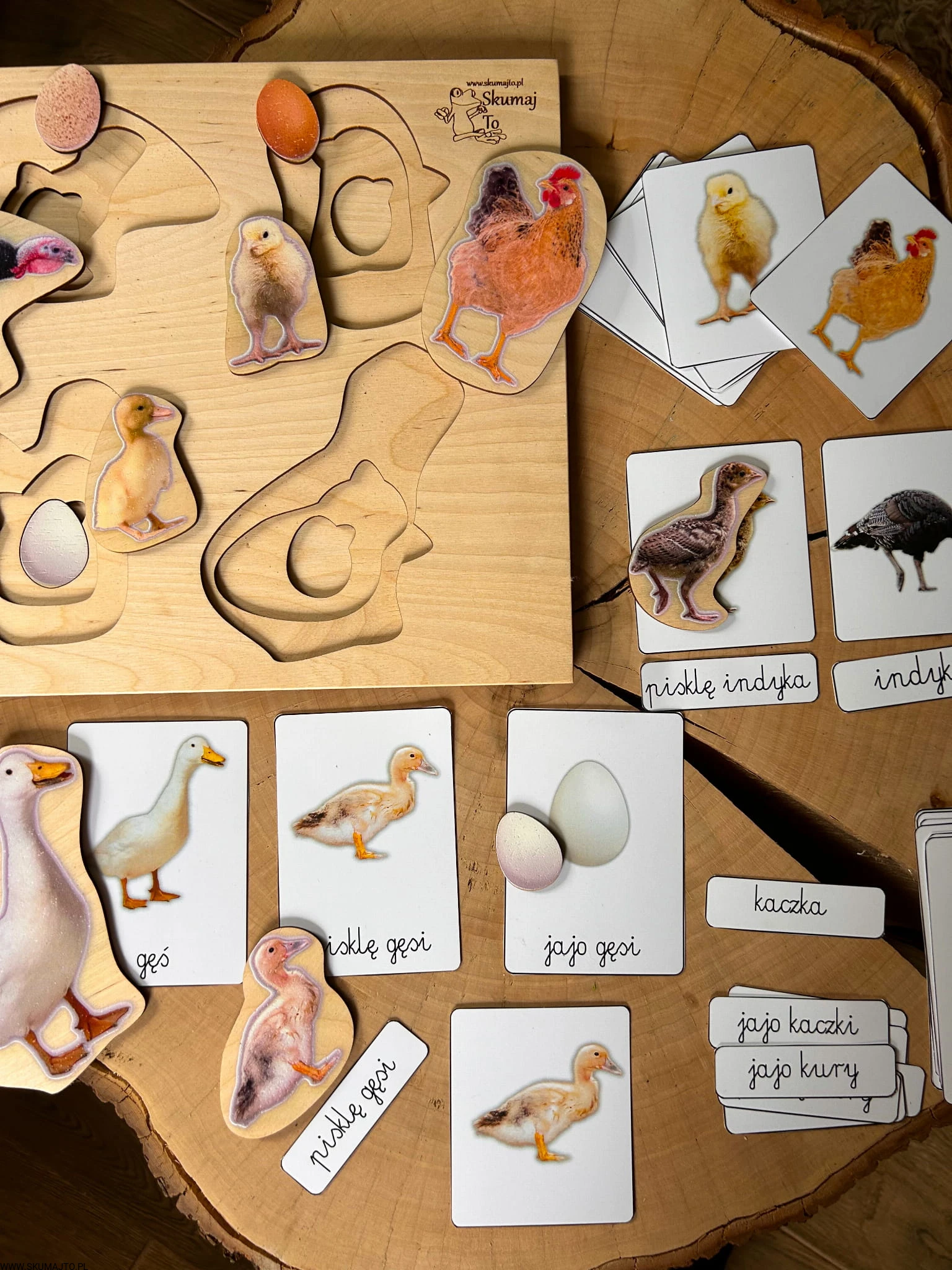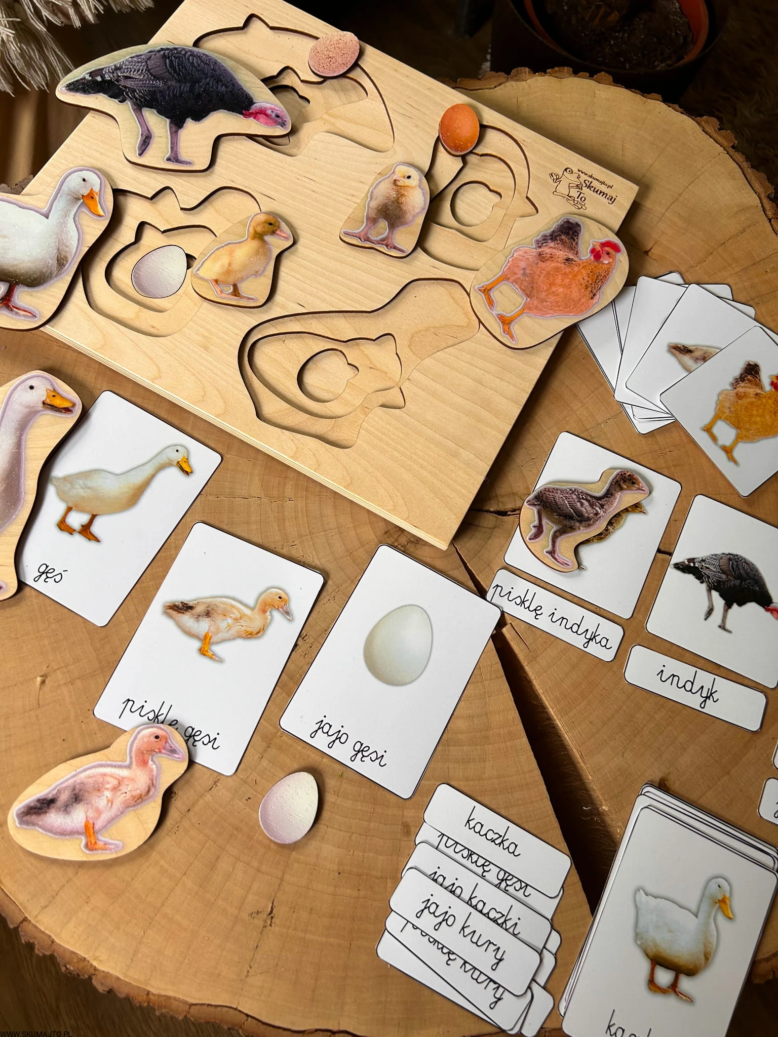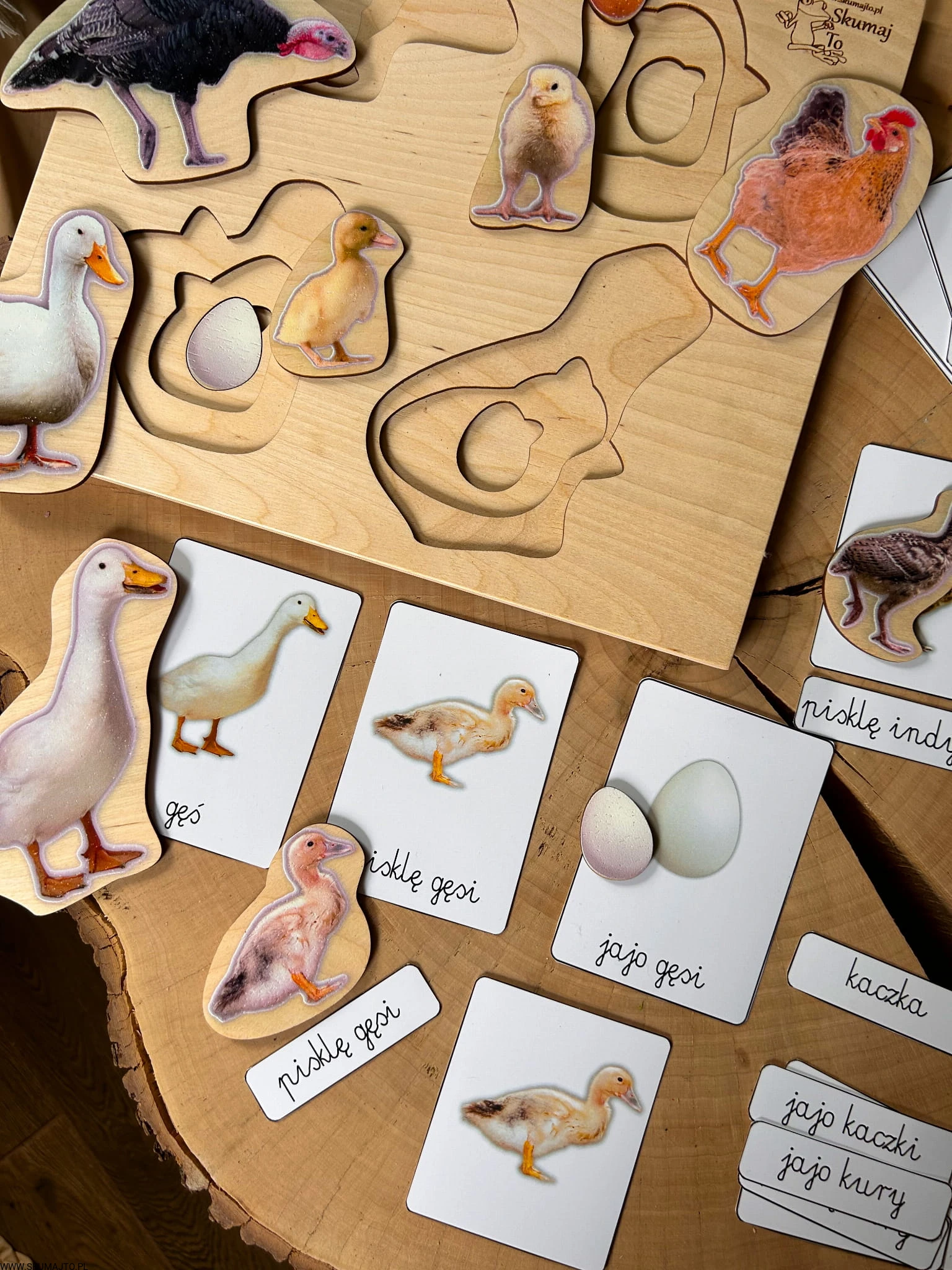 Układanka jest 3-warstwowa i prezentuje cztery popularne gatunki ptaków wiejskich: gęś, indyk, kura i kaczka. Każda warstwa ukazuje inny etap życia ptaka – od jaja, przez pisklę, aż po dorosłego osobnika. Maluch, podnosząc element przedstawiający dorosłego ptaka, odkrywa, jak wygląda jego młode, a następnie jajo, z którego się wykluło.