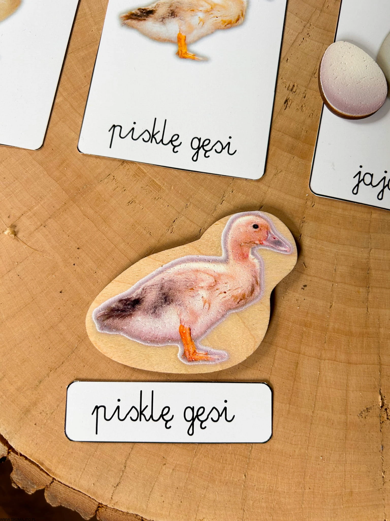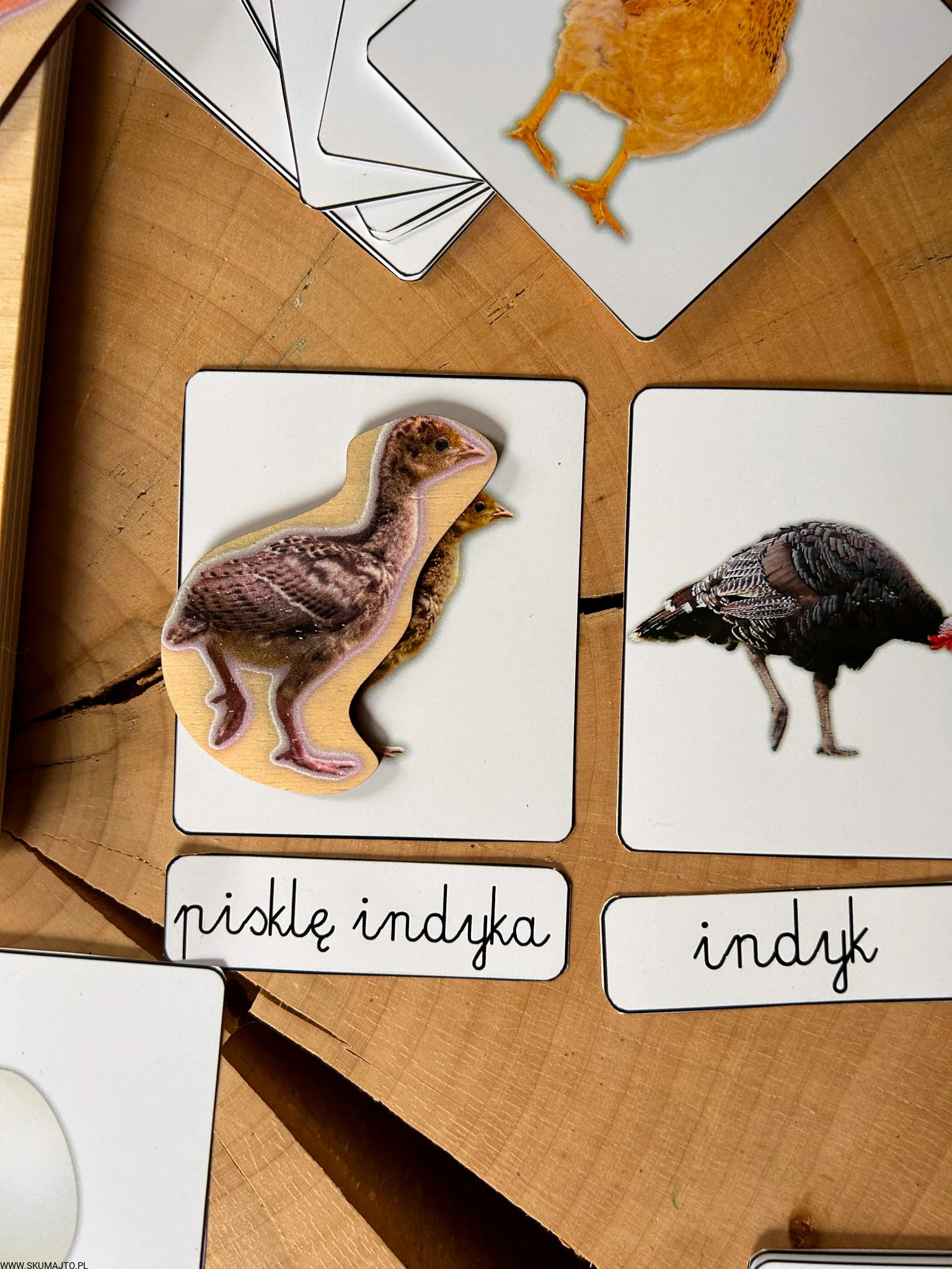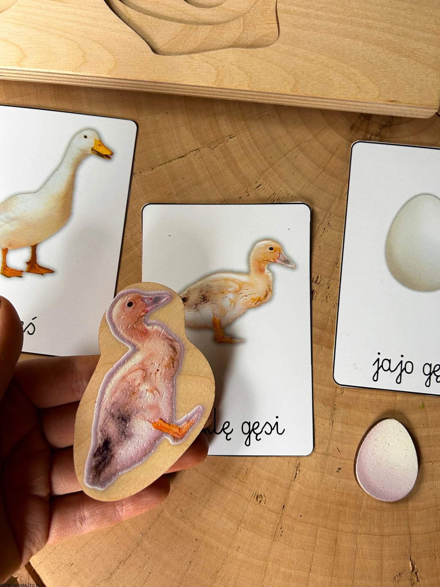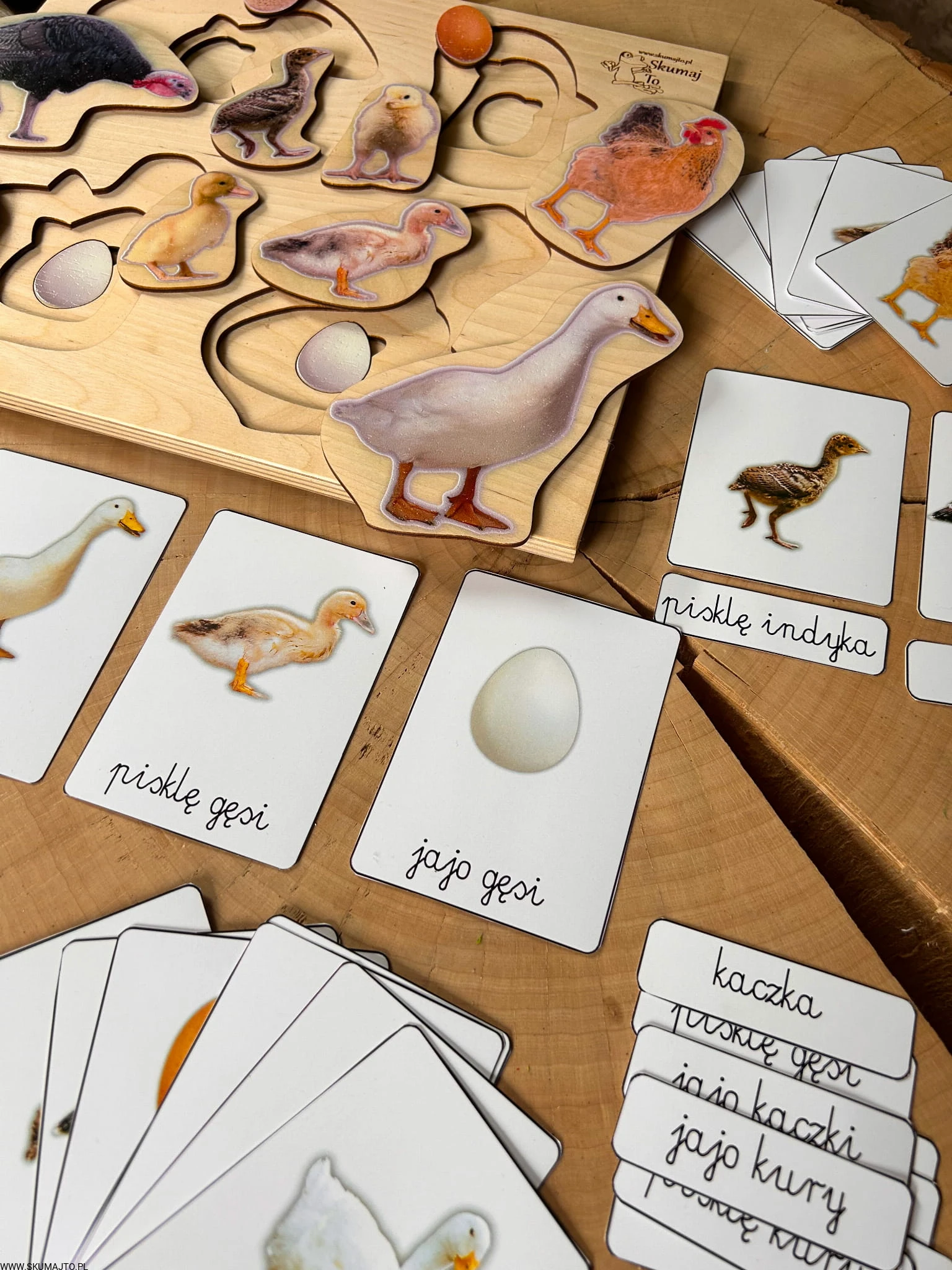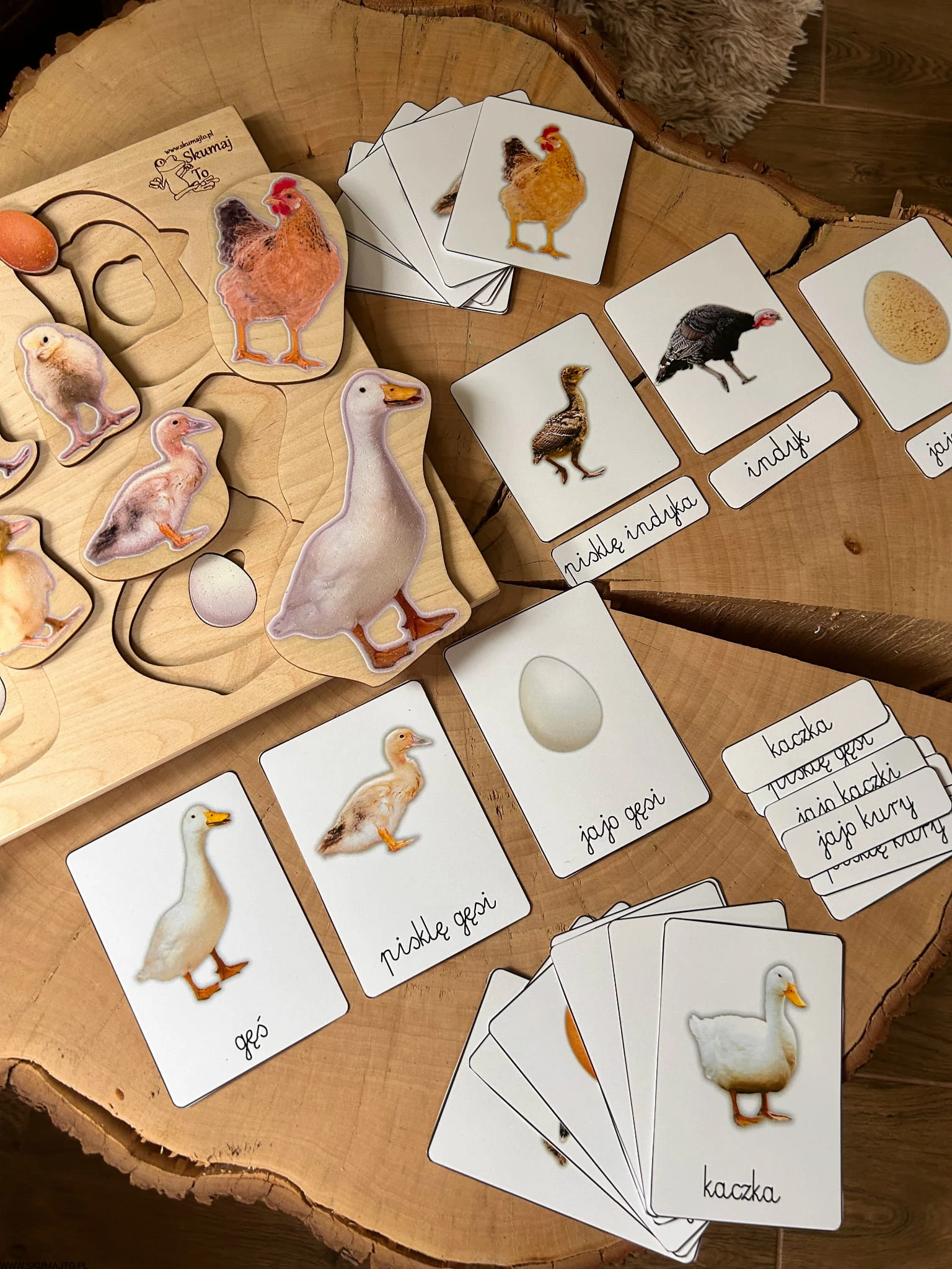 Układanka jest 3-warstwowa i prezentuje cztery popularne gatunki ptaków wiejskich: gęś, indyk, kura i kaczka. Każda warstwa ukazuje inny etap życia ptaka – od jaja, przez pisklę, aż po dorosłego osobnika. Maluch, podnosząc element przedstawiający dorosłego ptaka, odkrywa, jak wygląda jego młode, a następnie jajo, z którego się wykluło.