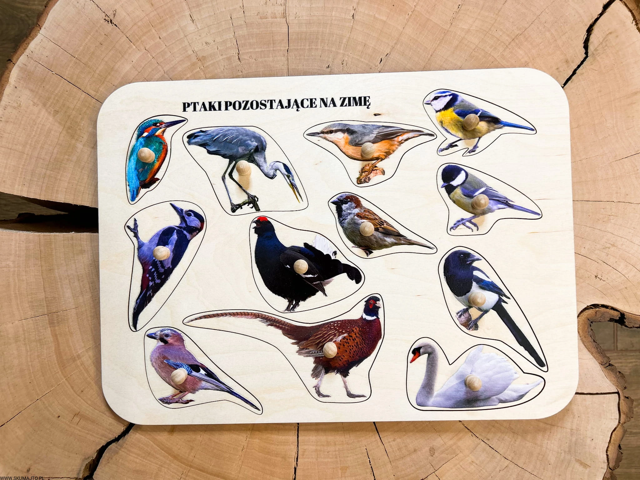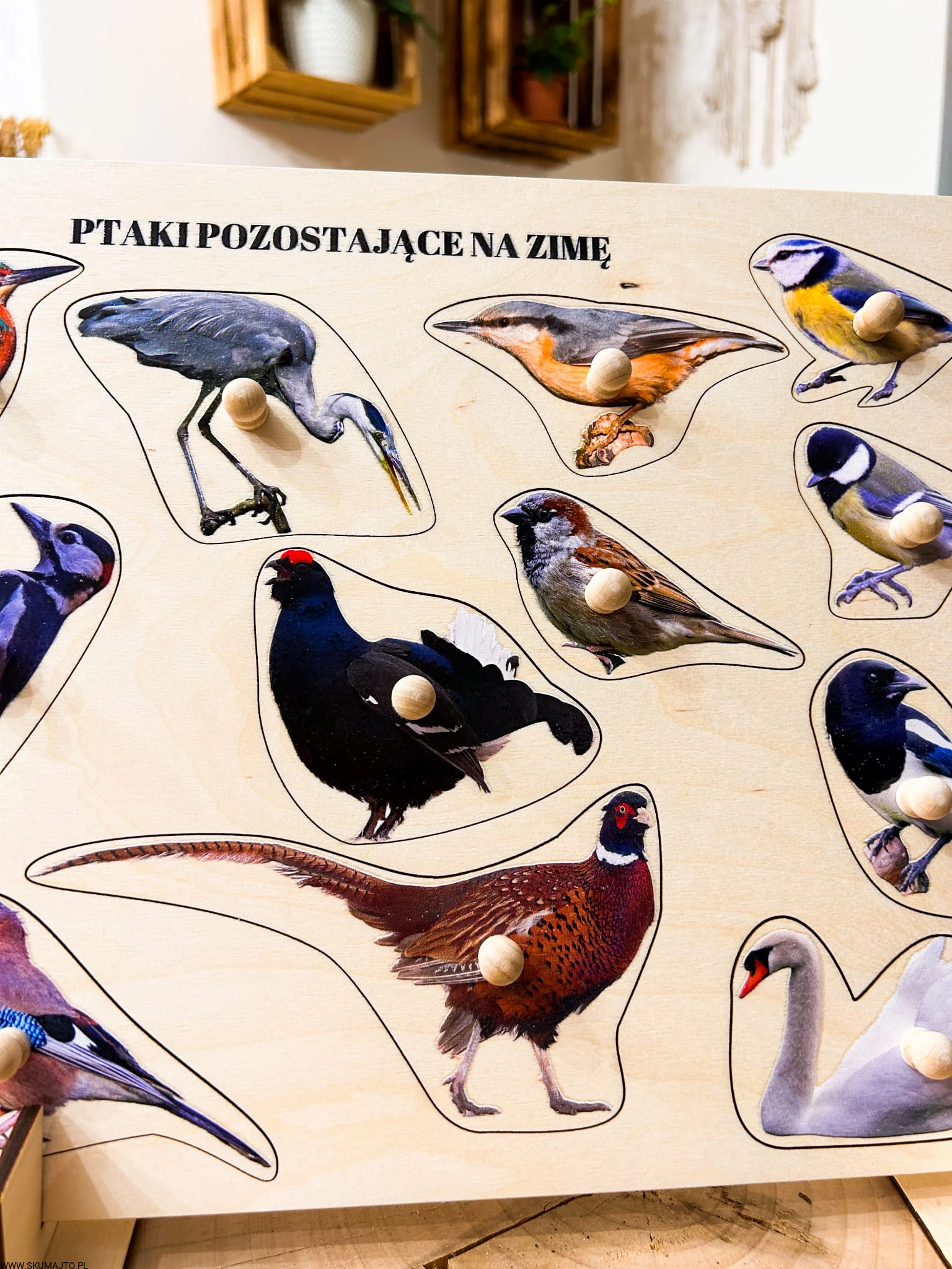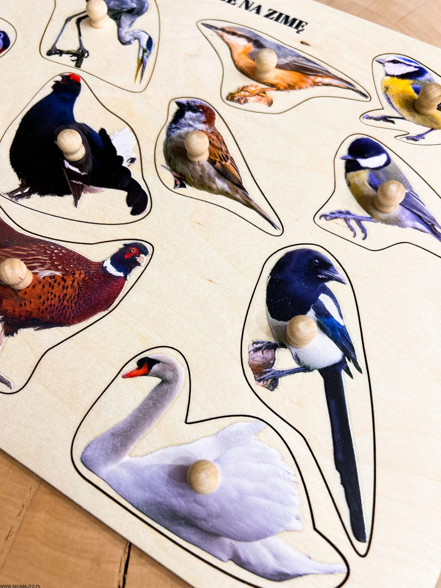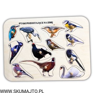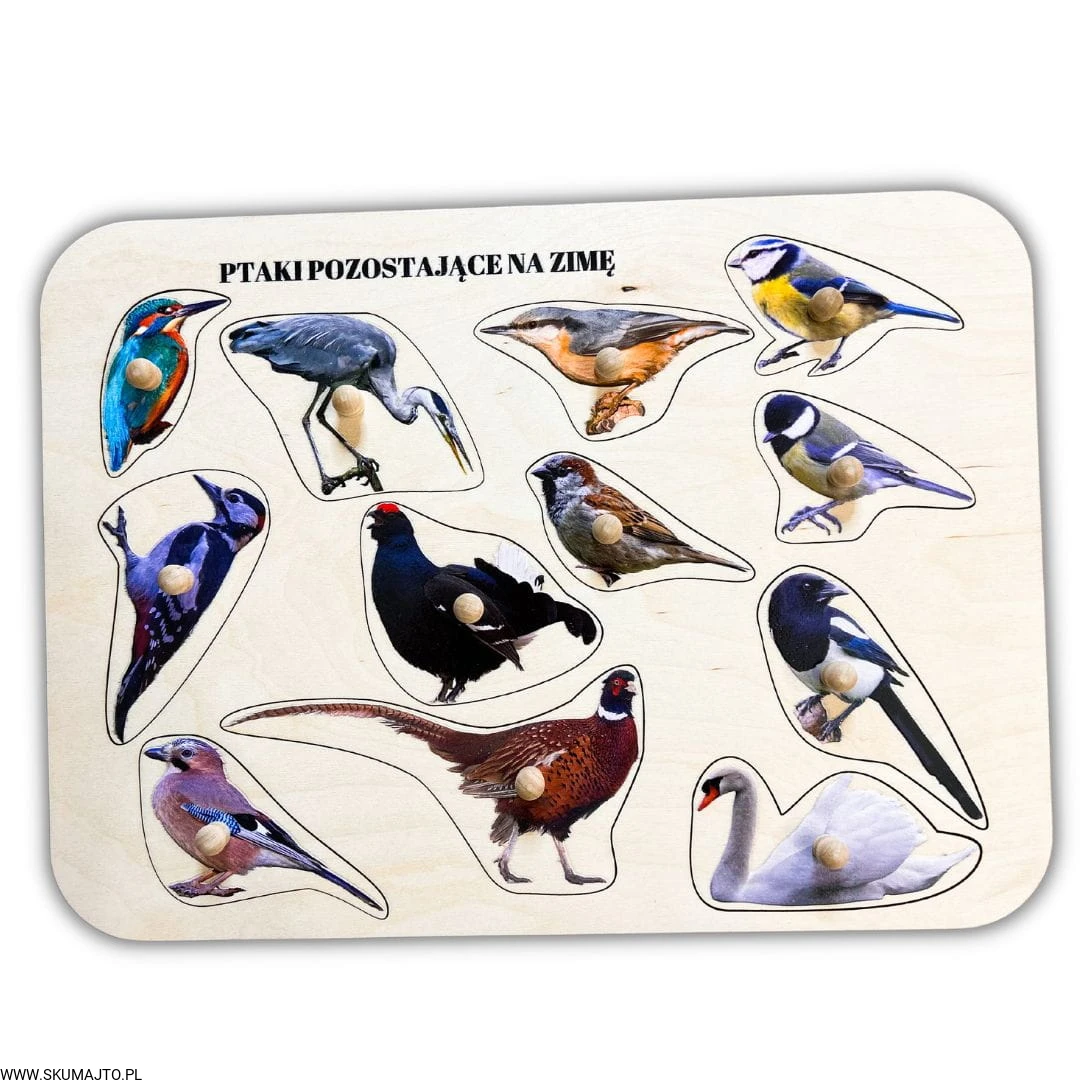 Ptaki zostające na zimę, drewniane puzzle z uchwytami i podpisami, pierwsze puzzle