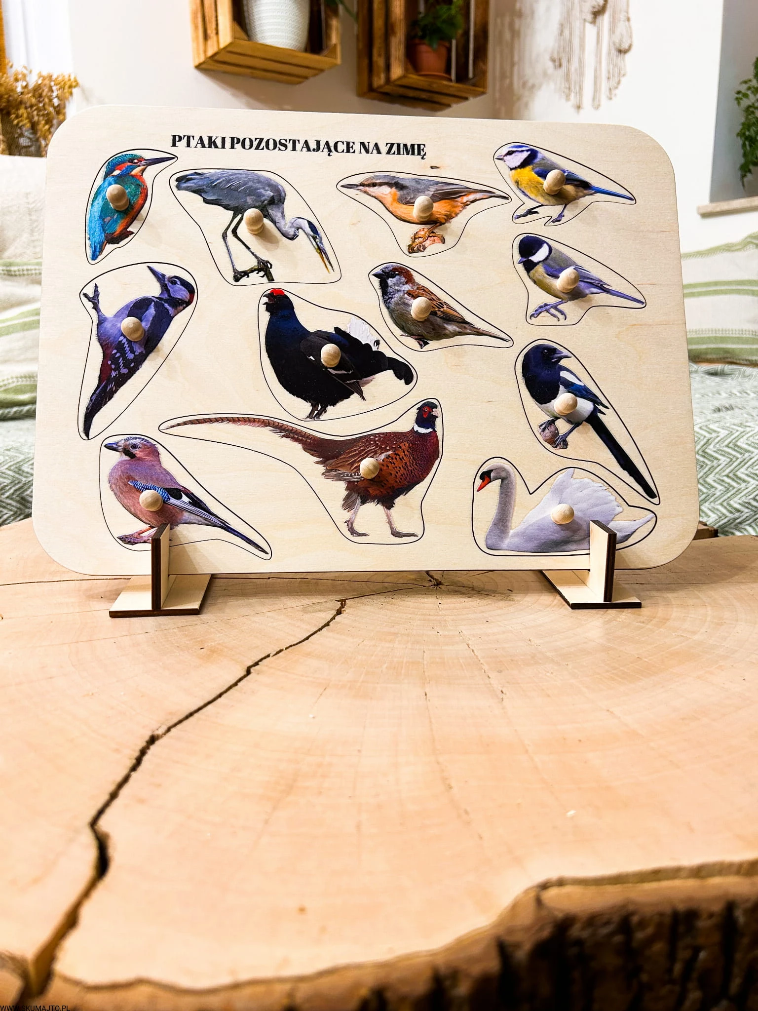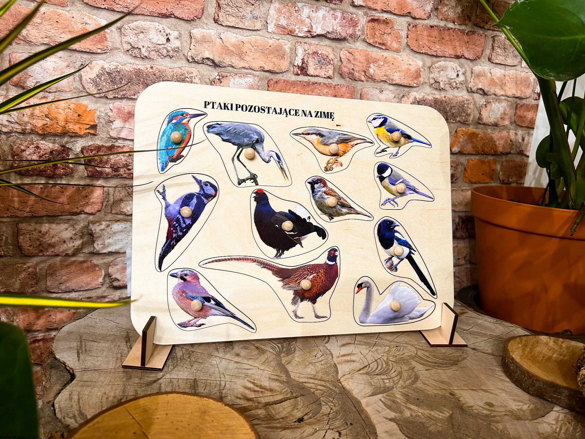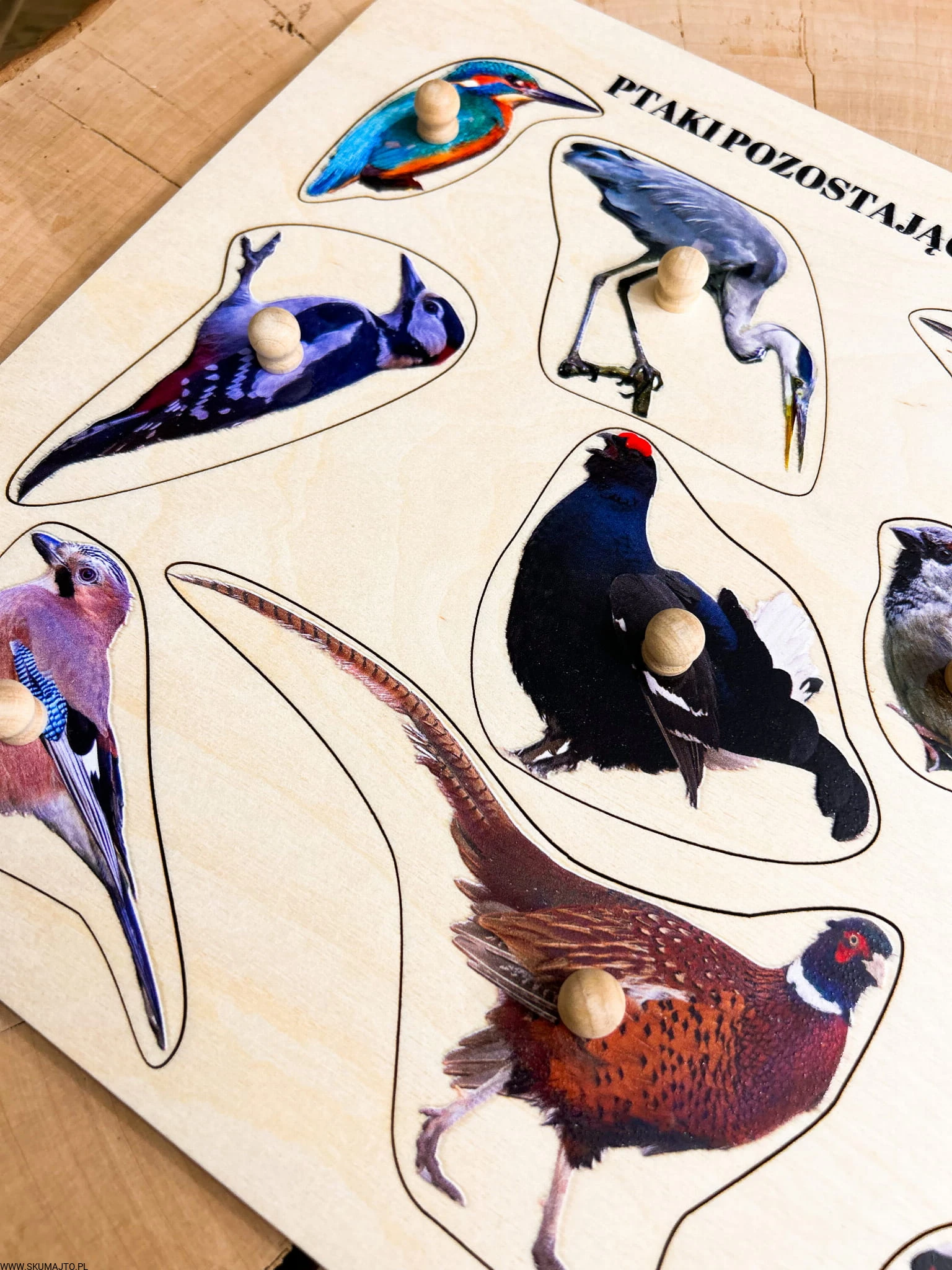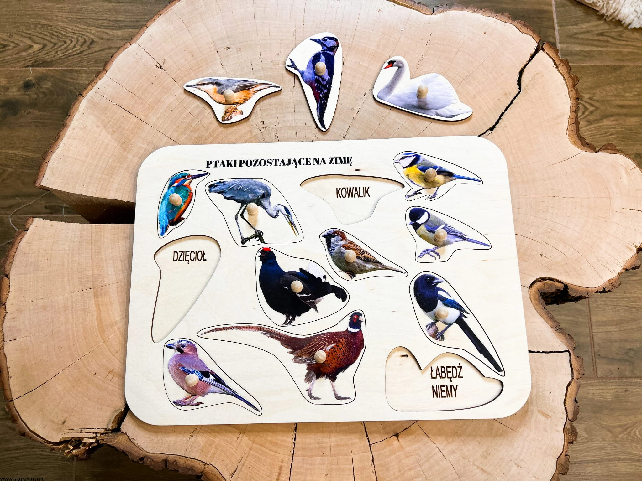 Ptaki zostające na zimę, drewniane puzzle z uchwytami i podpisami, pierwsze puzzle