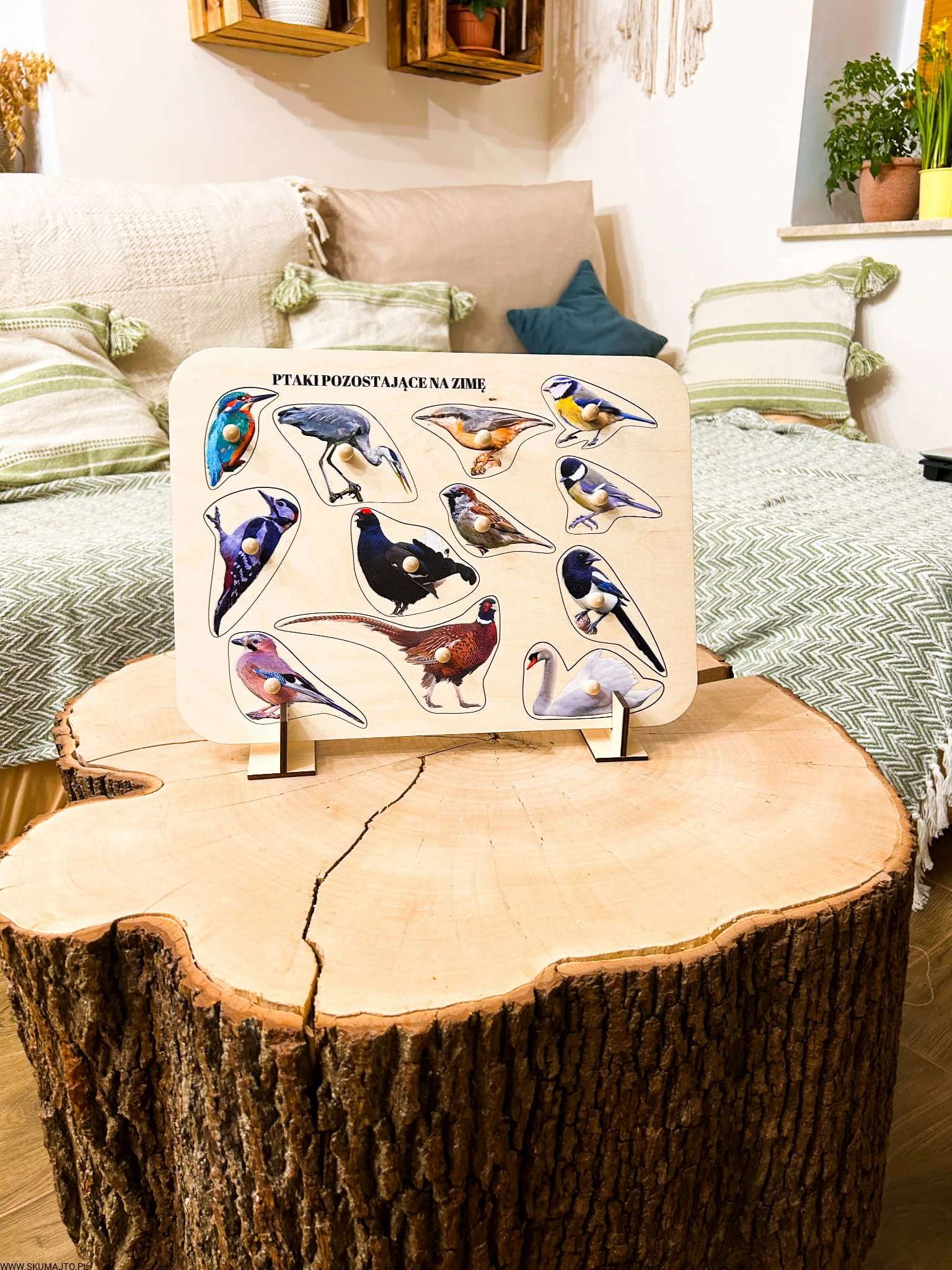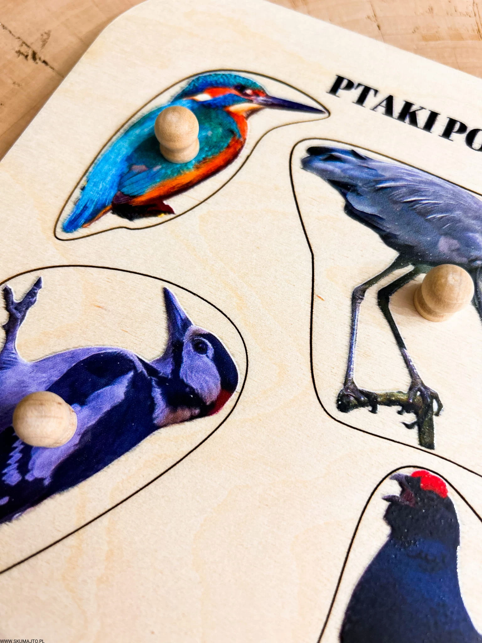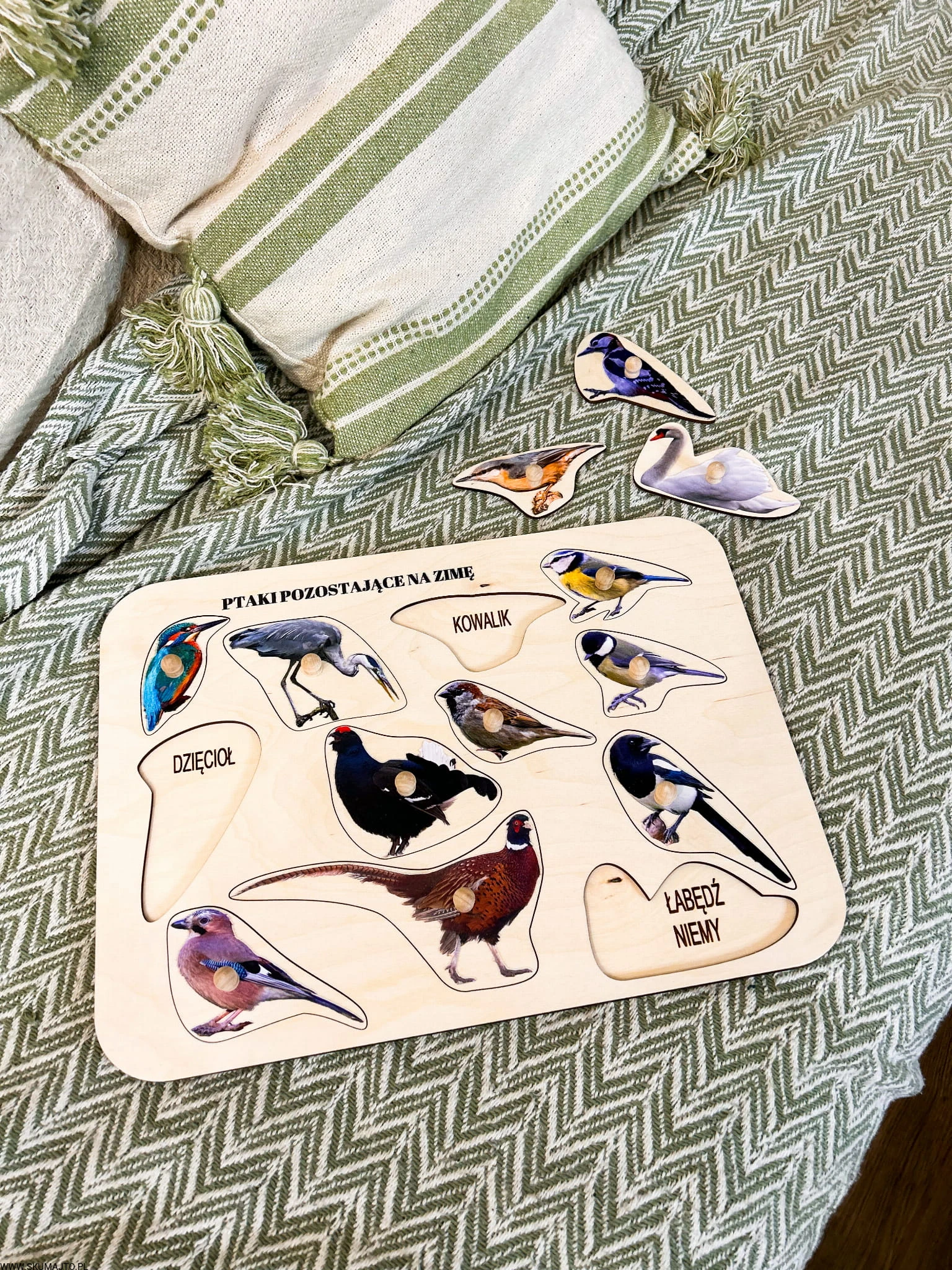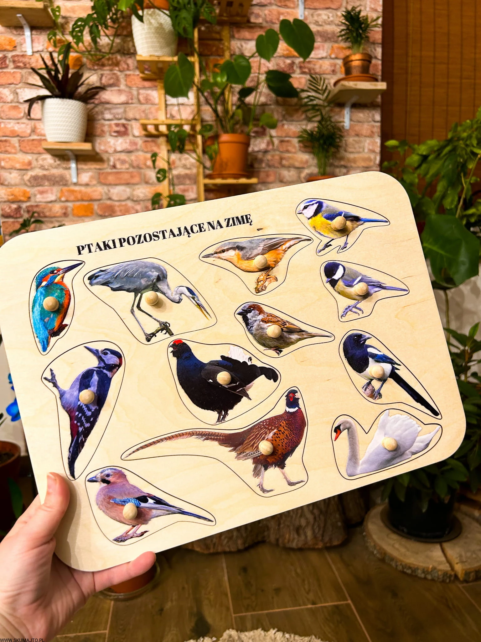 Ptaki zostające na zimę, drewniane puzzle z uchwytami i podpisami, pierwsze puzzle