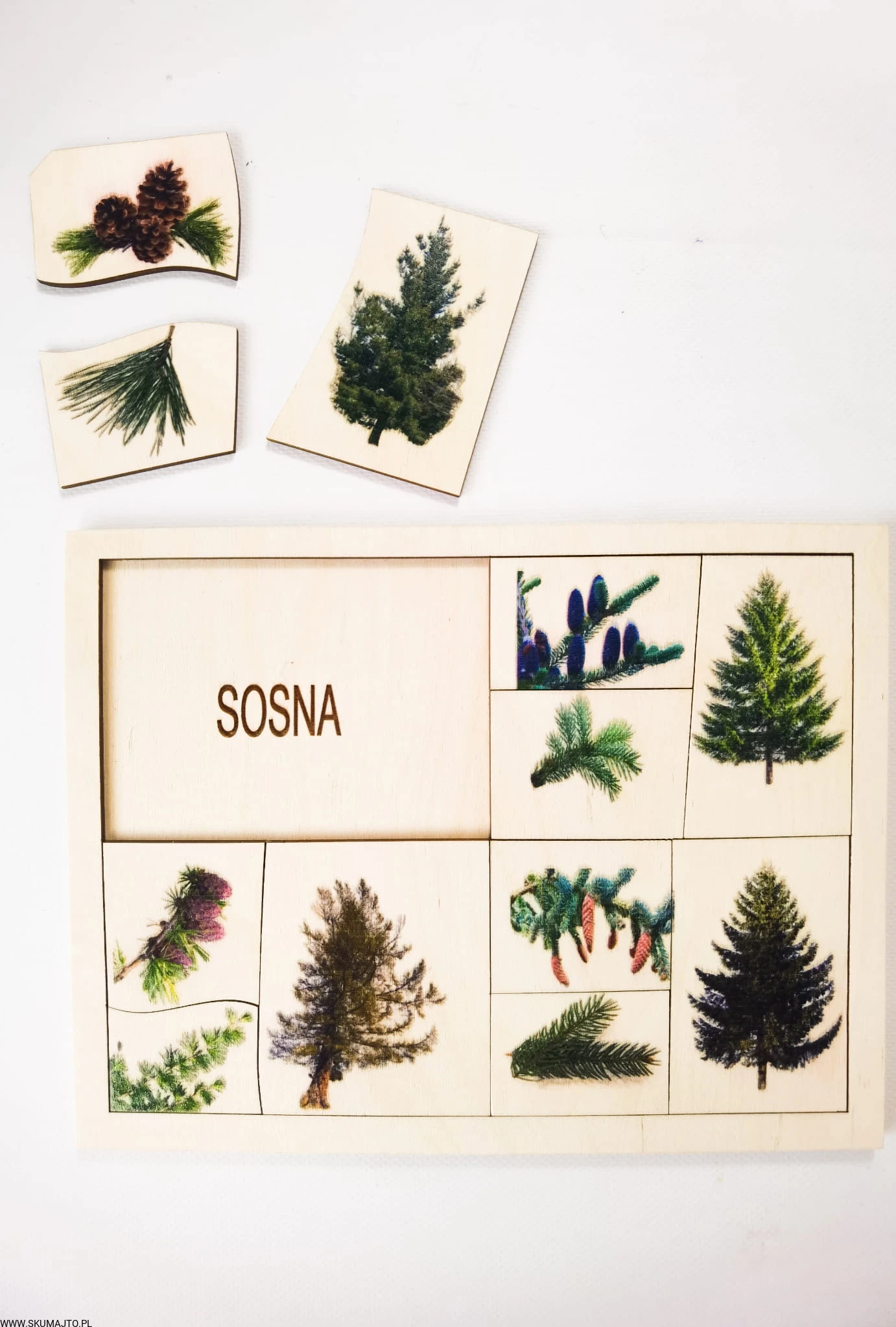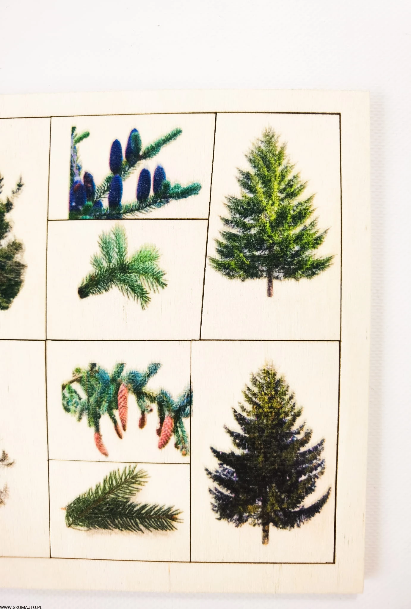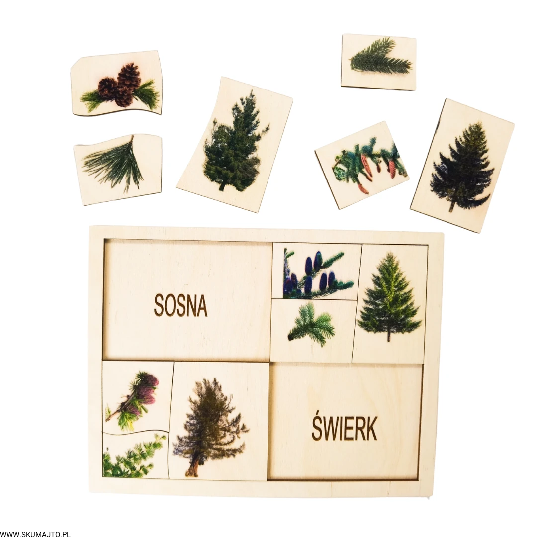 Rodzaje drzew iglastych, drewniana układanka, drzewa leśne