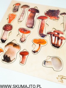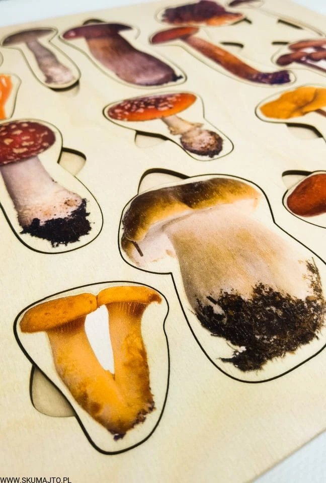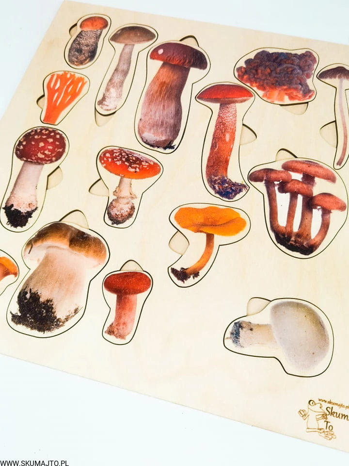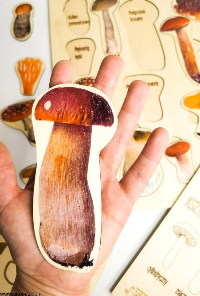 - Wyjmowane elementy: Różne gatunki grzybów z podpisami.