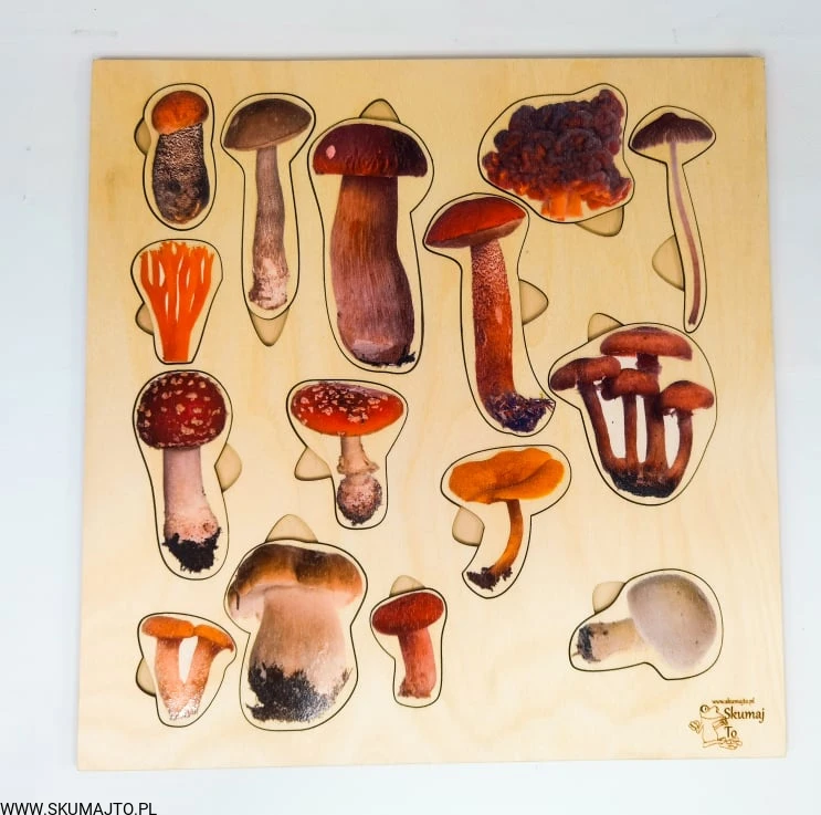 Rodzaje grzybów, drewniana układanka, edukacja leśna, gatunki grzybów
