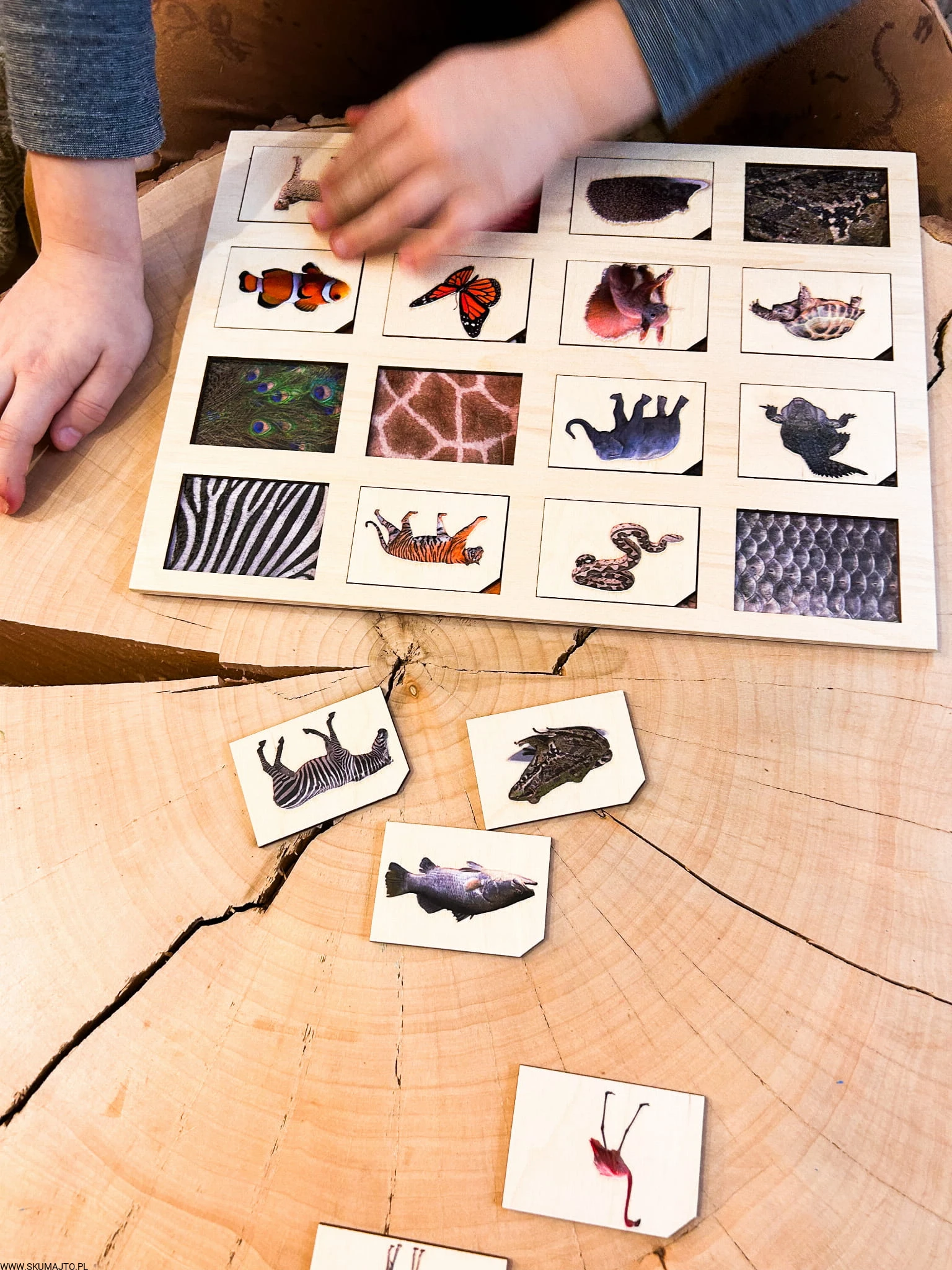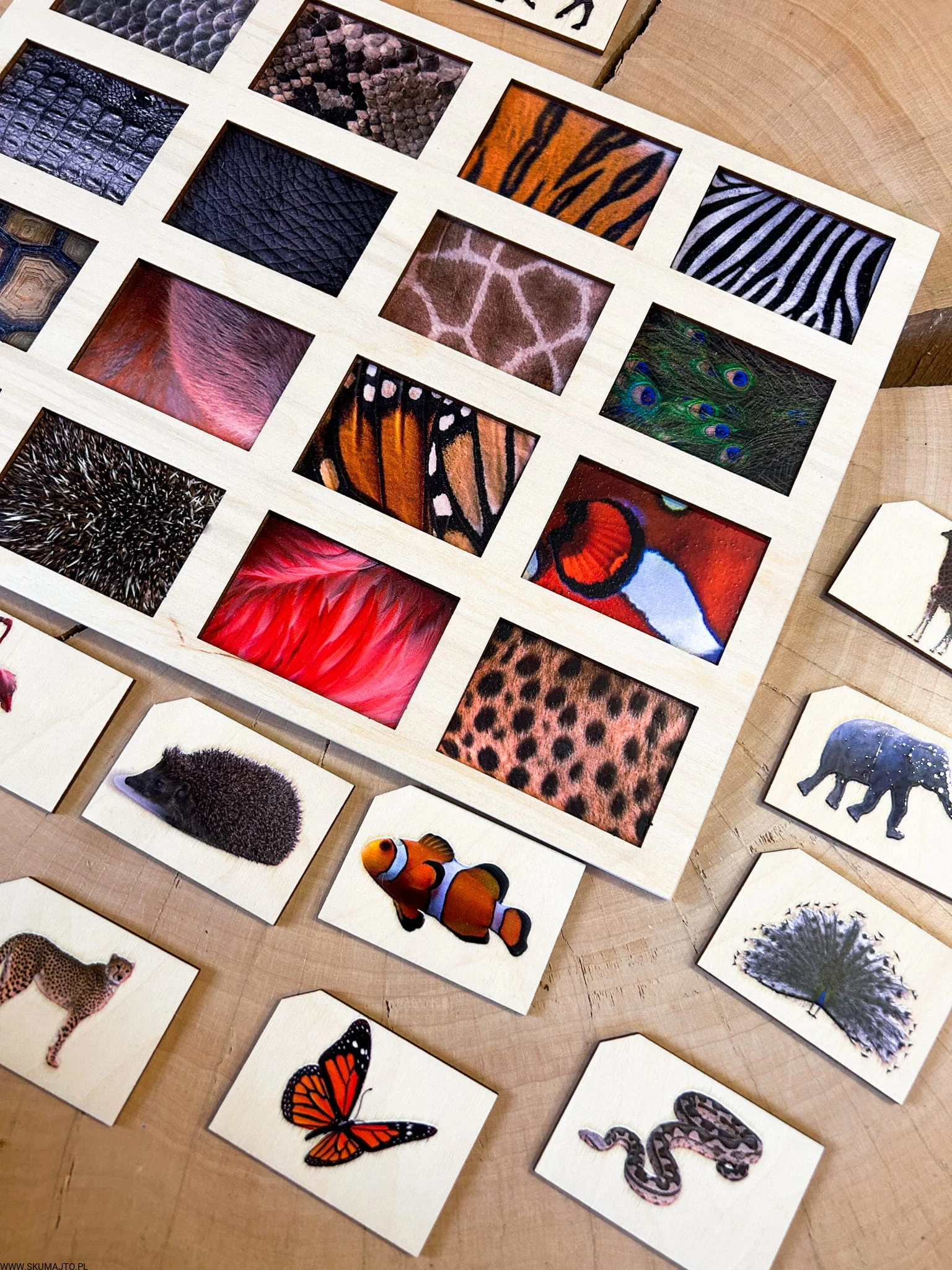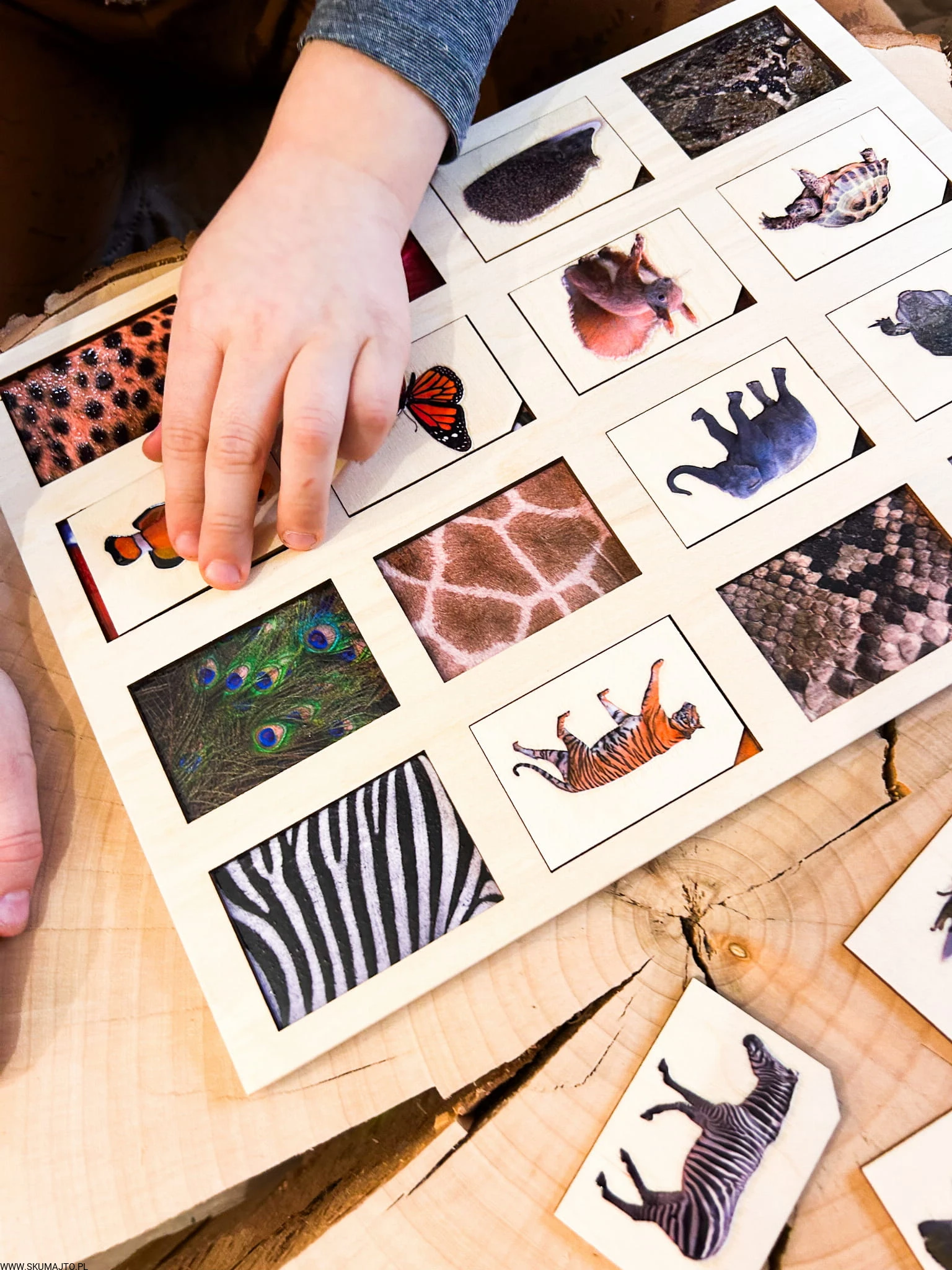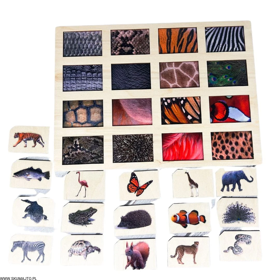 Zadaniem małych odkrywców jest zidentyfikowanie każdej z tych fascynujących tekstur i dopasowanie do nich odpowiedniego zwierzęcia. Od pasków zebry, przez barwne pióra pawia, po łuski ryb – ta układanka to prawdziwe wyzwanie, które pobudza zmysły i rozwija umiejętności poznawcze.