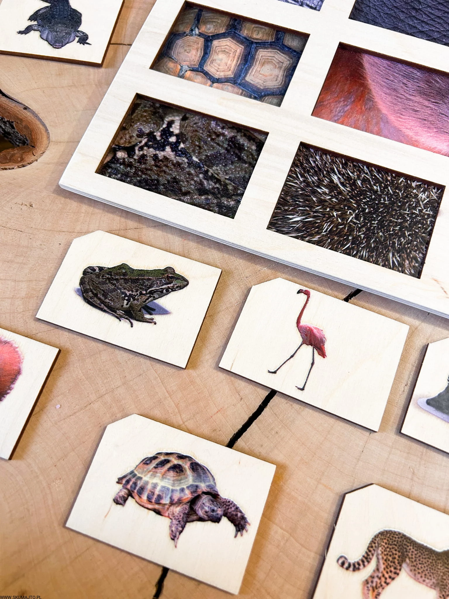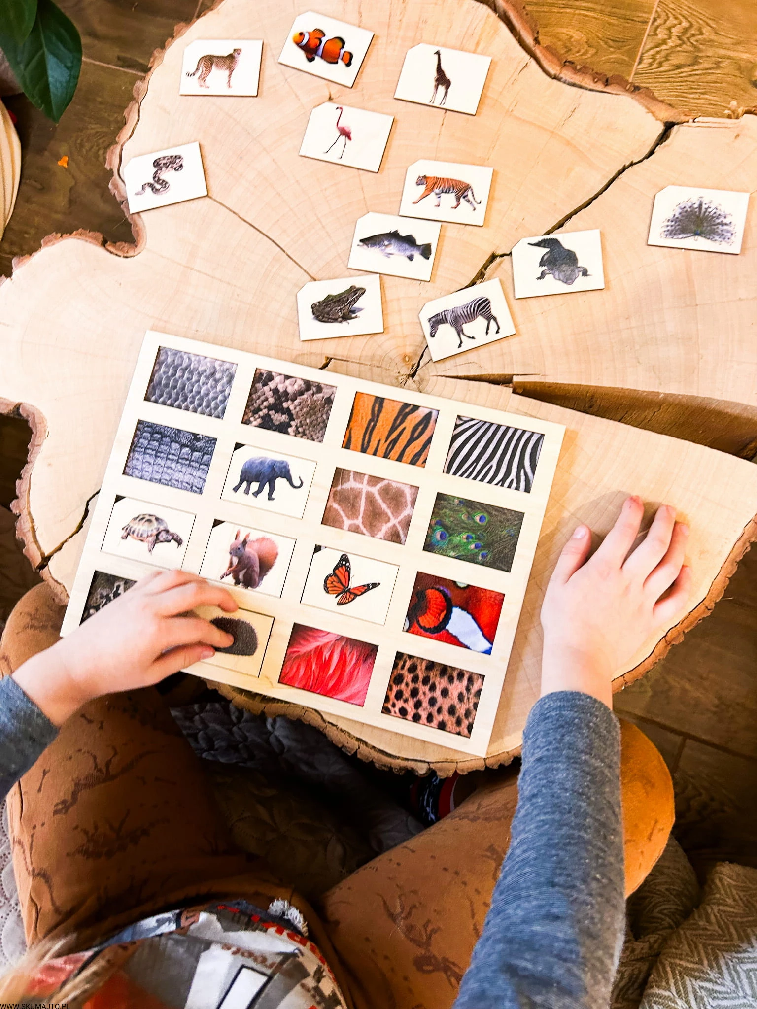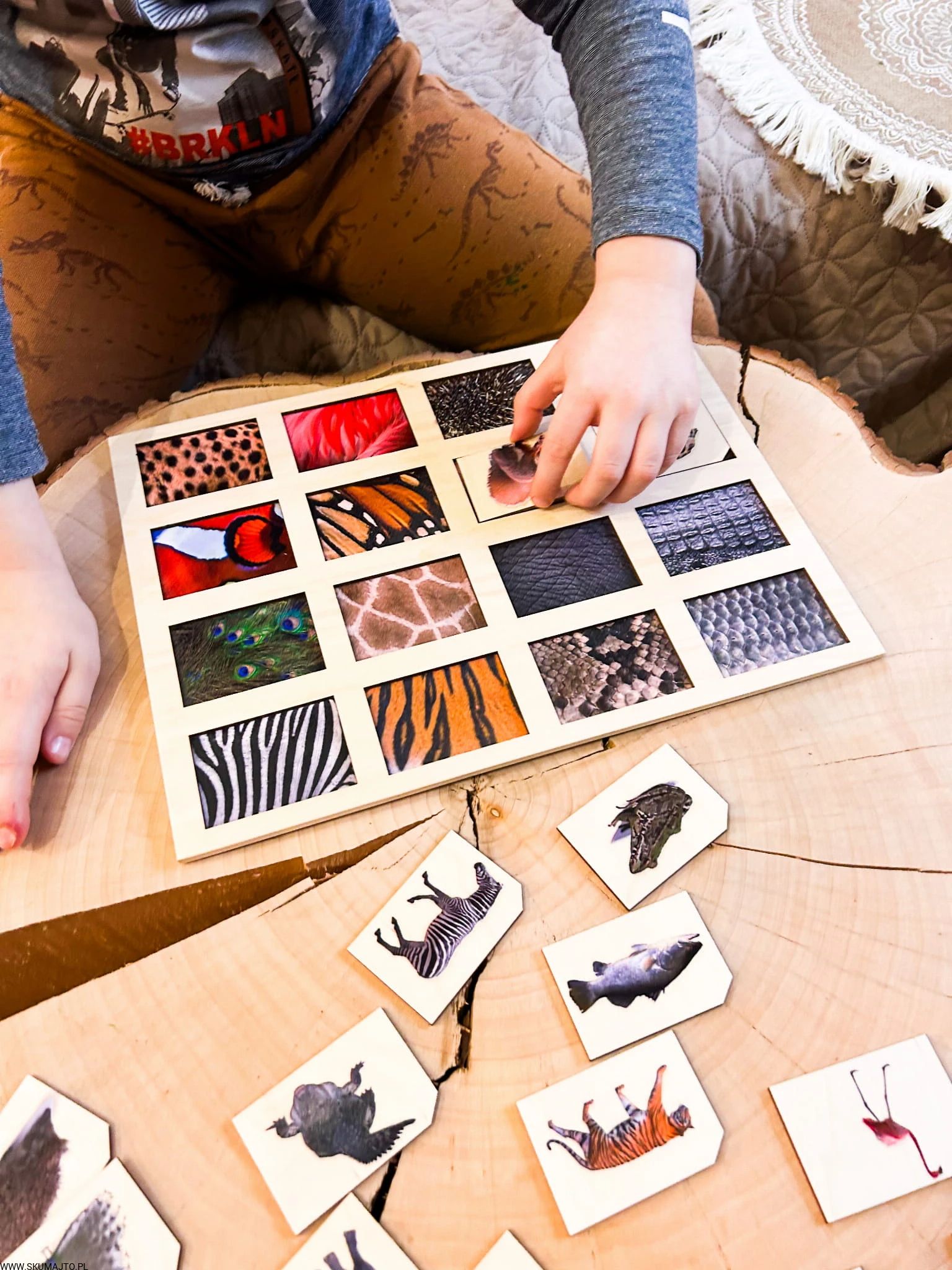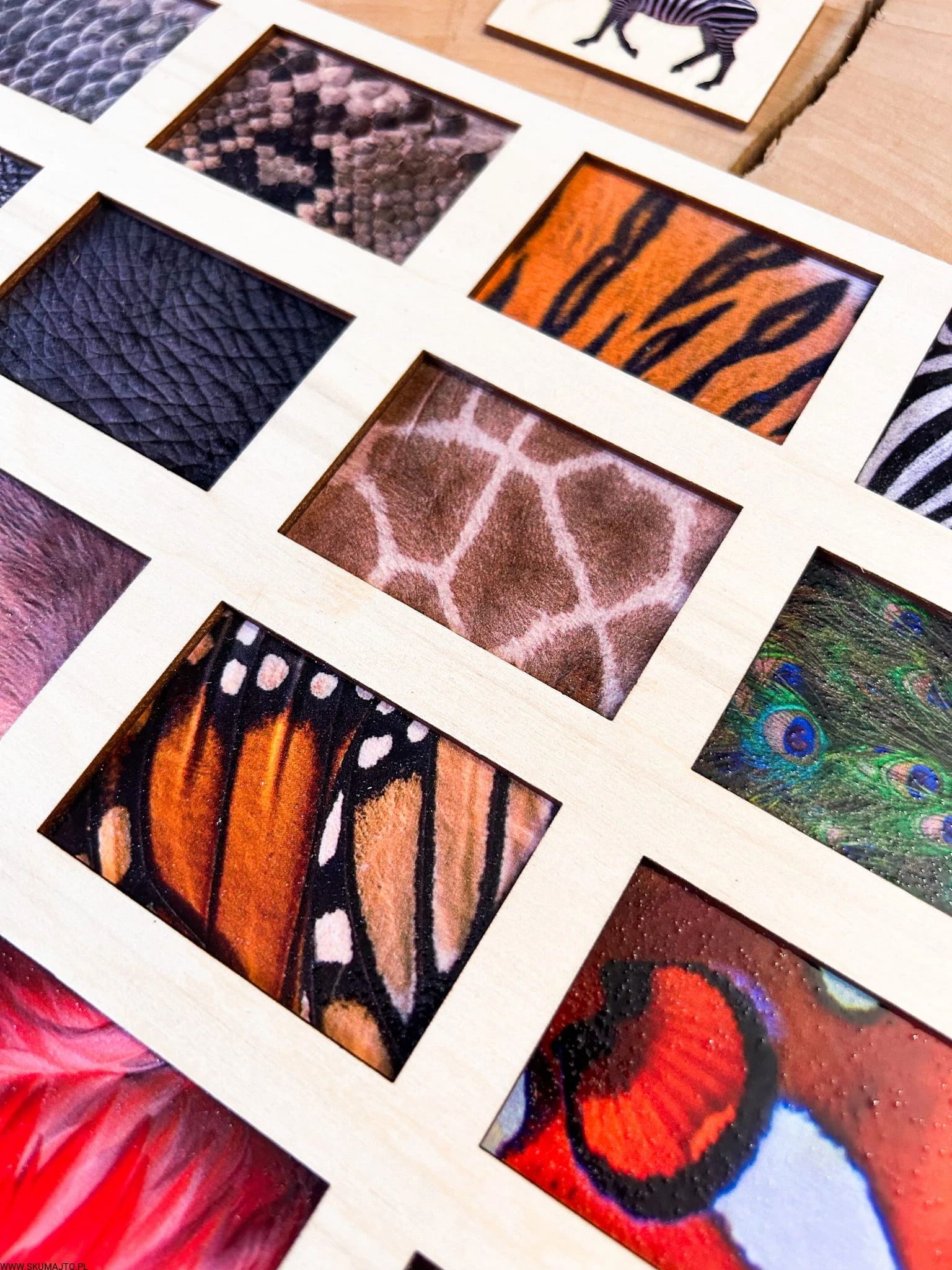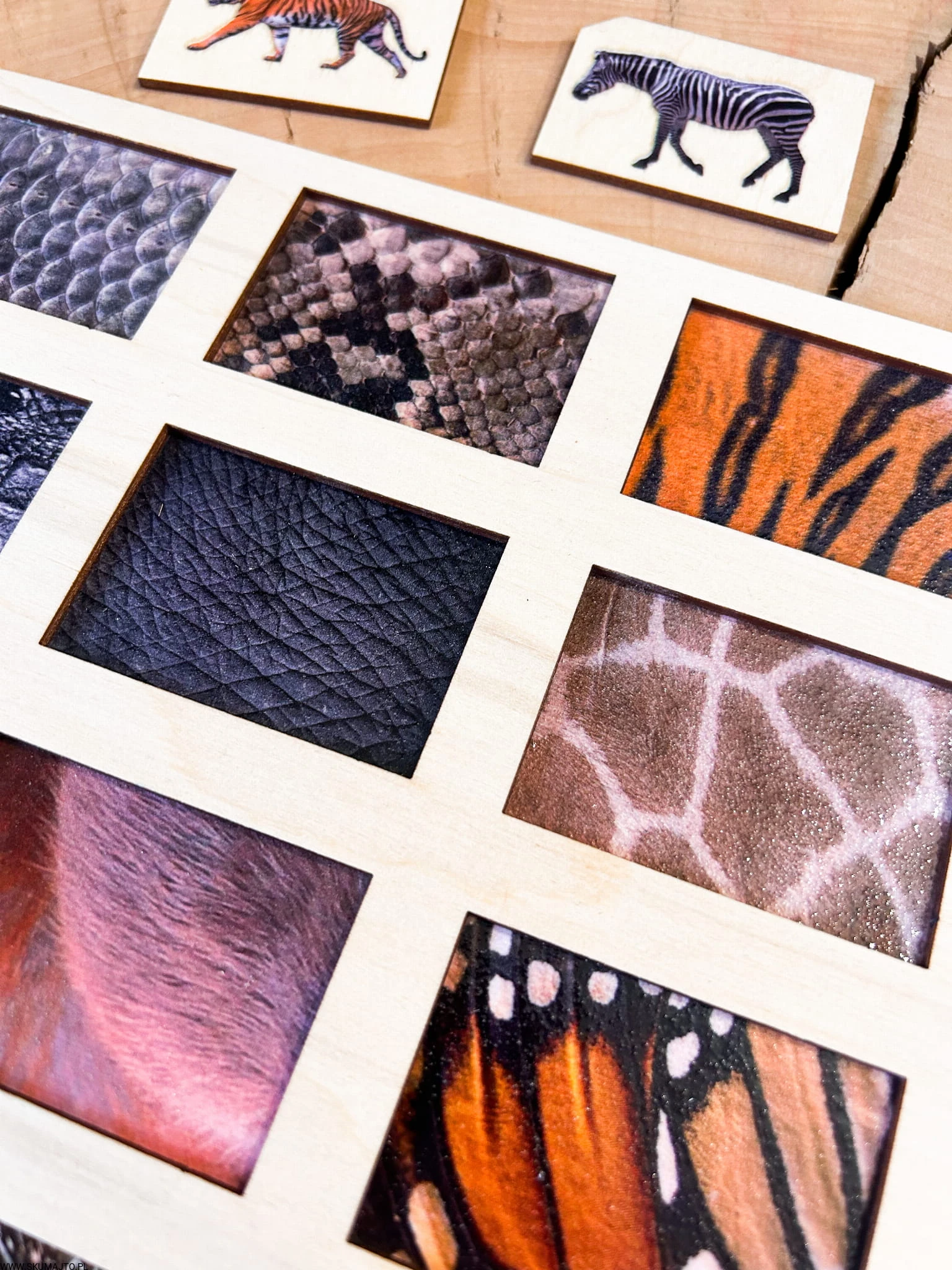 Zadaniem małych odkrywców jest zidentyfikowanie każdej z tych fascynujących tekstur i dopasowanie do nich odpowiedniego zwierzęcia. Od pasków zebry, przez barwne pióra pawia, po łuski ryb – ta układanka to prawdziwe wyzwanie, które pobudza zmysły i rozwija umiejętności poznawcze.