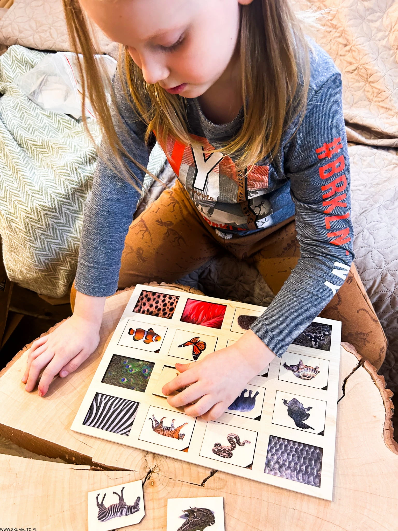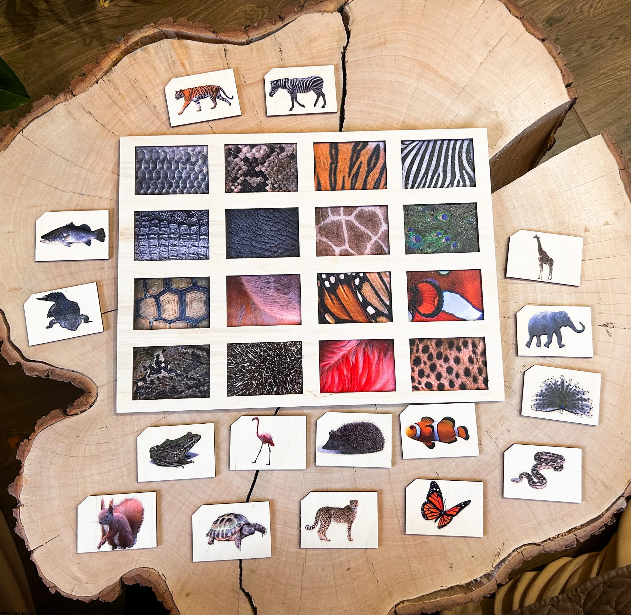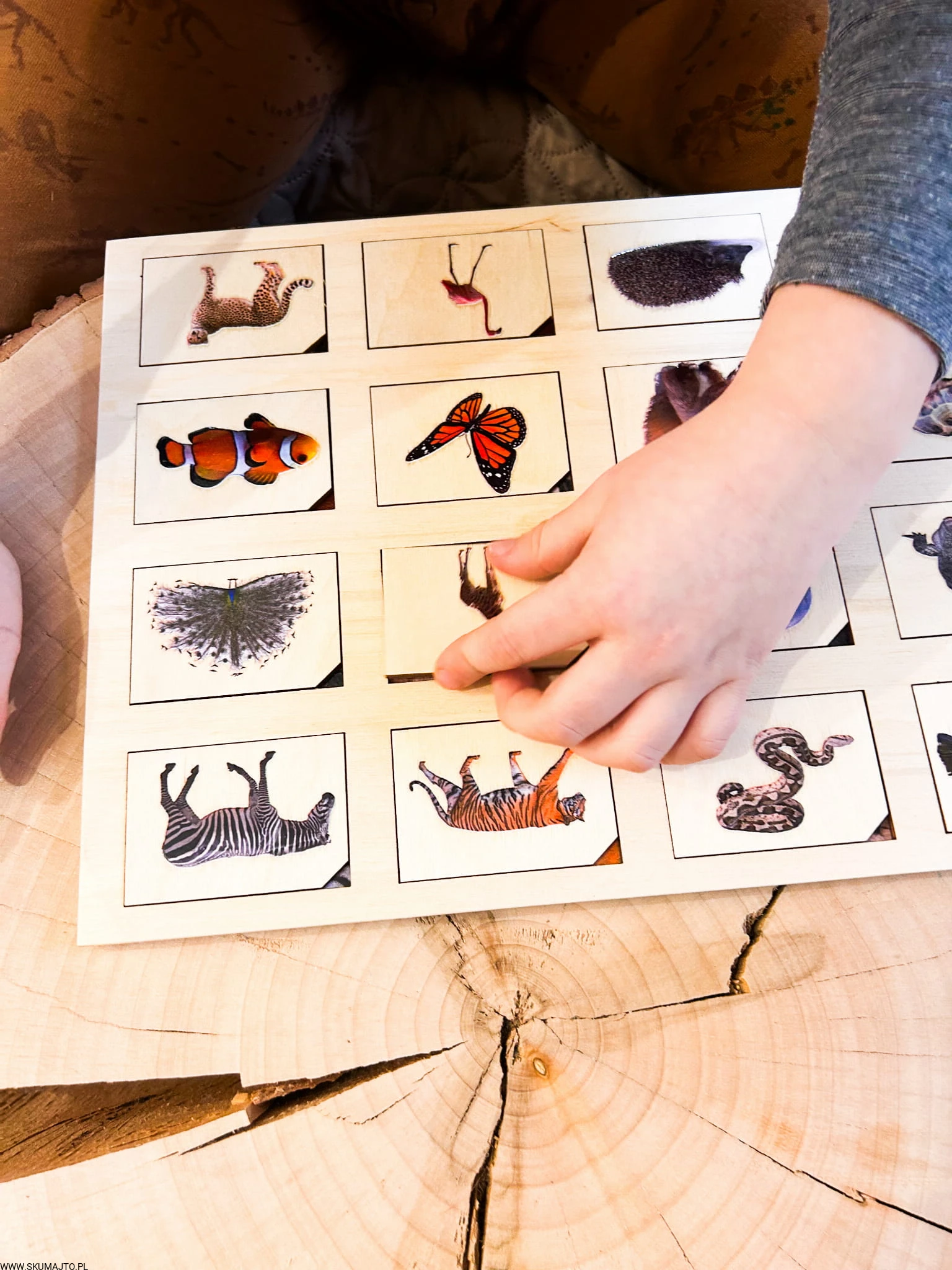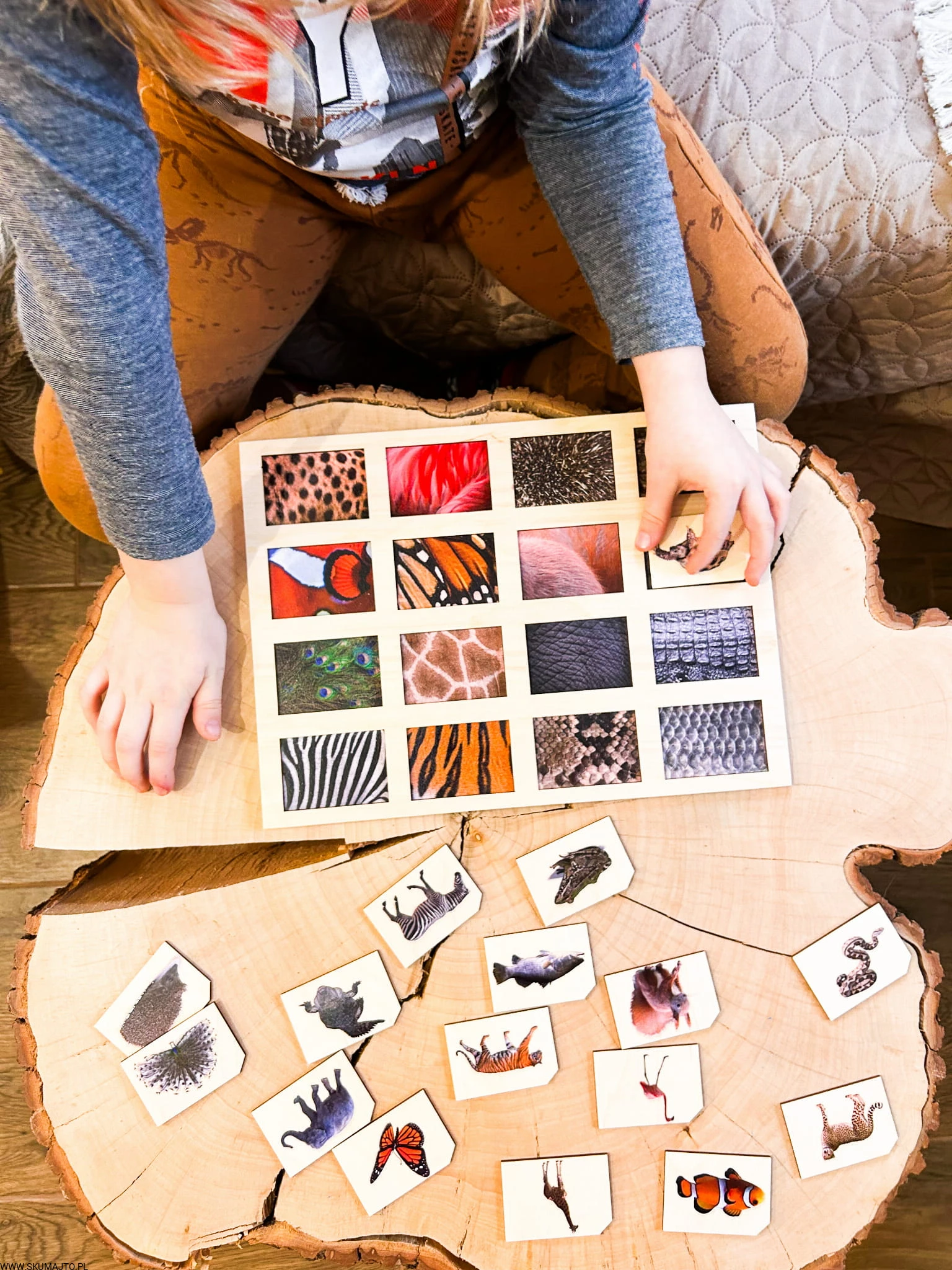 Zadaniem małych odkrywców jest zidentyfikowanie każdej z tych fascynujących tekstur i dopasowanie do nich odpowiedniego zwierzęcia. Od pasków zebry, przez barwne pióra pawia, po łuski ryb – ta układanka to prawdziwe wyzwanie, które pobudza zmysły i rozwija umiejętności poznawcze.