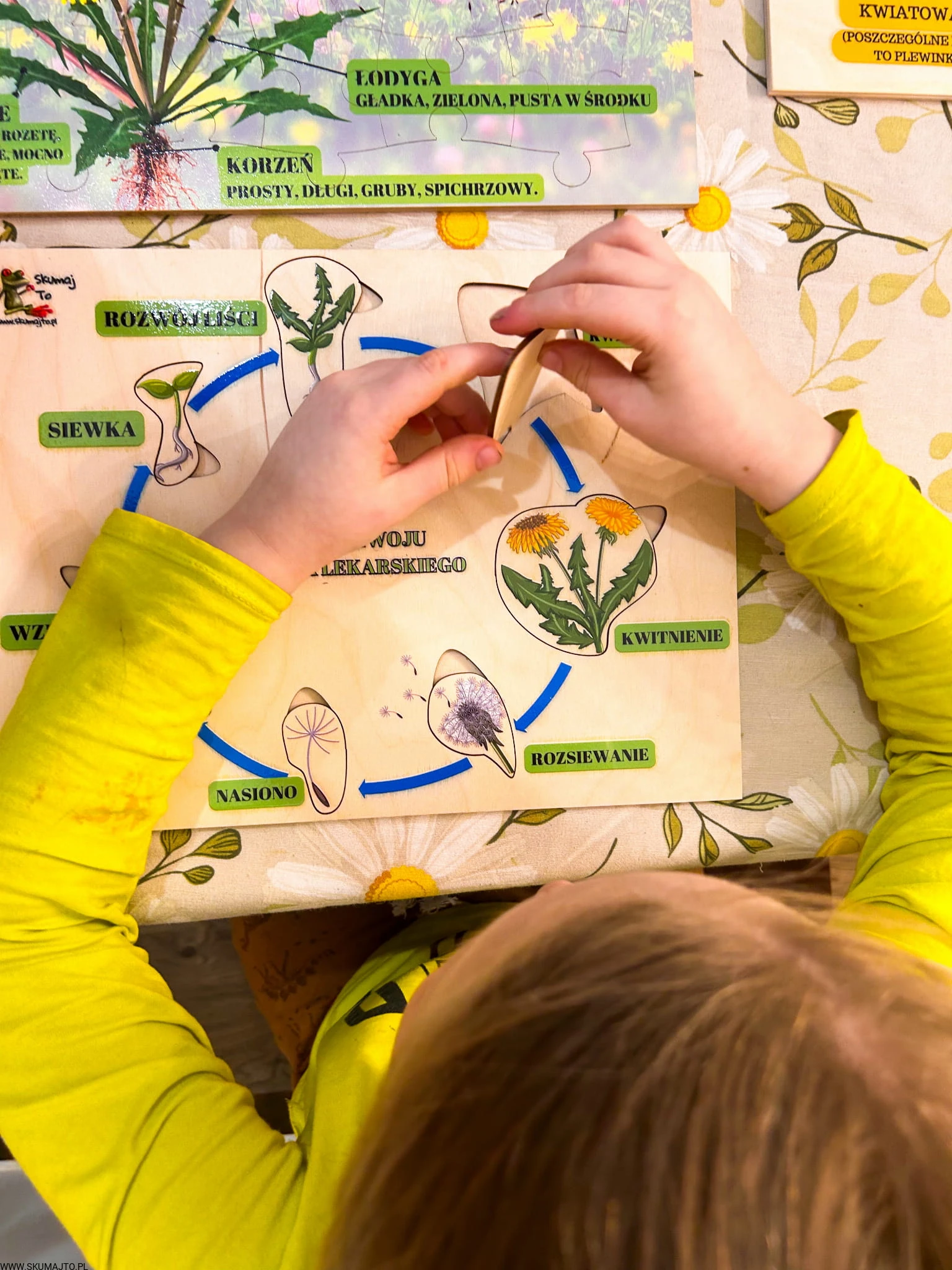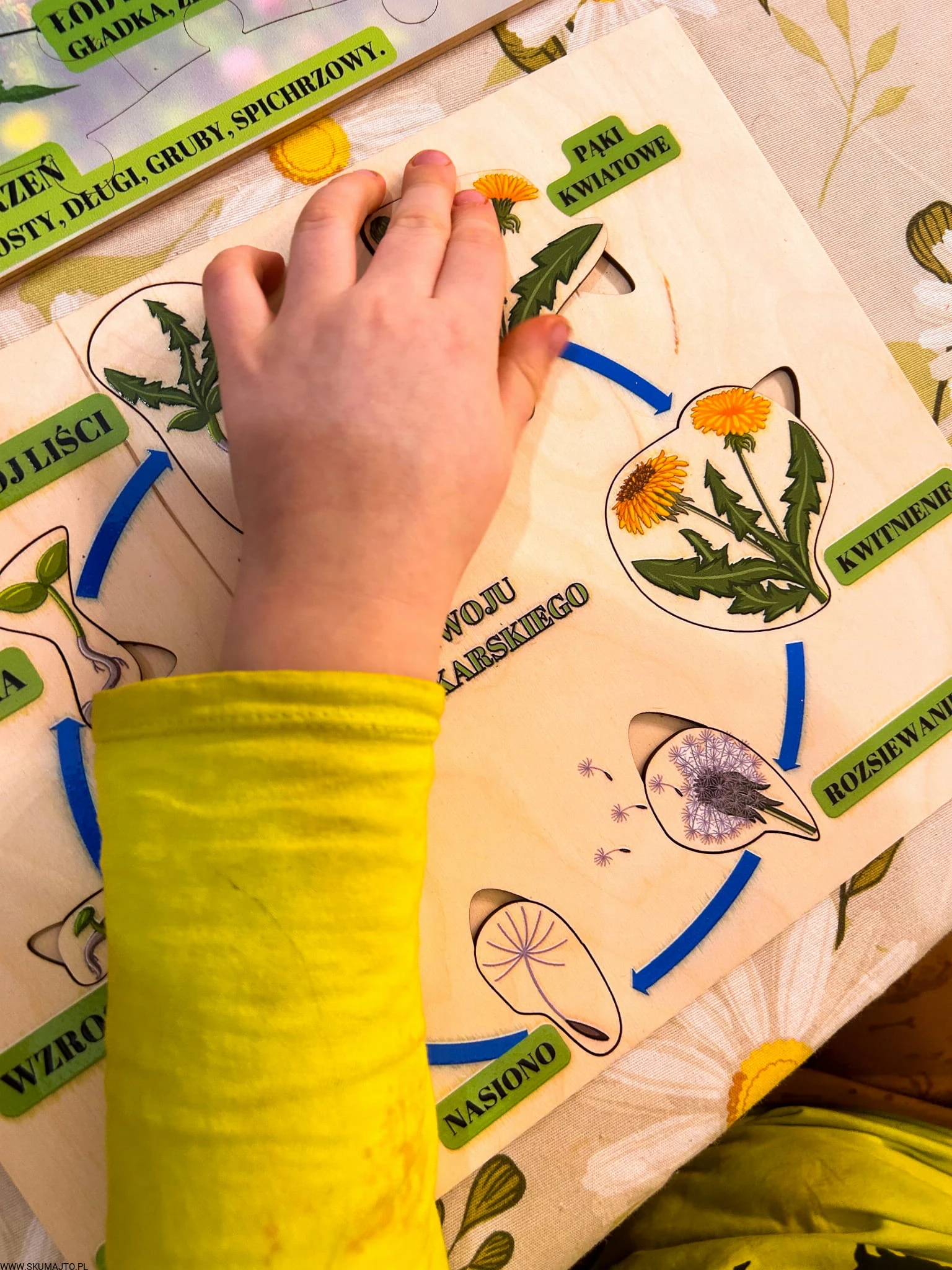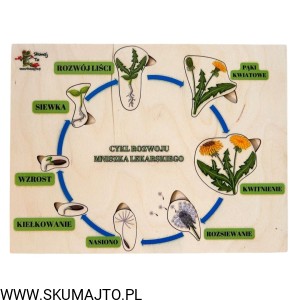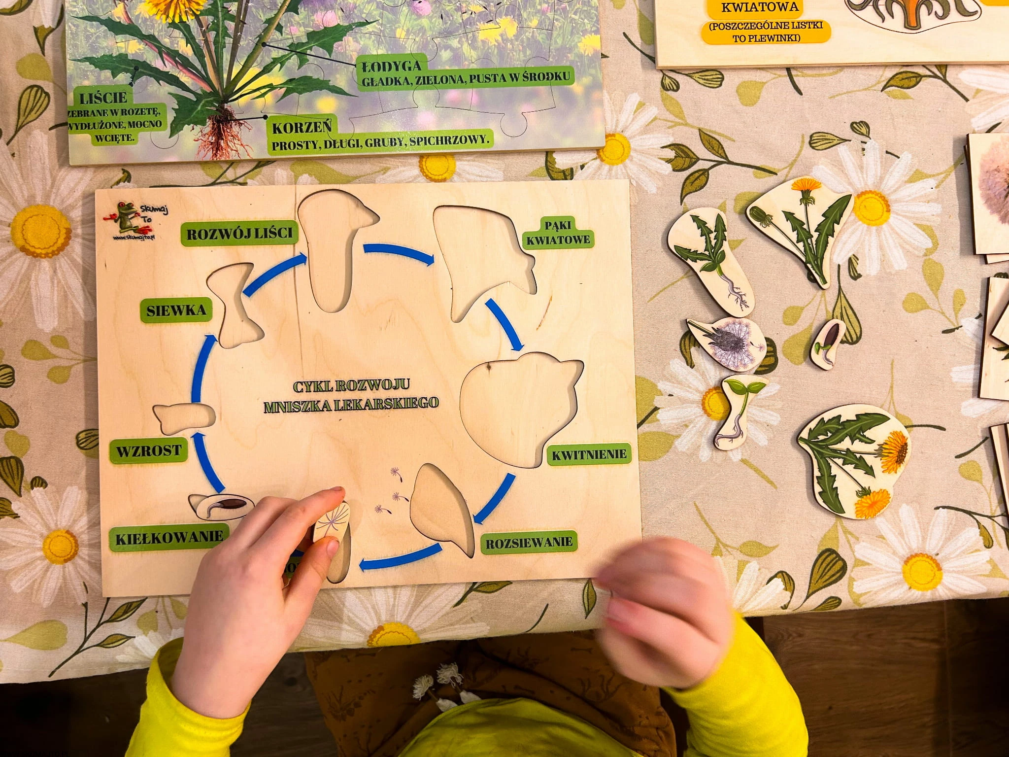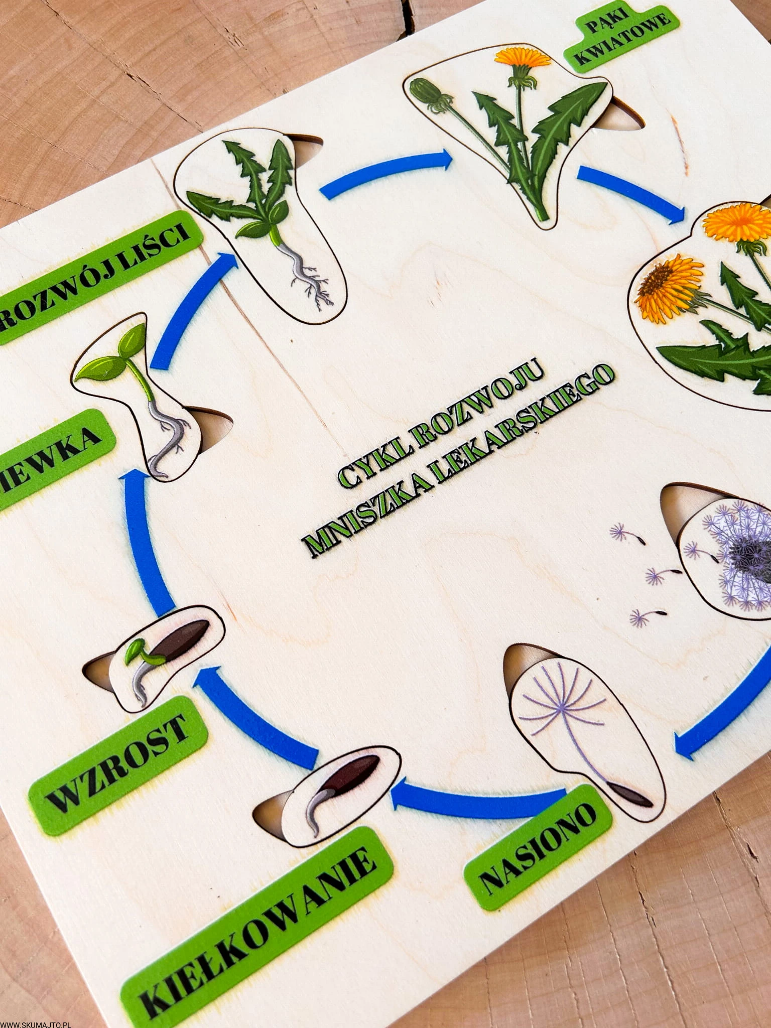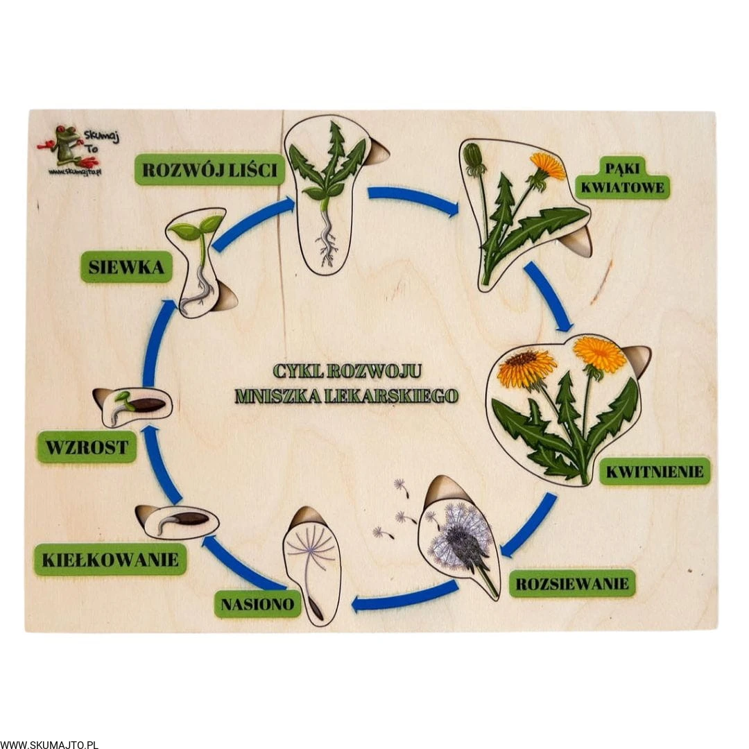 Rozwój mniszka lekarskiego drewniana układanka, cykl rozwoju mniszka