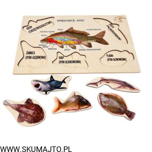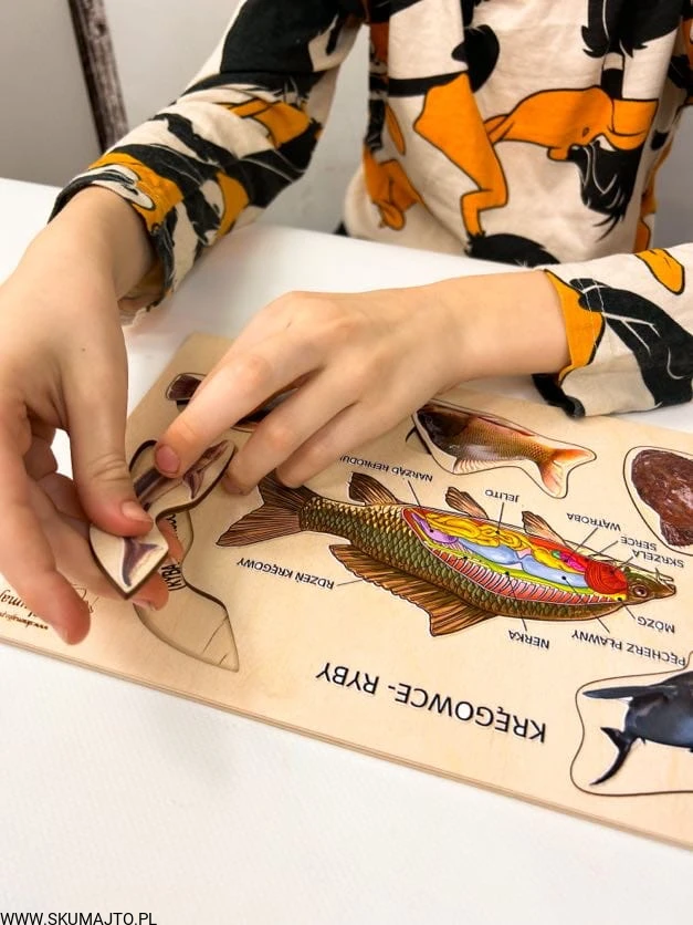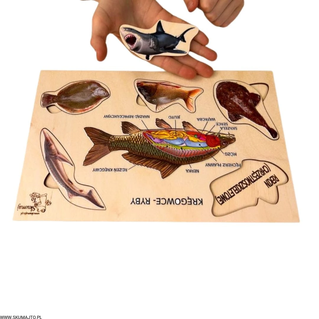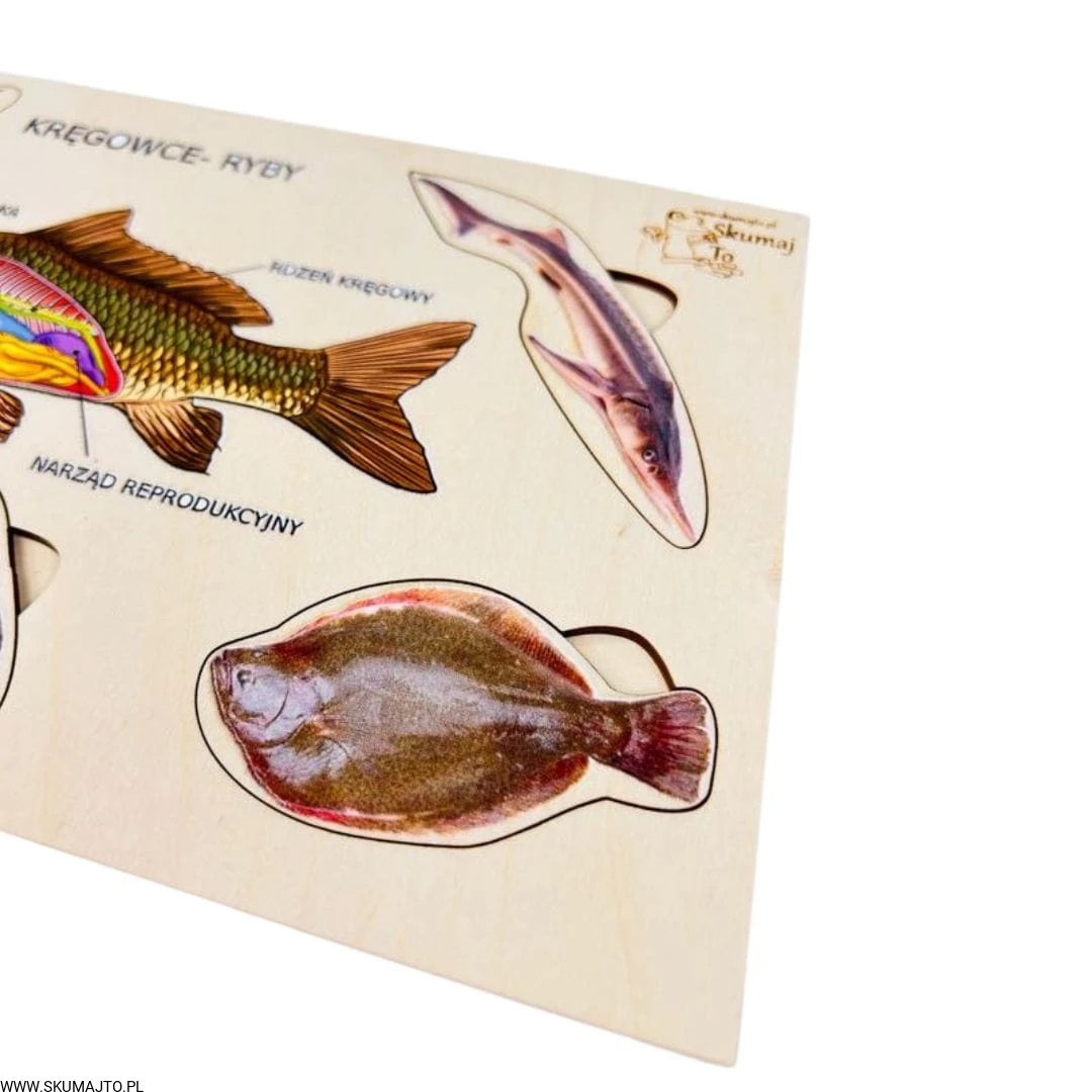 Ryby, drewniana układanka, ciekawostki o rybach, pomoc biologiczna