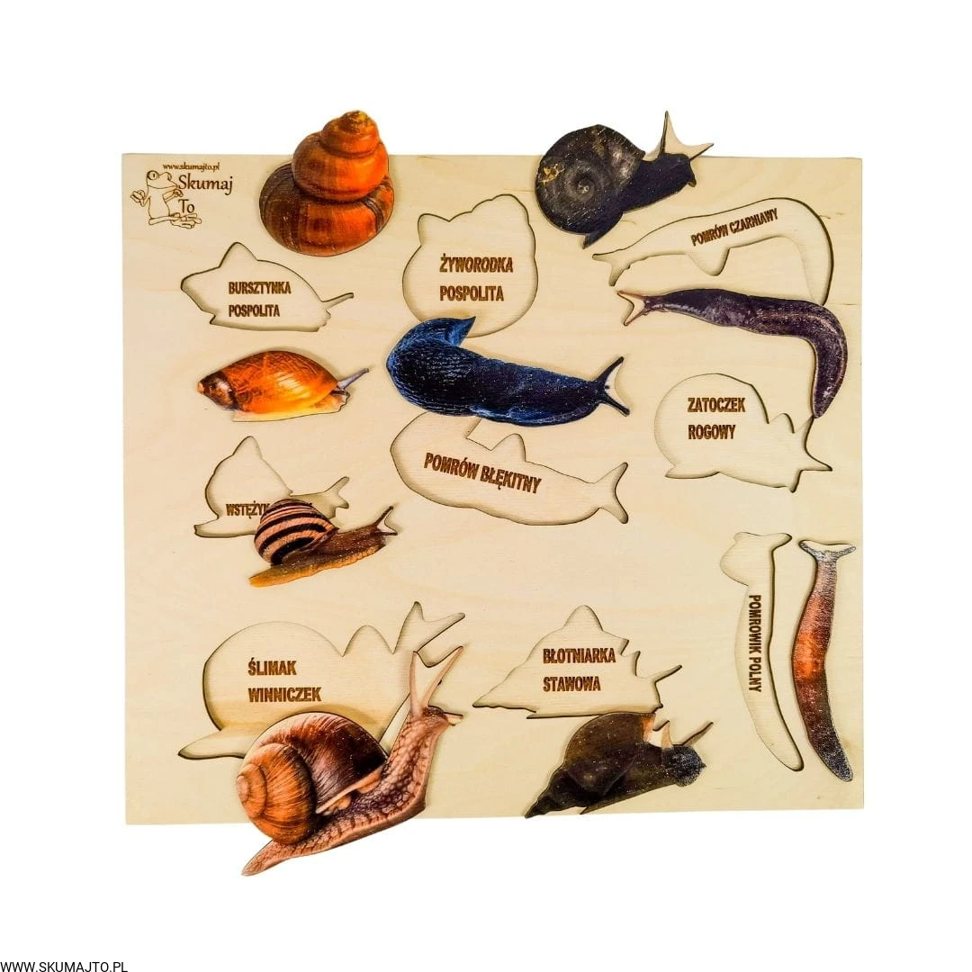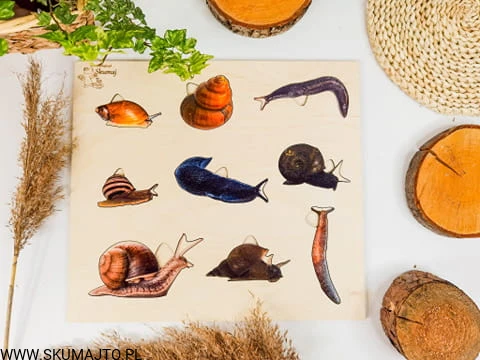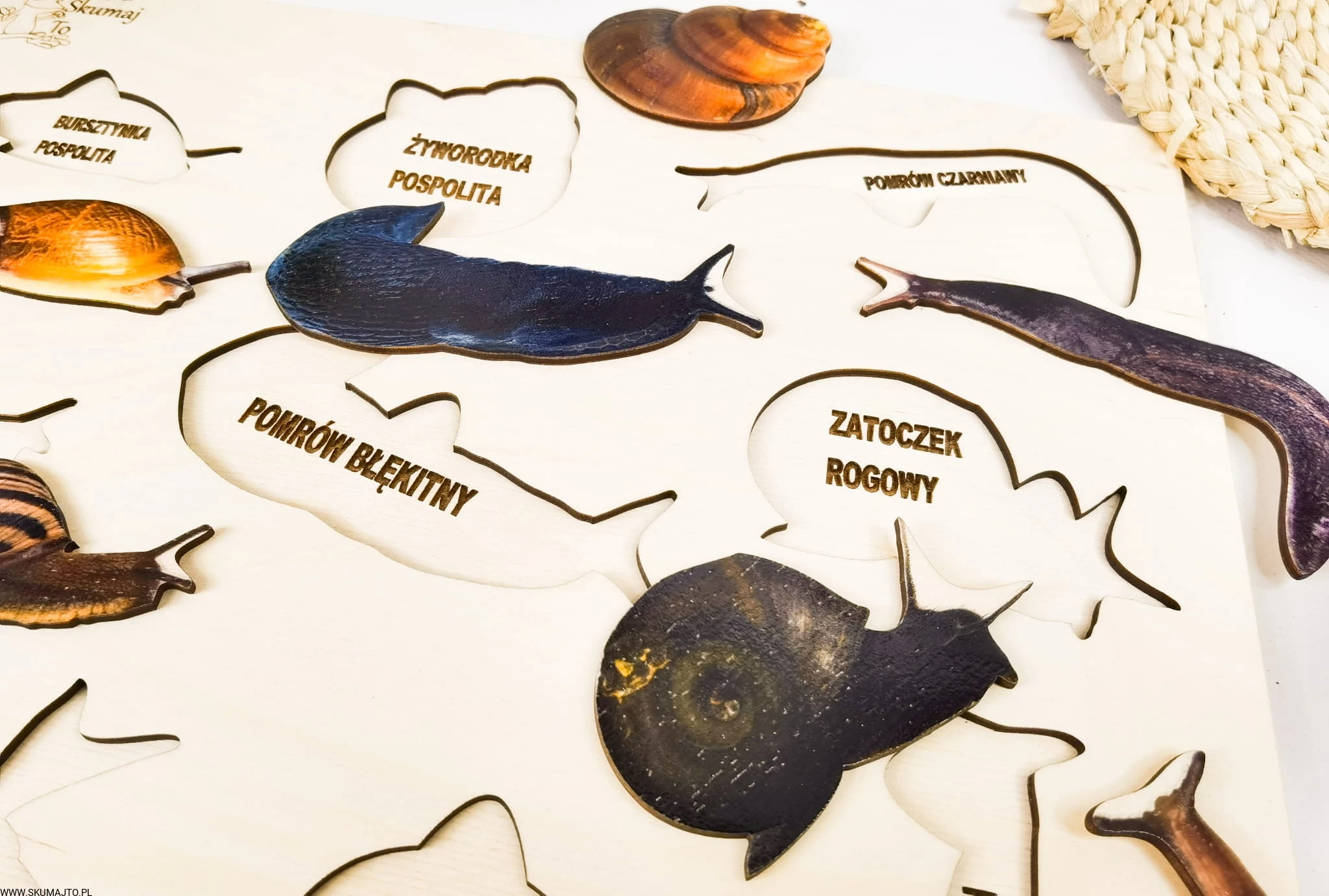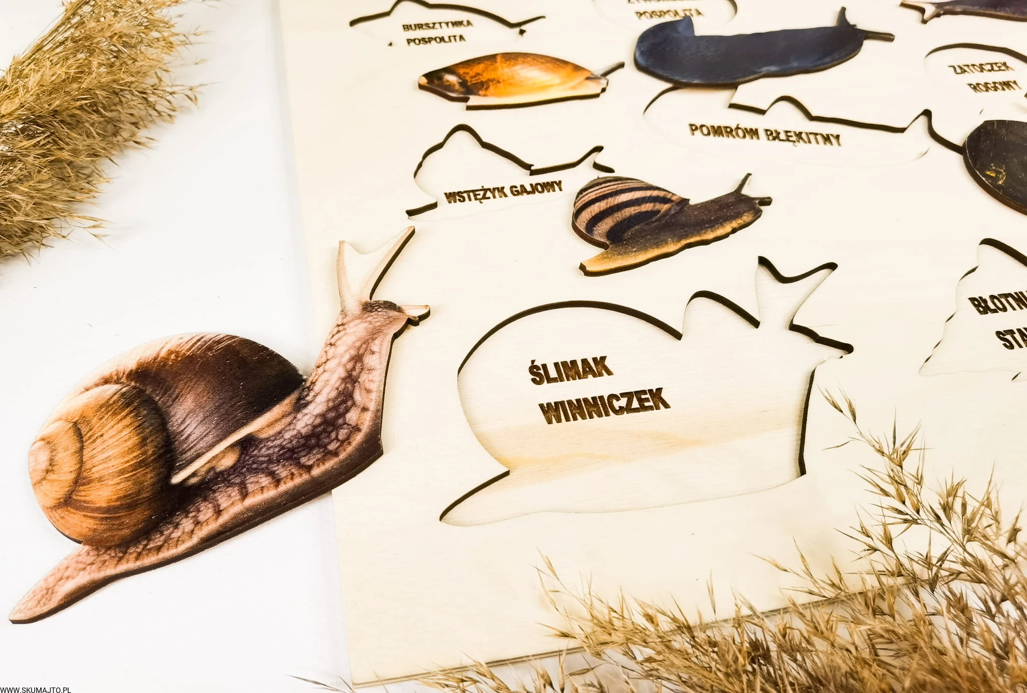 Ślimaki, drewniana układanka, gatunki ślimaków