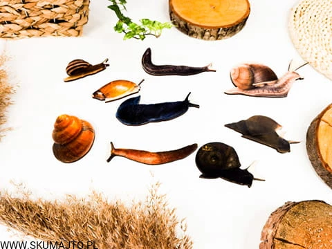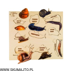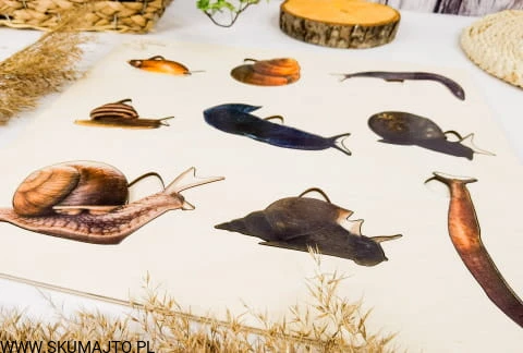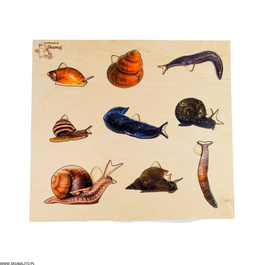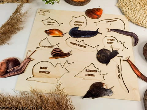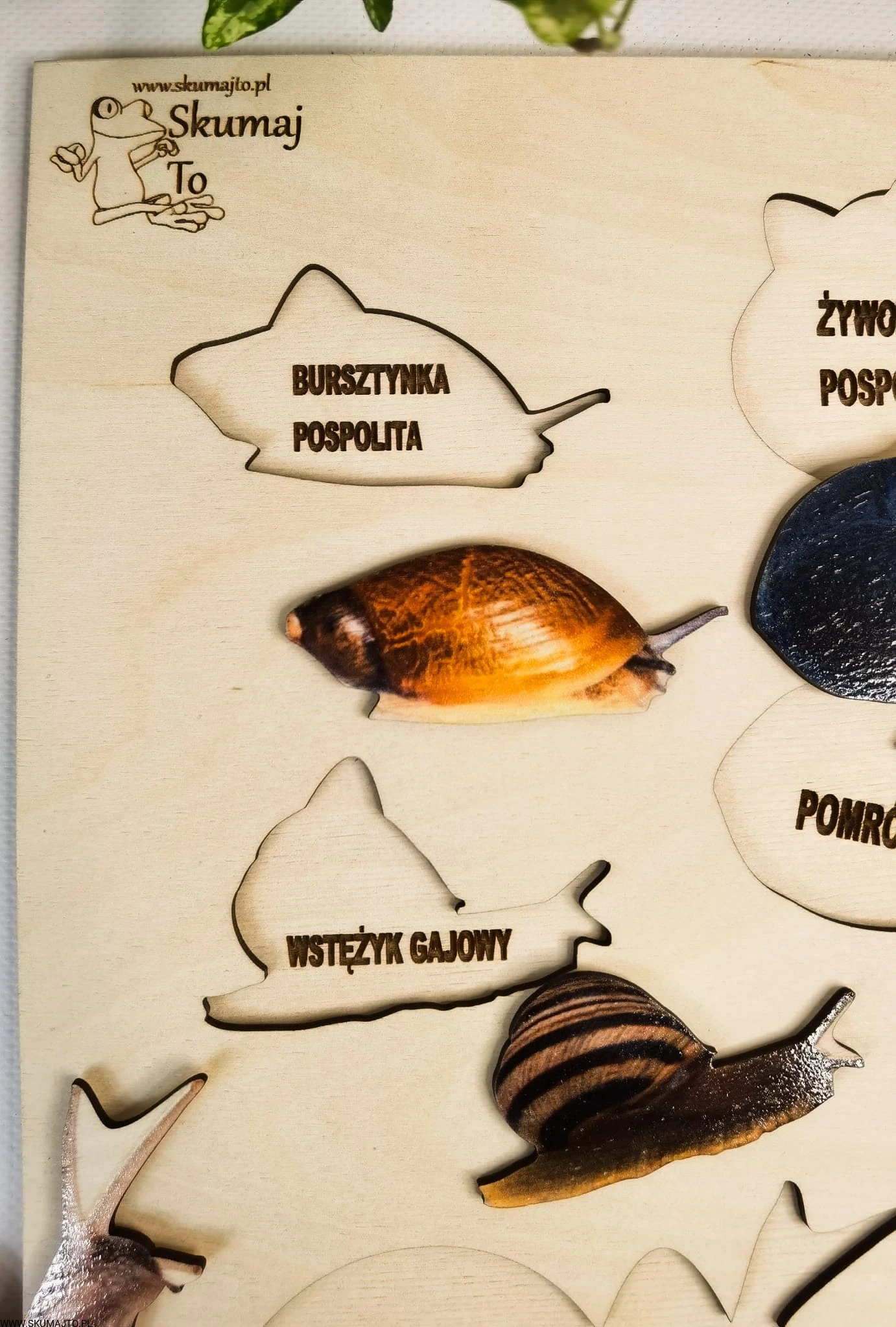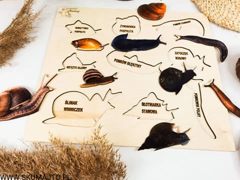 Ślimaki, drewniana układanka, gatunki ślimaków