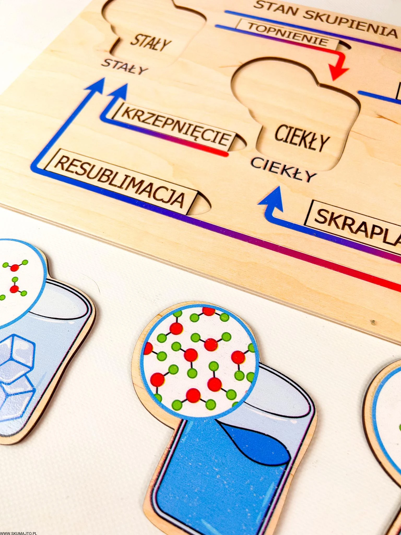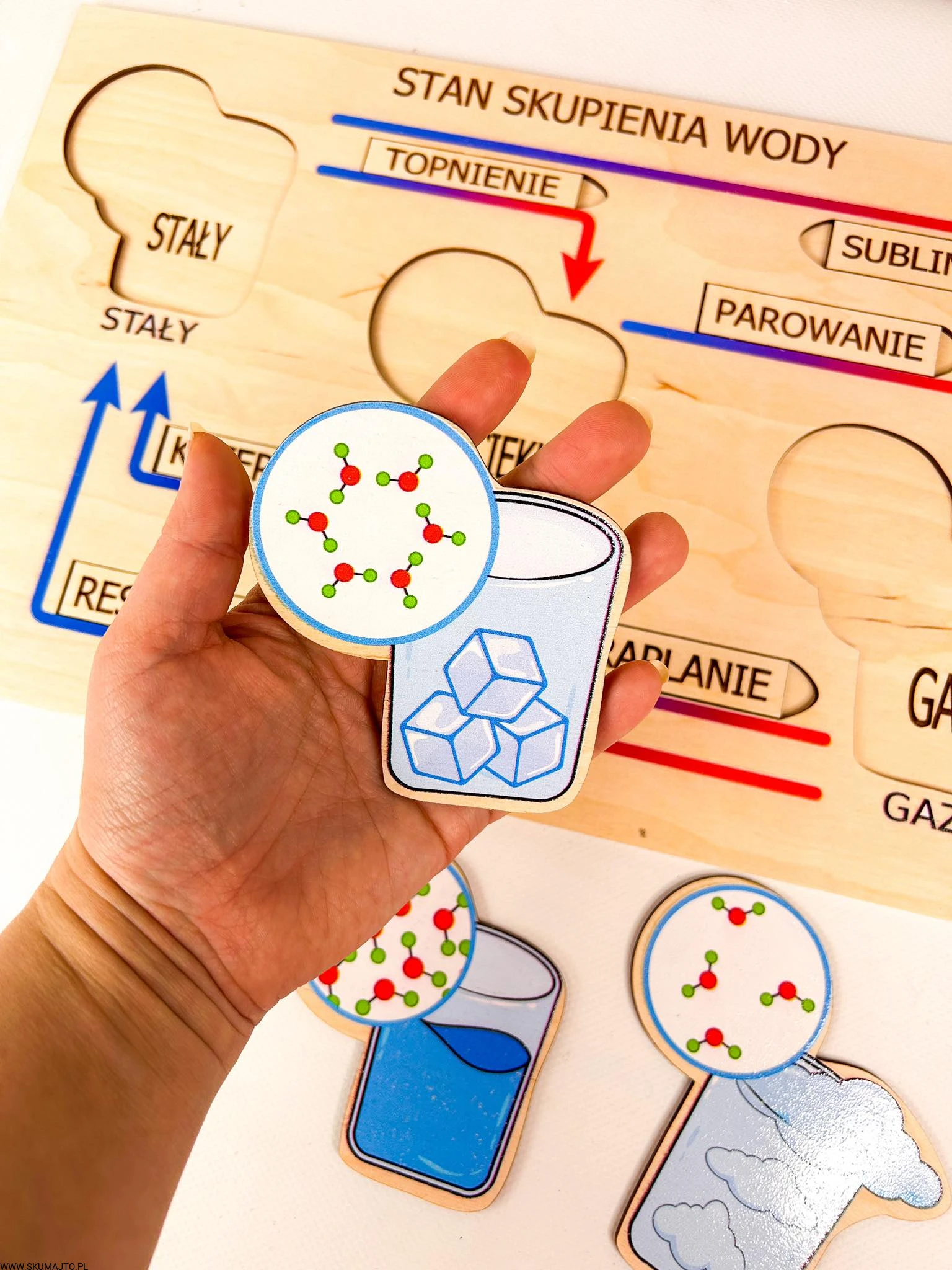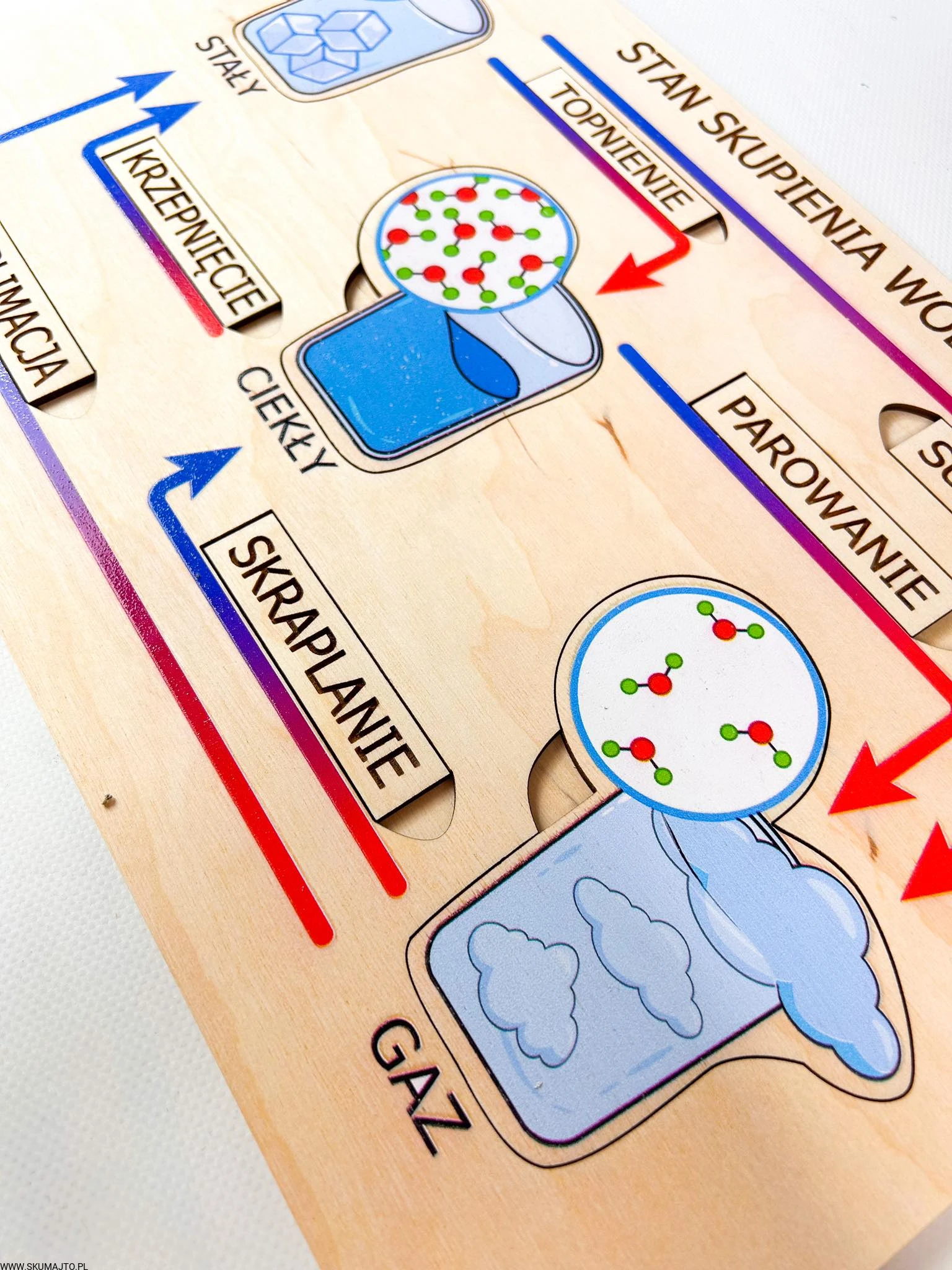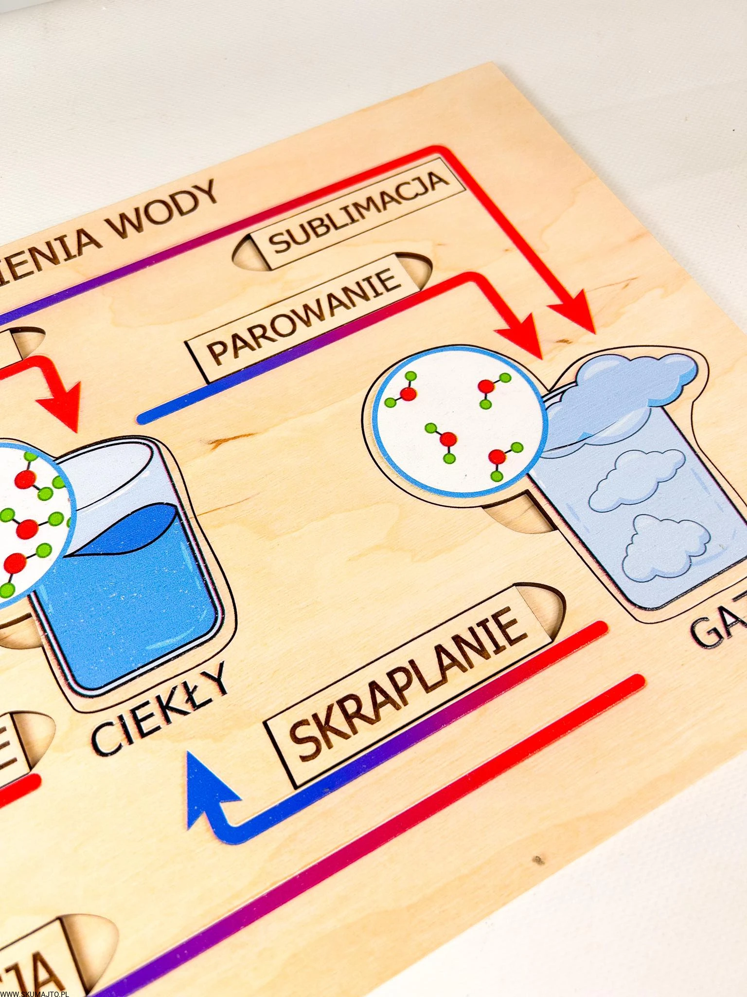 Układanka składa się z ruchomych elementów, które przedstawiają poszczególne stany skupienia wody oraz procesy przejściowe, takie jak parowanie i kondensacja. To doskonałe narzędzie do nauki poprzez zabawę.