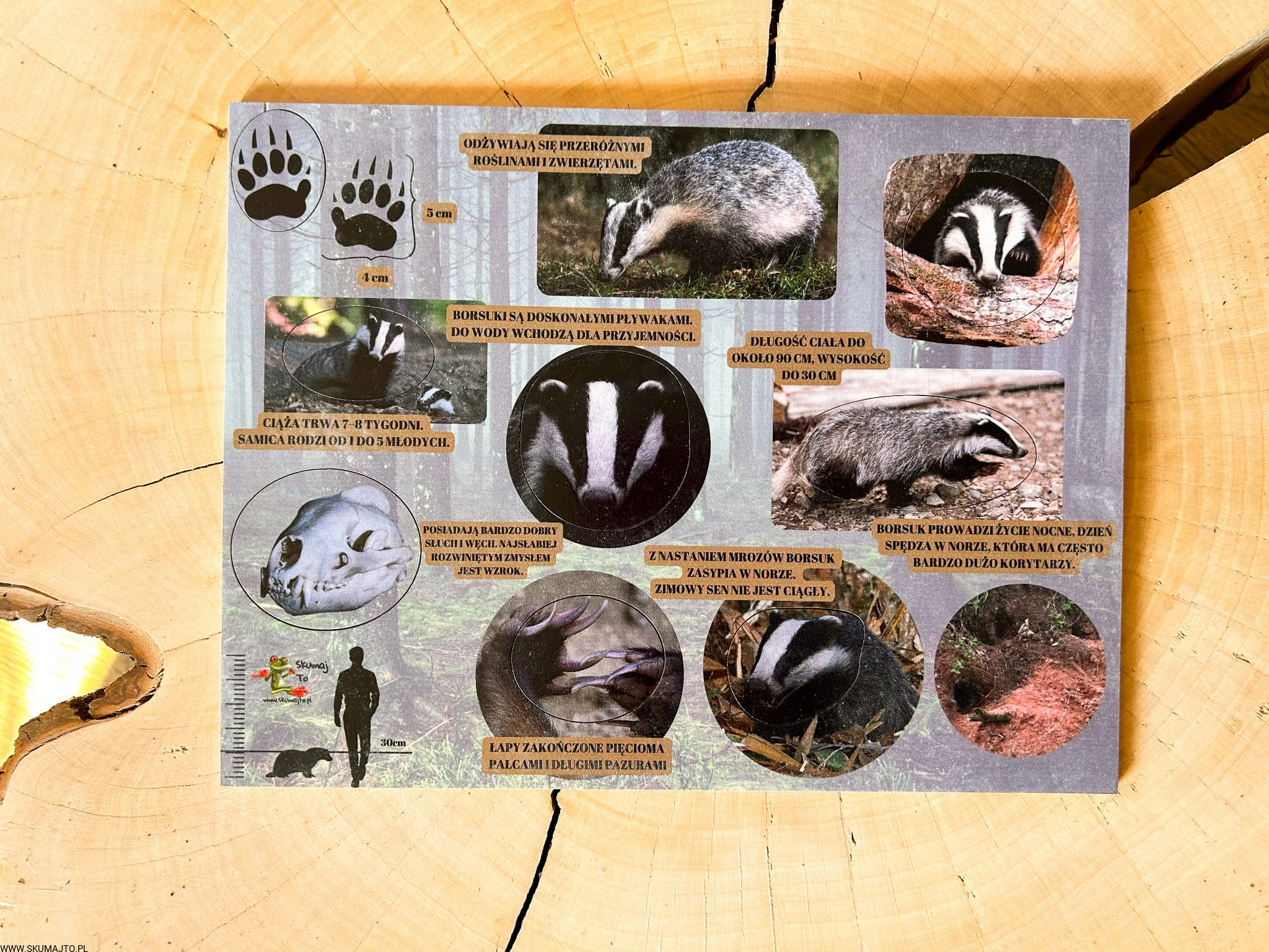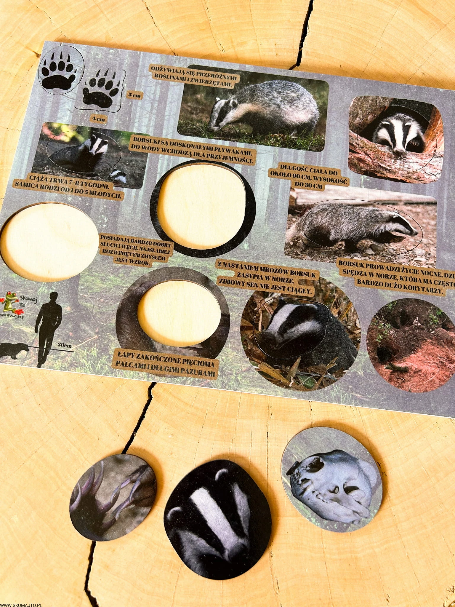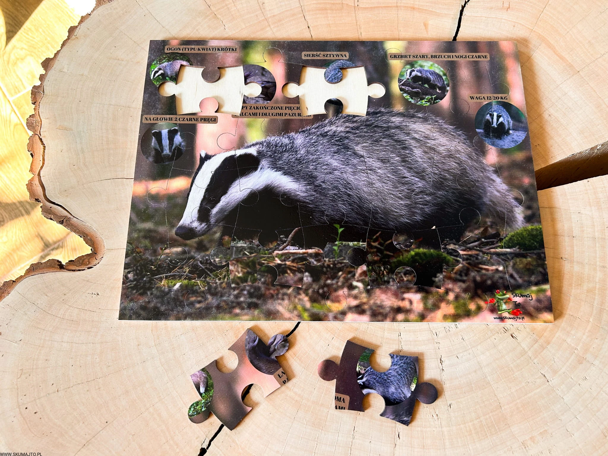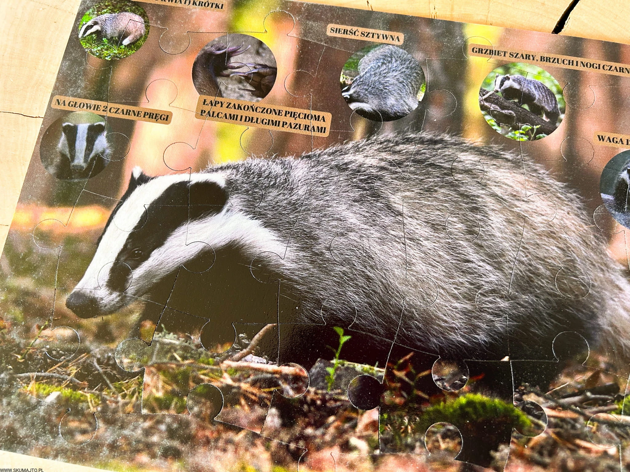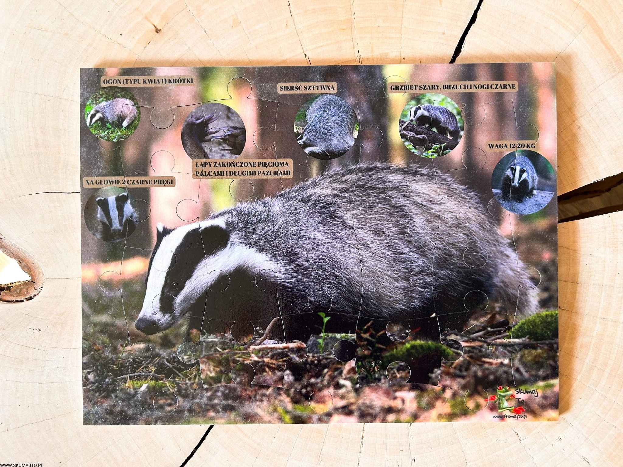 Świat borsuka, układanka drewniana, edukacja leśna, ciekawostki o borsuku