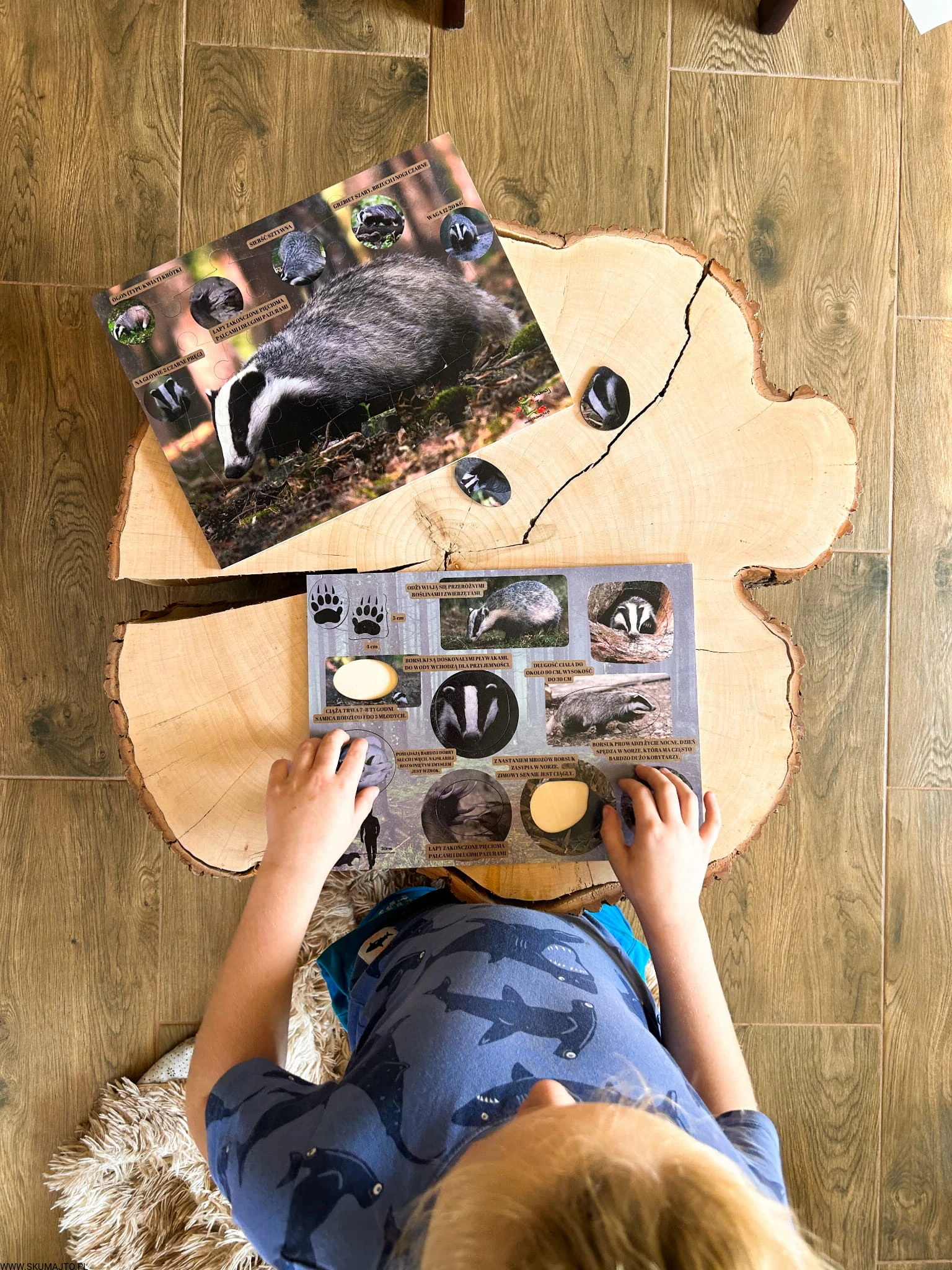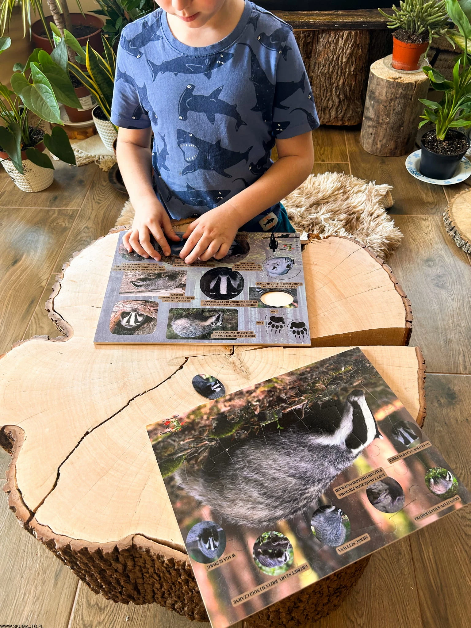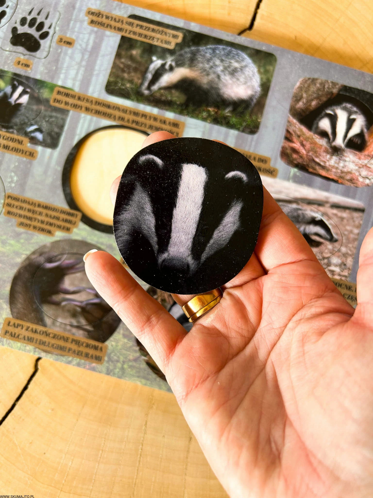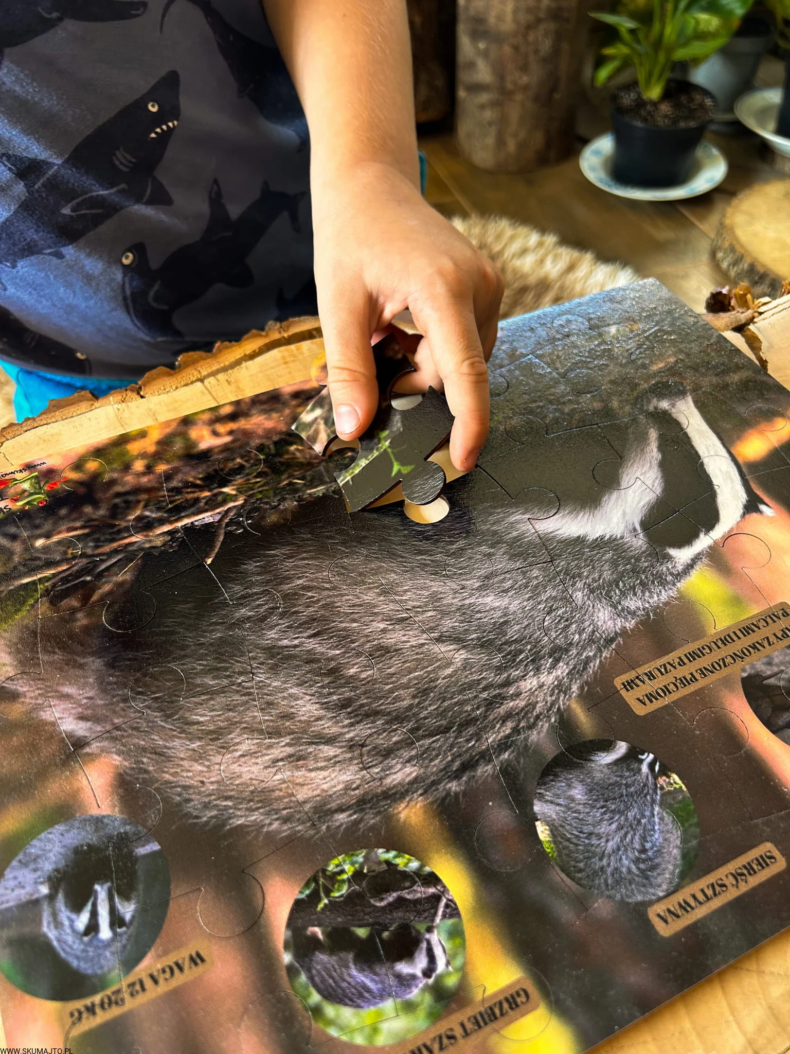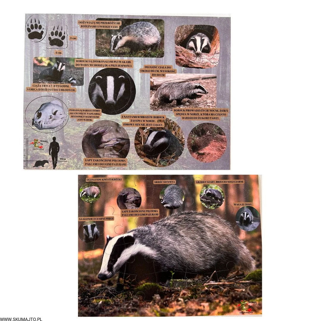 Świat borsuka, układanka drewniana, edukacja leśna, ciekawostki o borsuku