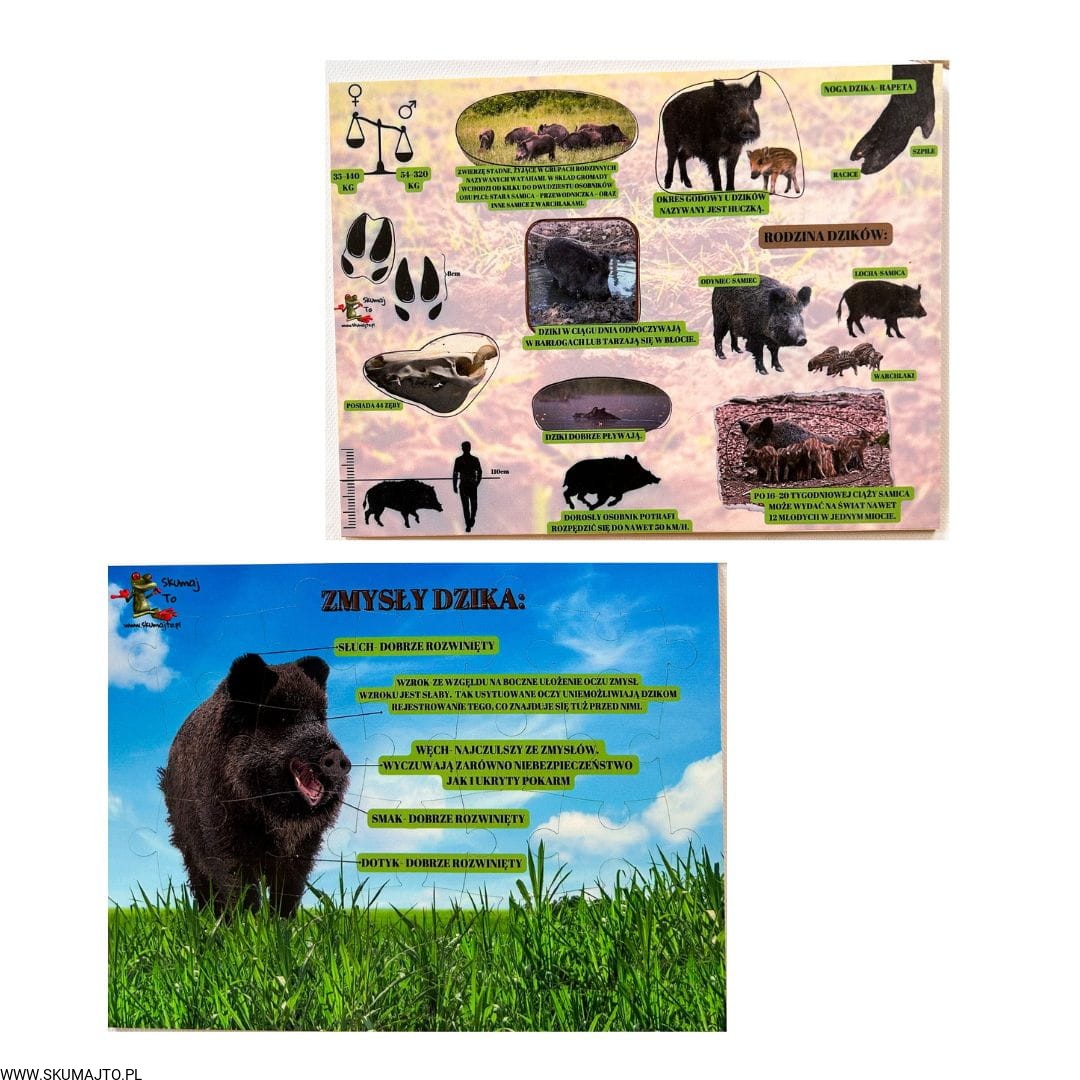 Dwustronna Plansza: Układanka zawiera dwie plansze - jedna to puzzle z pięknym obrazem dzika, które pobudzają wyobraźnię i rozwijają umiejętność rozwiązywania problemów. Druga plansza to pełen informacji przewodnik o dzikach, z ciekawostkami, zdjęciami i grafikami, które zaspokoją ciekawość każdego małego badacza przyrody.