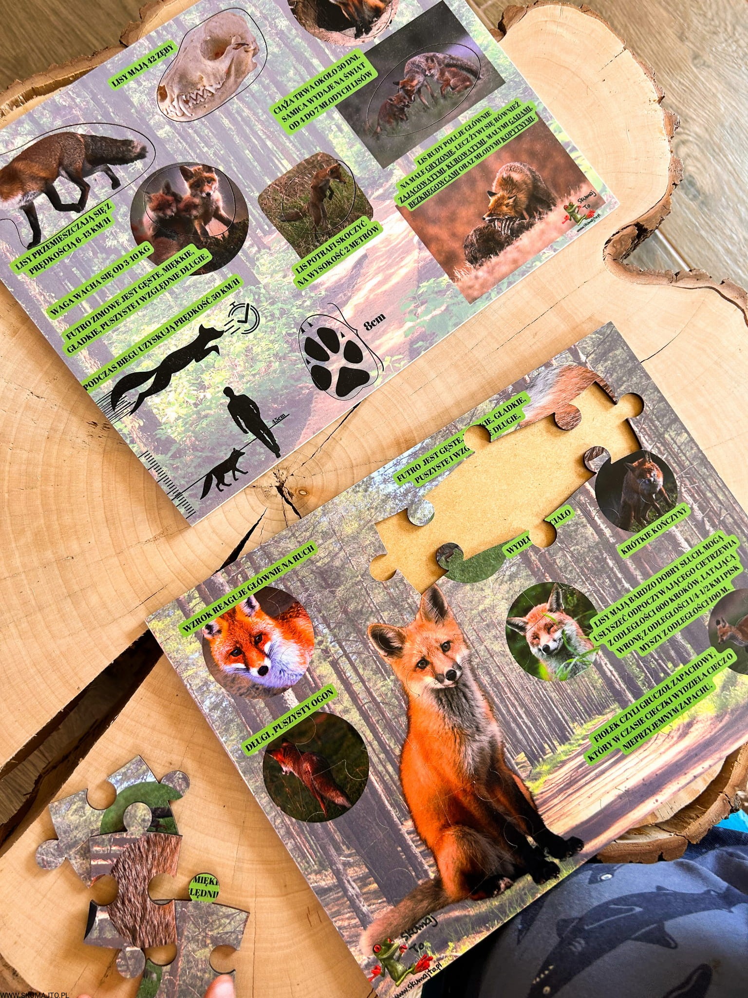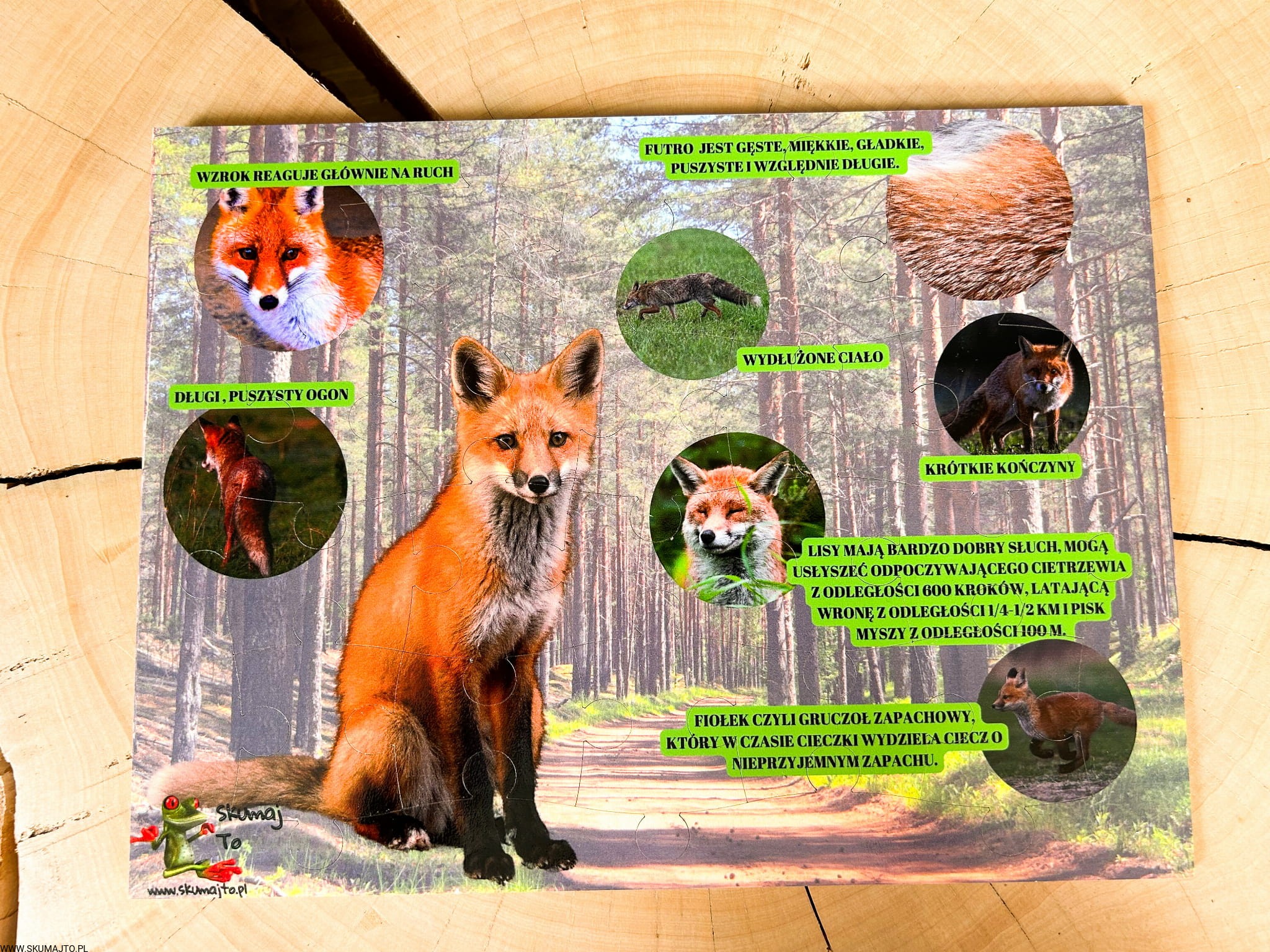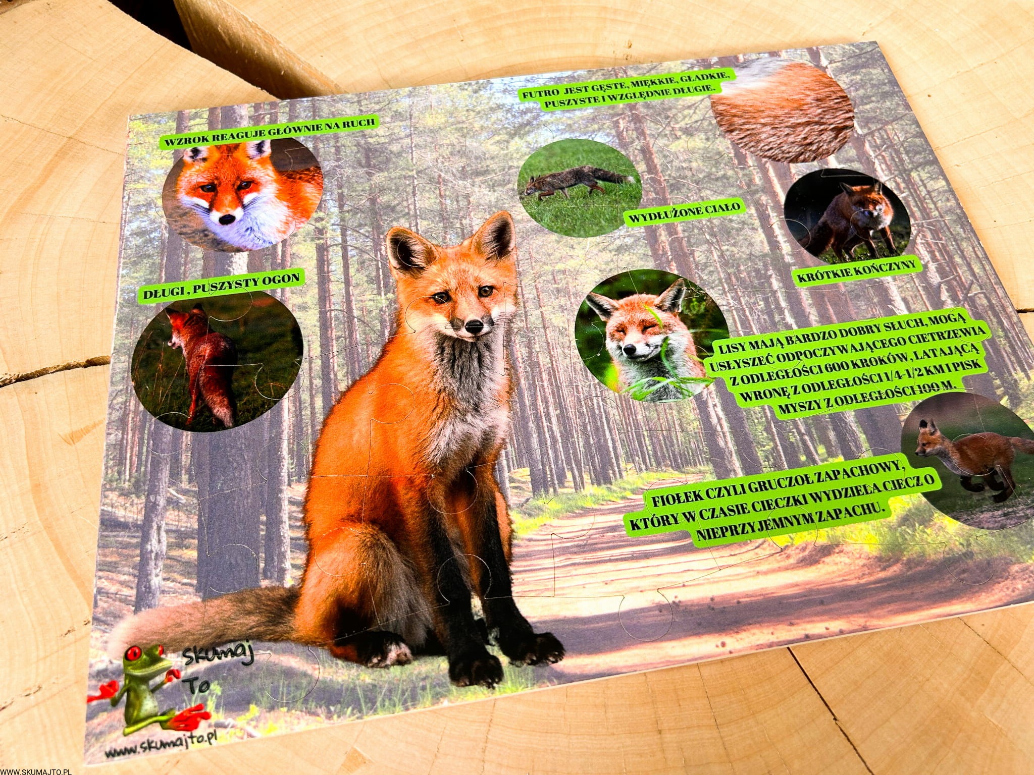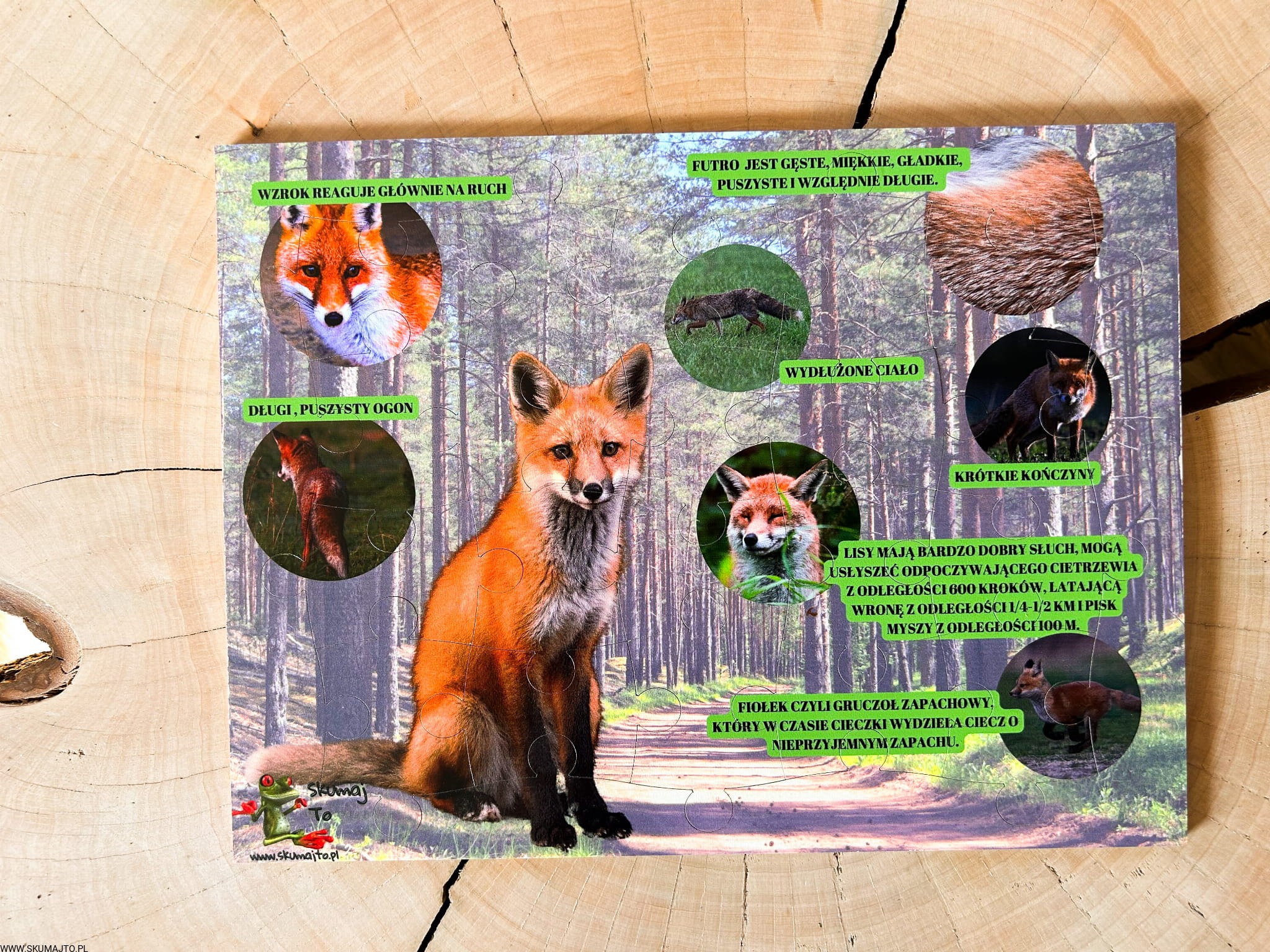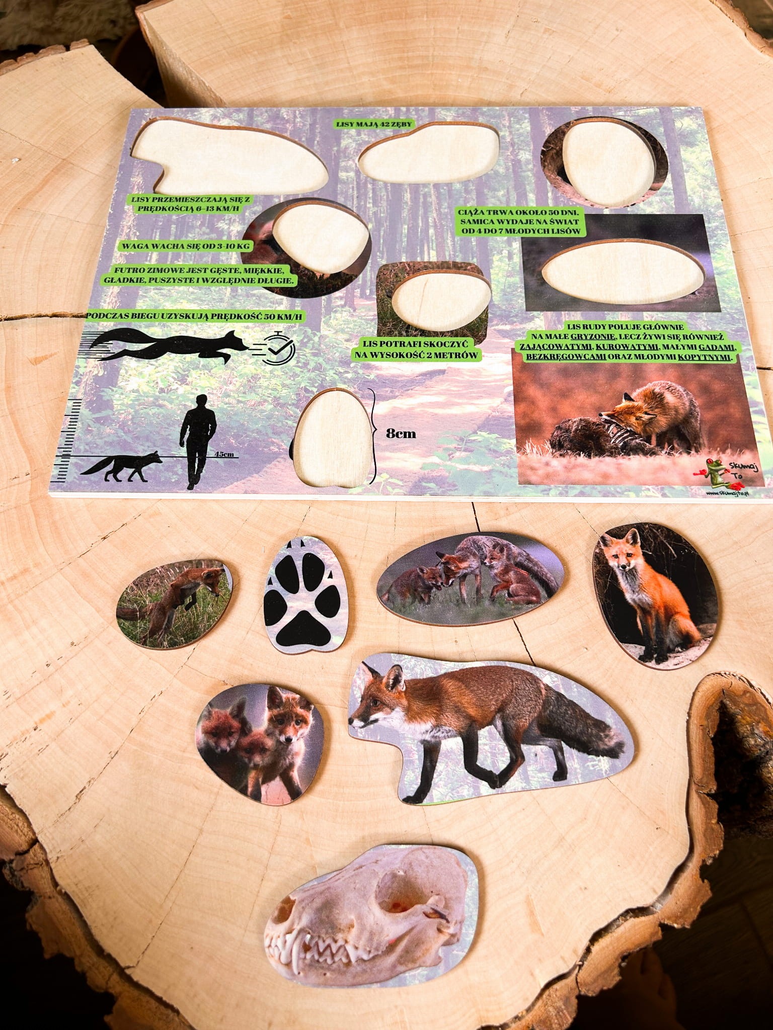 Świat lisa , układanka drewniana, edukacja leśna, ciekawostki o lisach