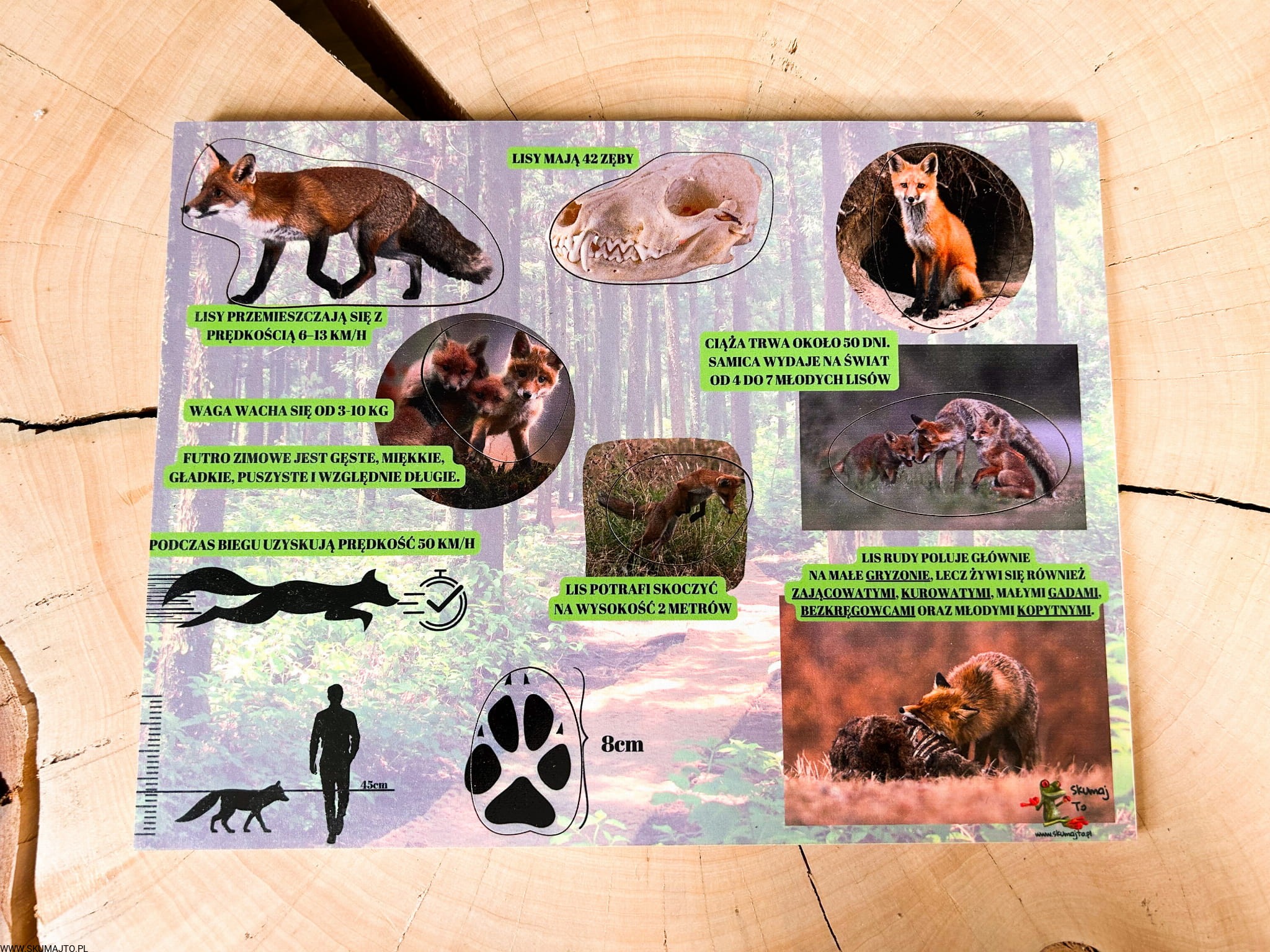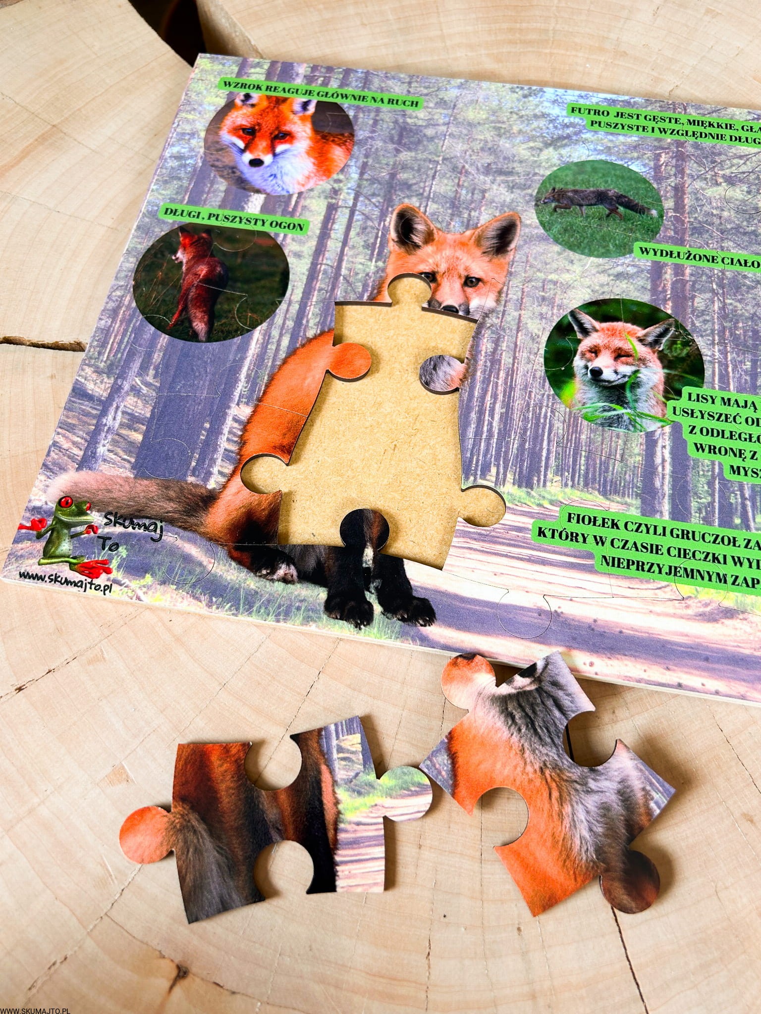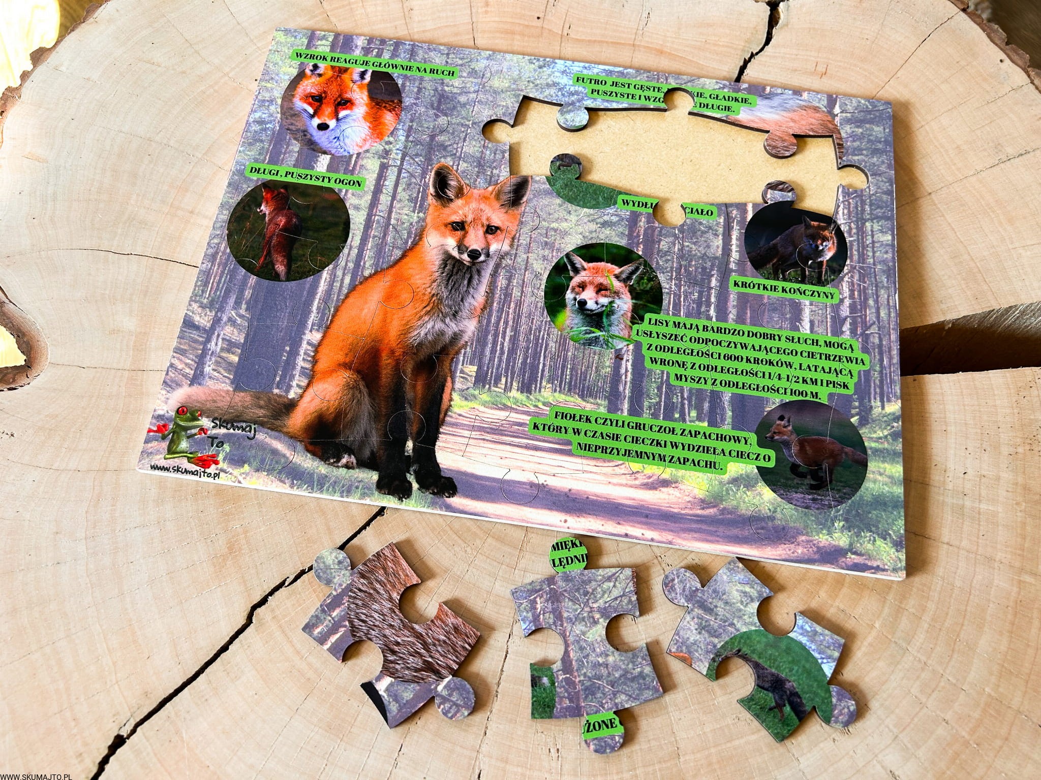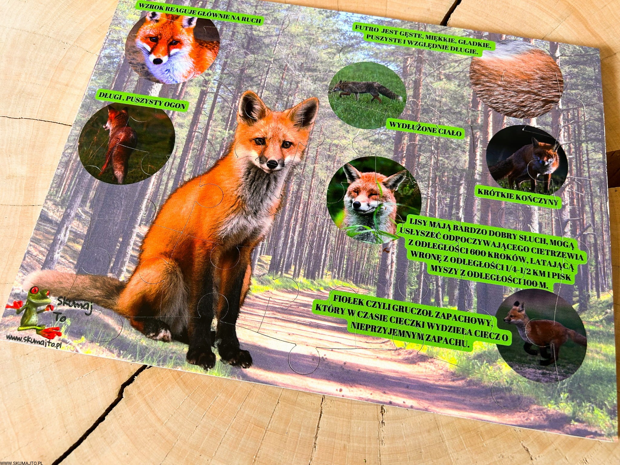Świat lisa , układanka drewniana, edukacja leśna, ciekawostki o lisach