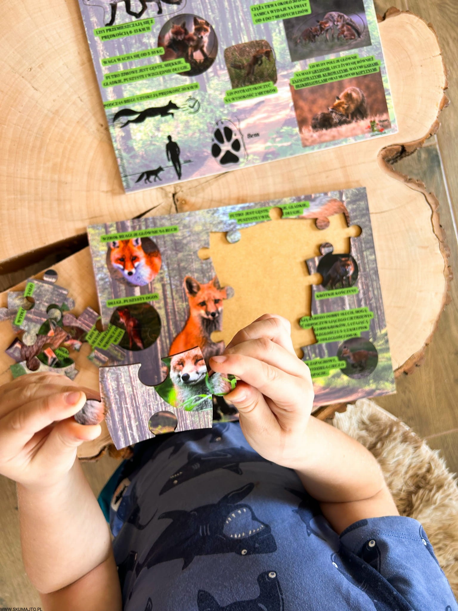 Dwie plansze w jednym: Nasza układanka składa się z dwóch plansz. Pierwsza to puzzle z obrazem lisa, które dzieci mogą samodzielnie układać, rozwijając umiejętności motoryczne i logiczne. Druga plansza to źródło wiedzy o lisach, zawierająca ciekawostki, informacje o ich zwyczajach i środowisku życia.