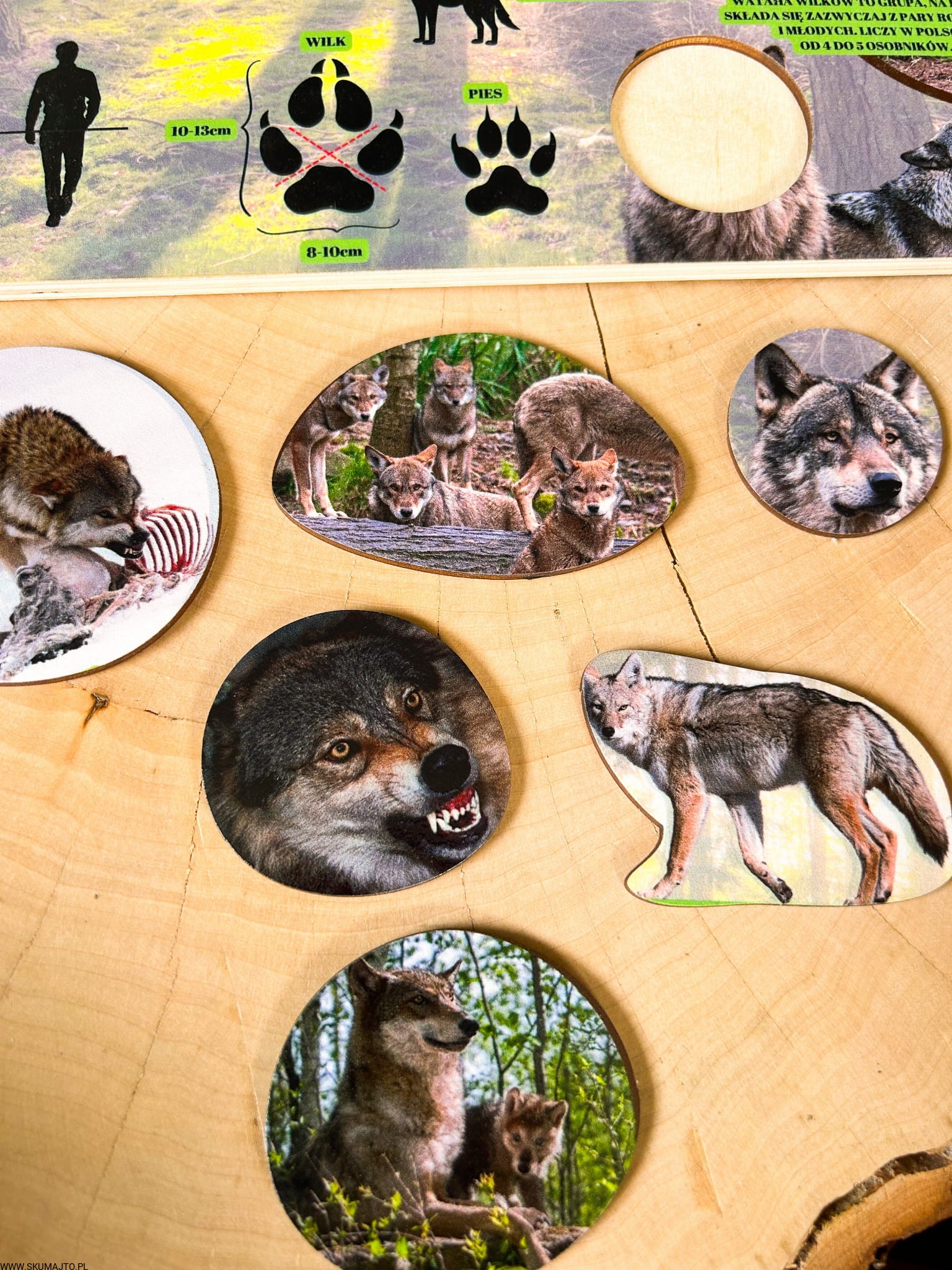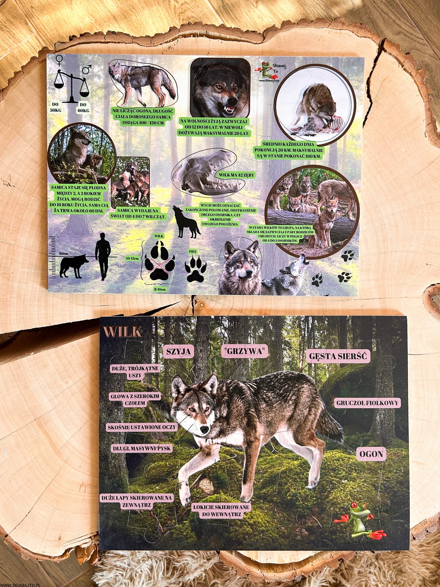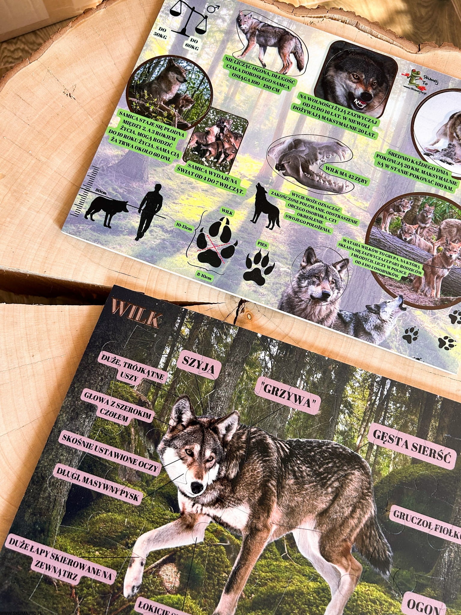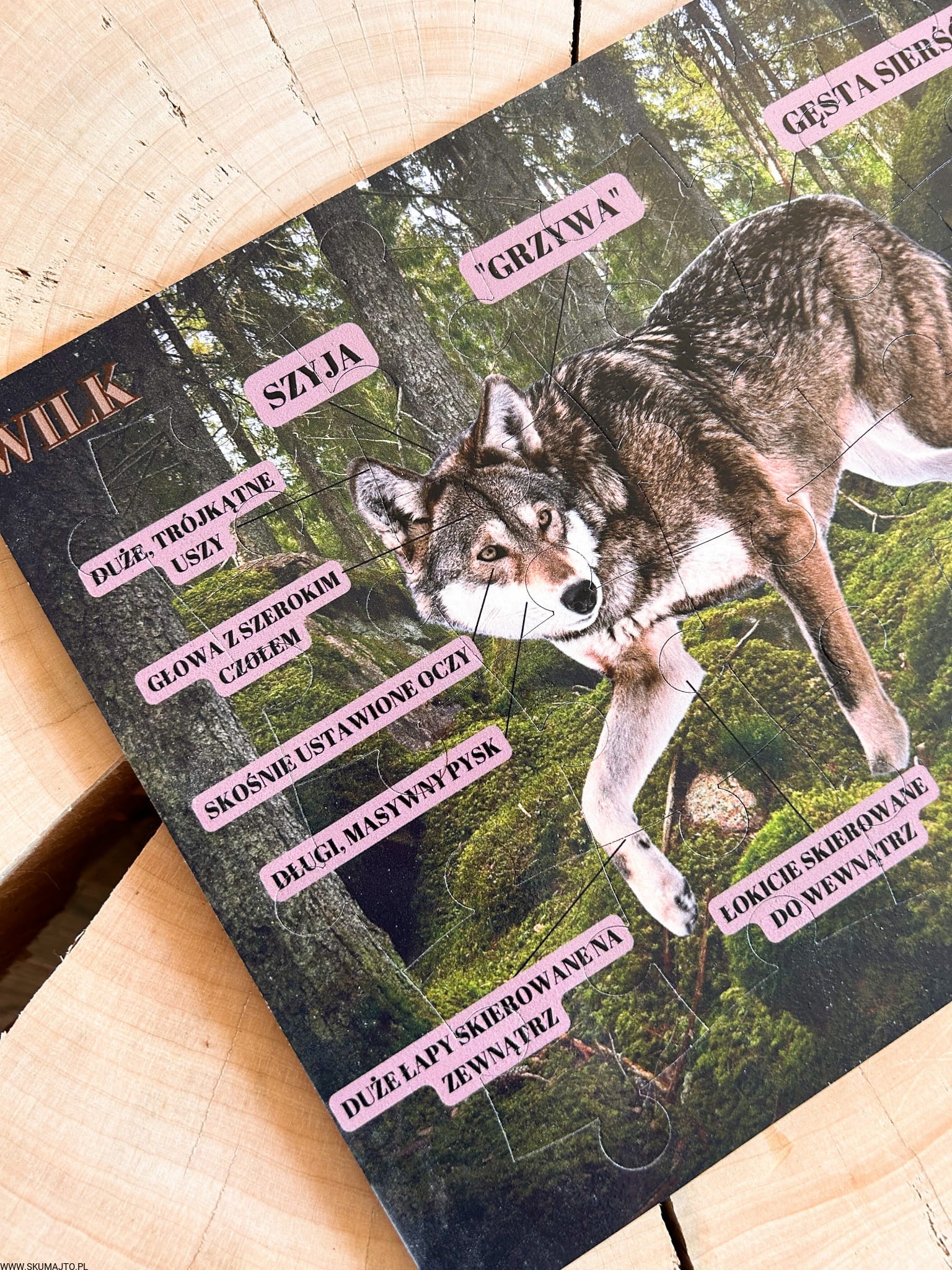 Świat wilka, układanka drewniana, edukacja leśna, ciekawostki o wilku