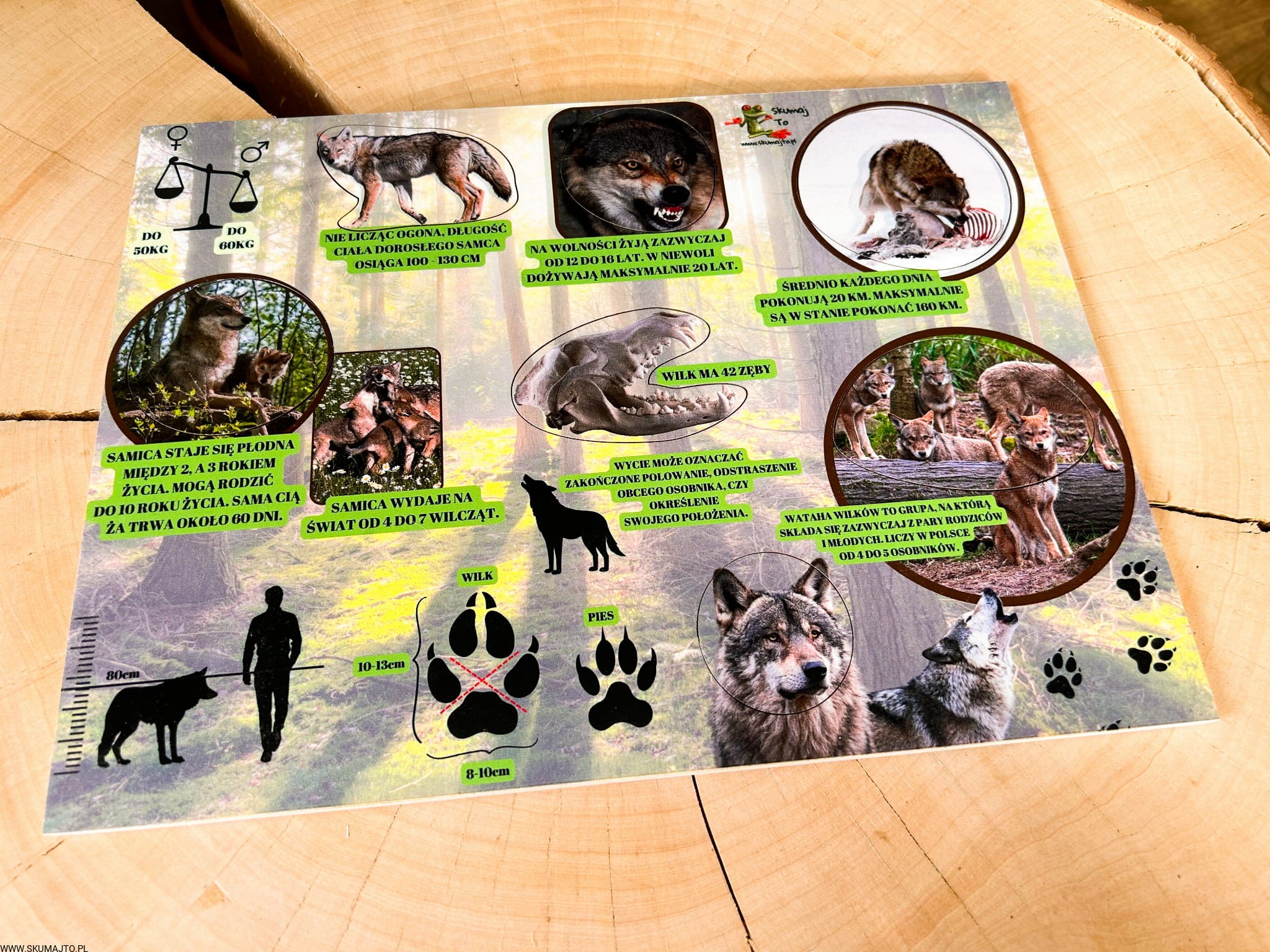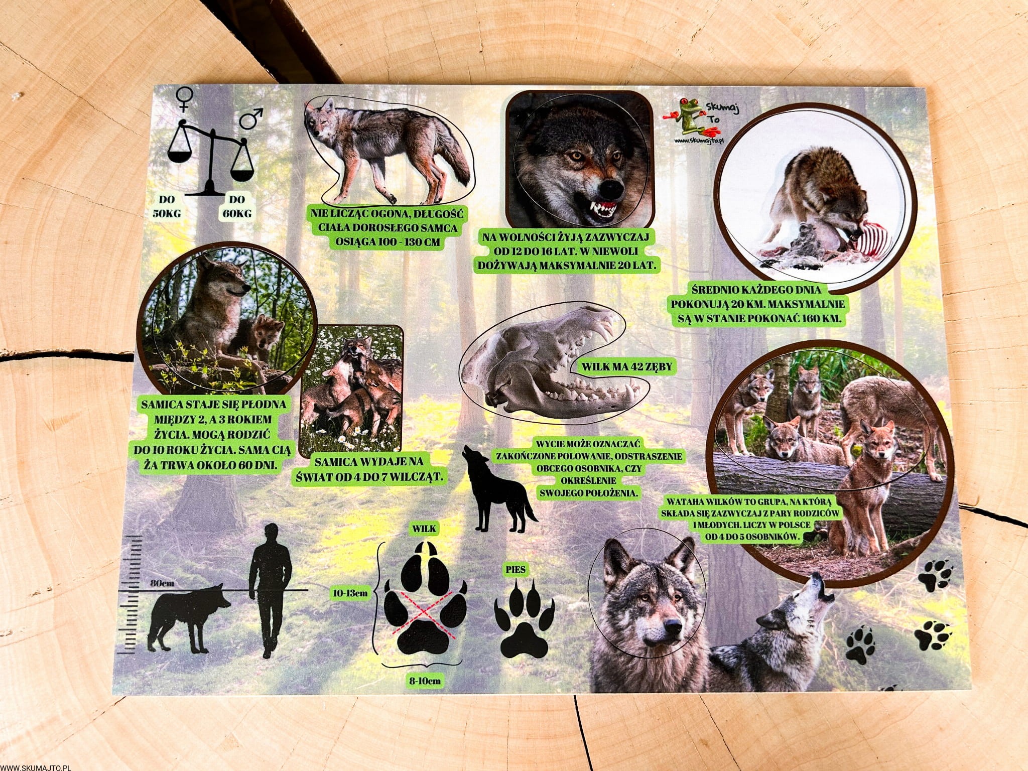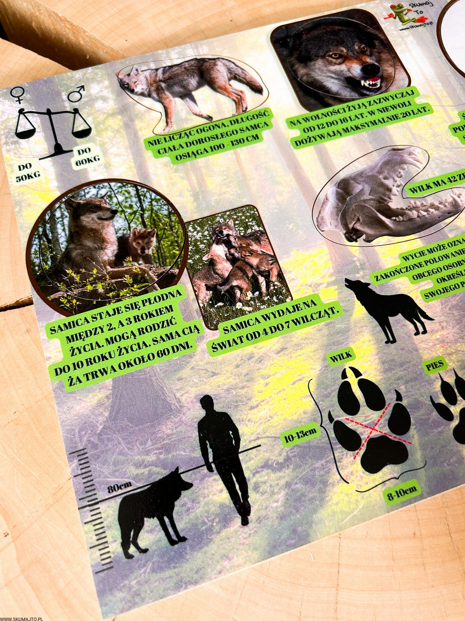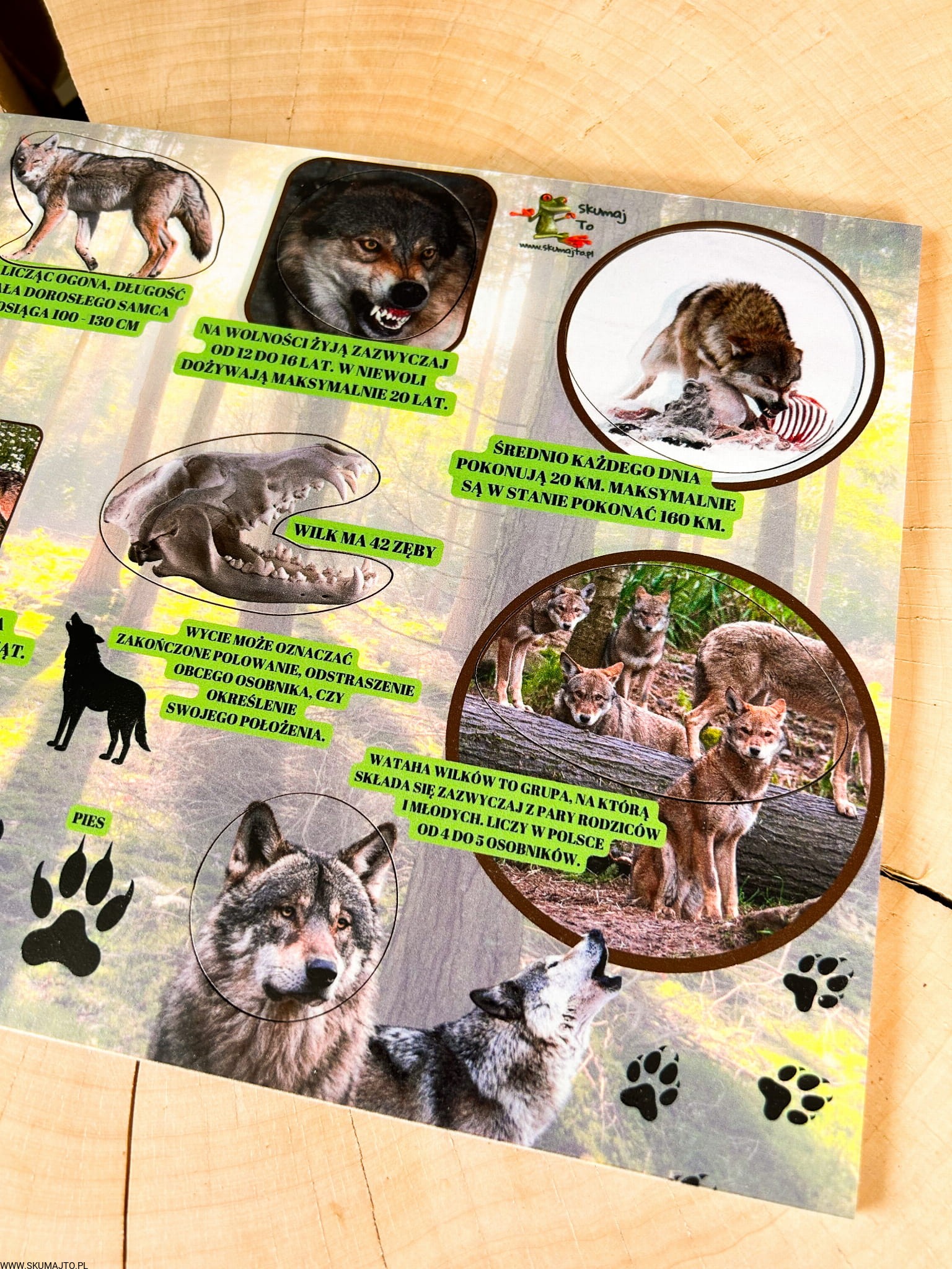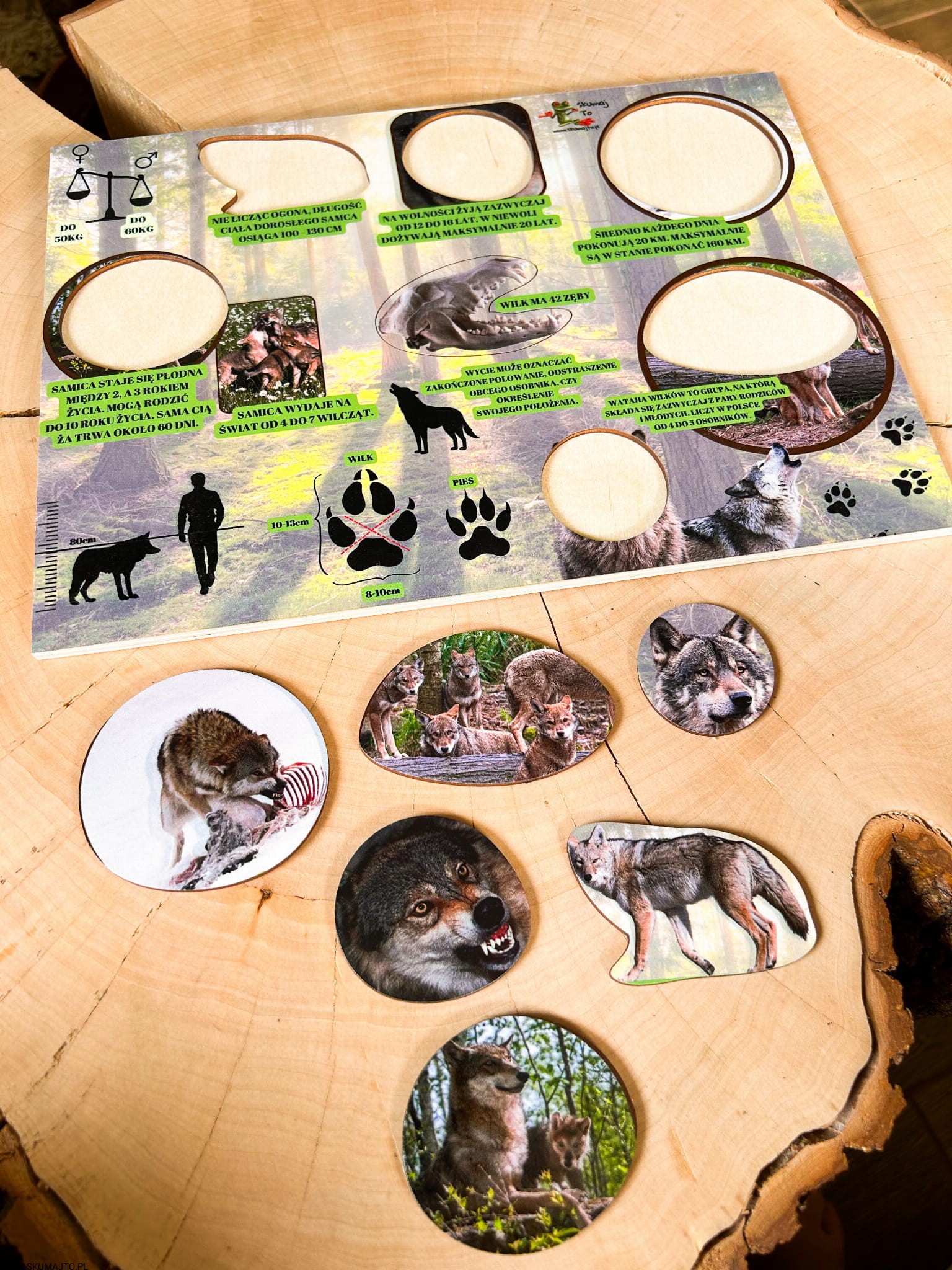 Świat wilka, układanka drewniana, edukacja leśna, ciekawostki o wilku