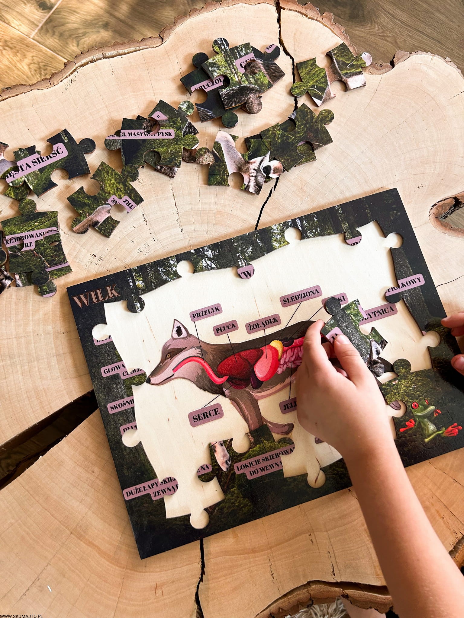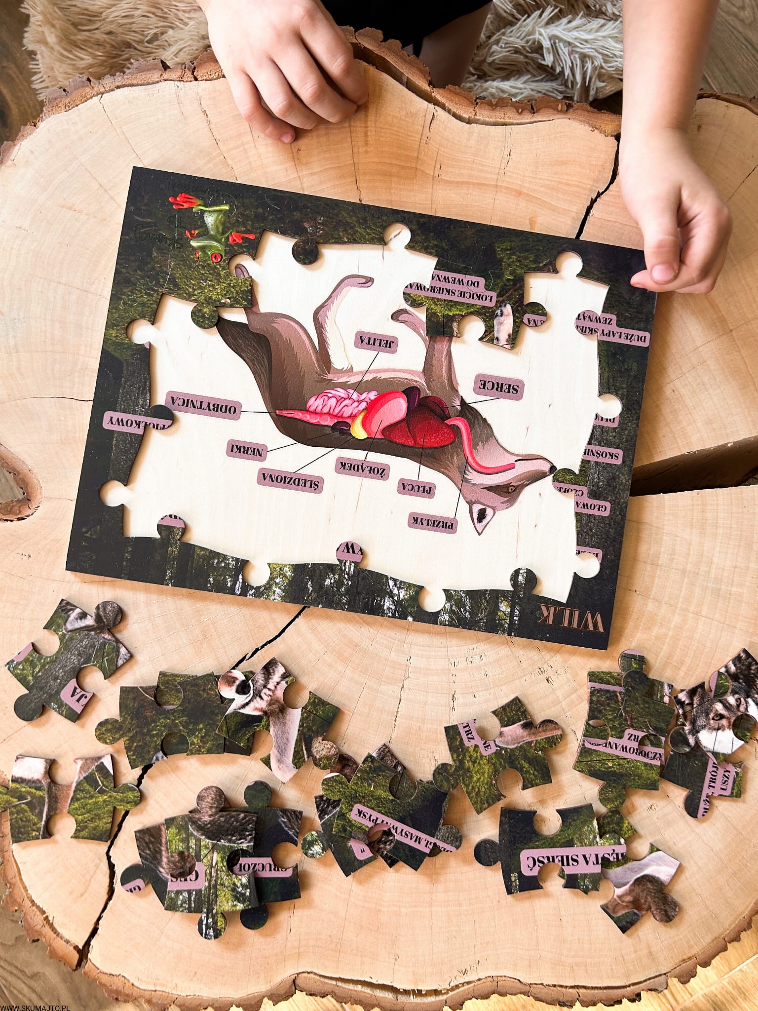 Nauka i Zabawa w Jednym: Nasze układanki to nie tylko zwykłe puzzle. To fascynująca podróż po świecie wilków, która zachęca dzieci do nauki przez zabawę. Doskonałe narzędzie do rozwijania umiejętności i pasji. W podstawie ukrył się wilk i jego narządy wewnętrzne! Puzzle przedstawiają budowę zewnętrzną wilka.