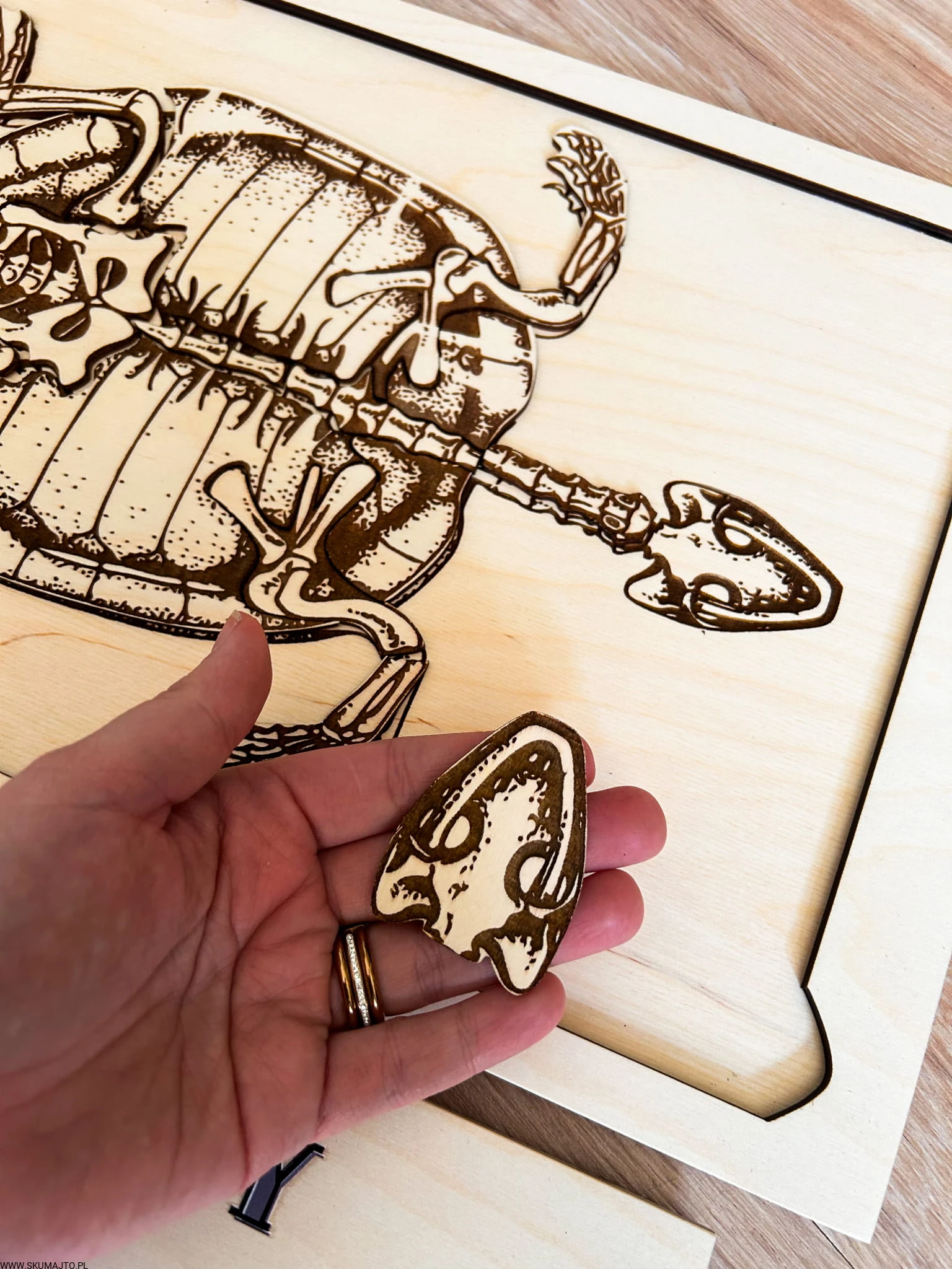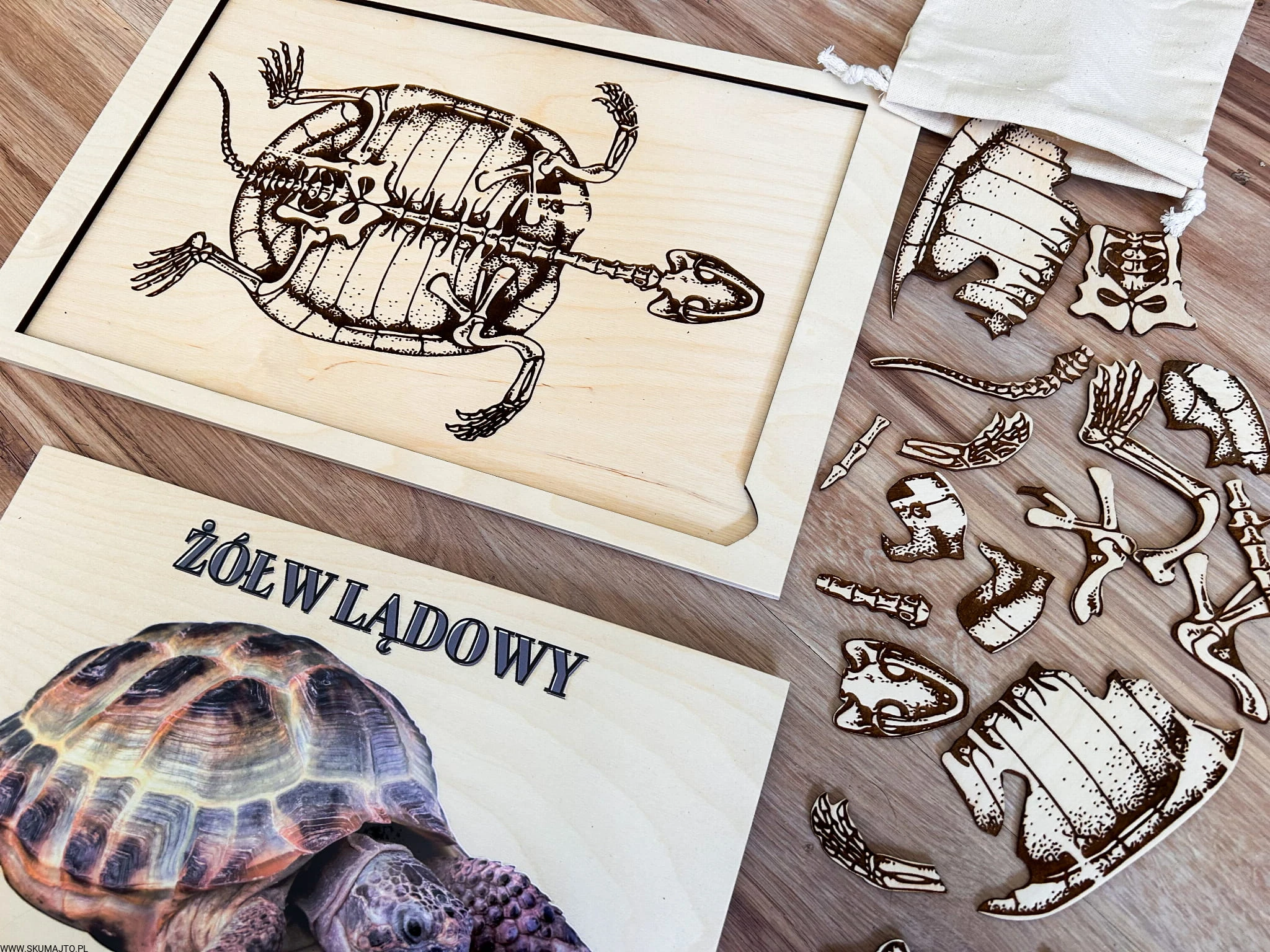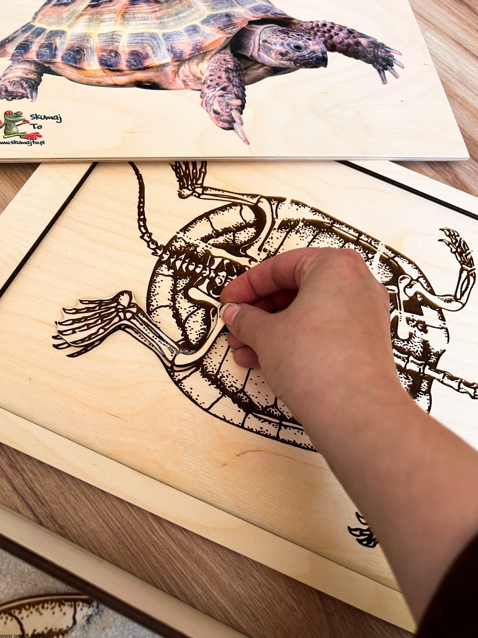 - Zestaw zawiera: Drewnianą podstawę z wygrawerowanym szkieletem żółwia oraz dopasowane drewniane elementy szkieletu do układania.