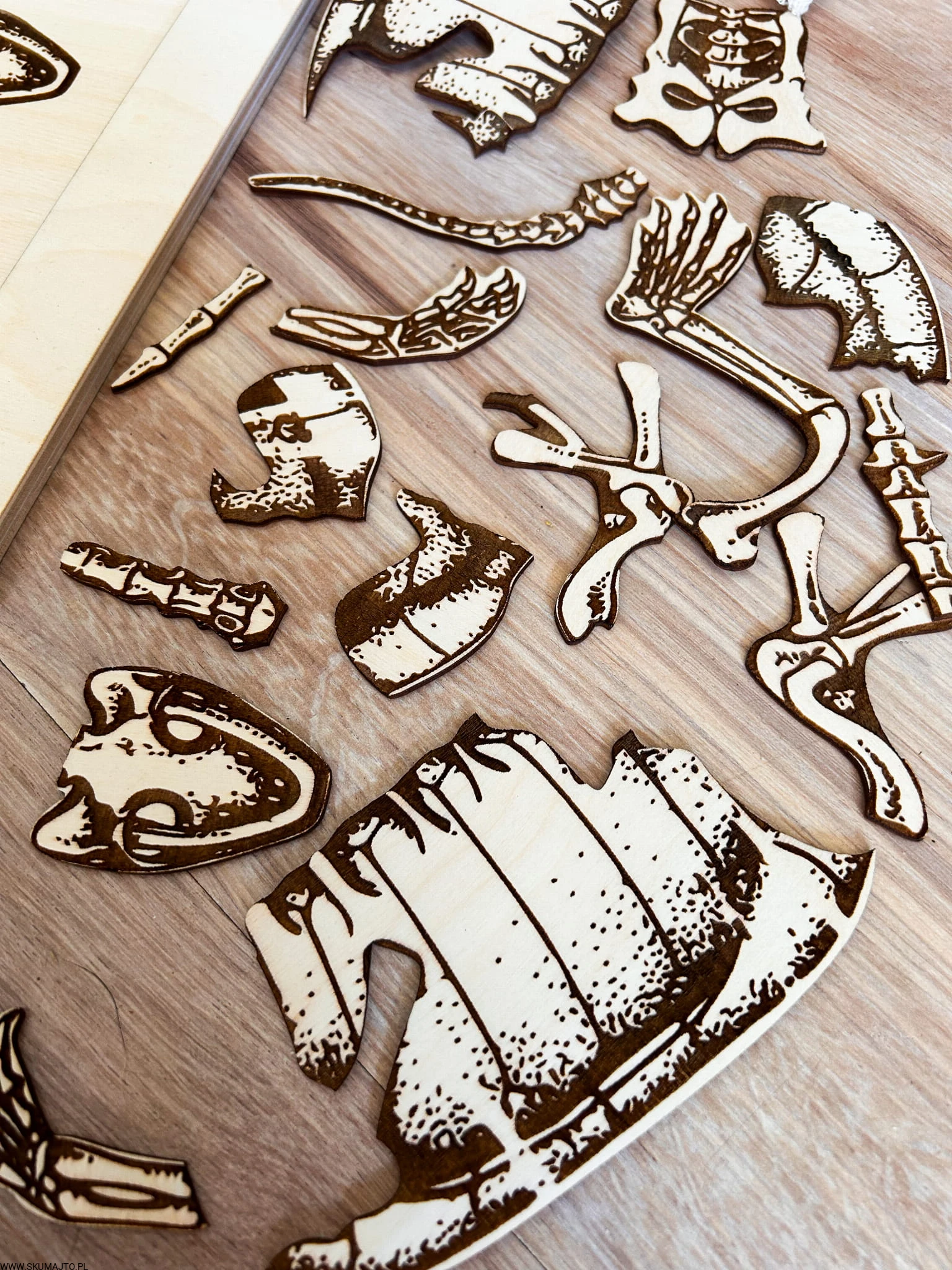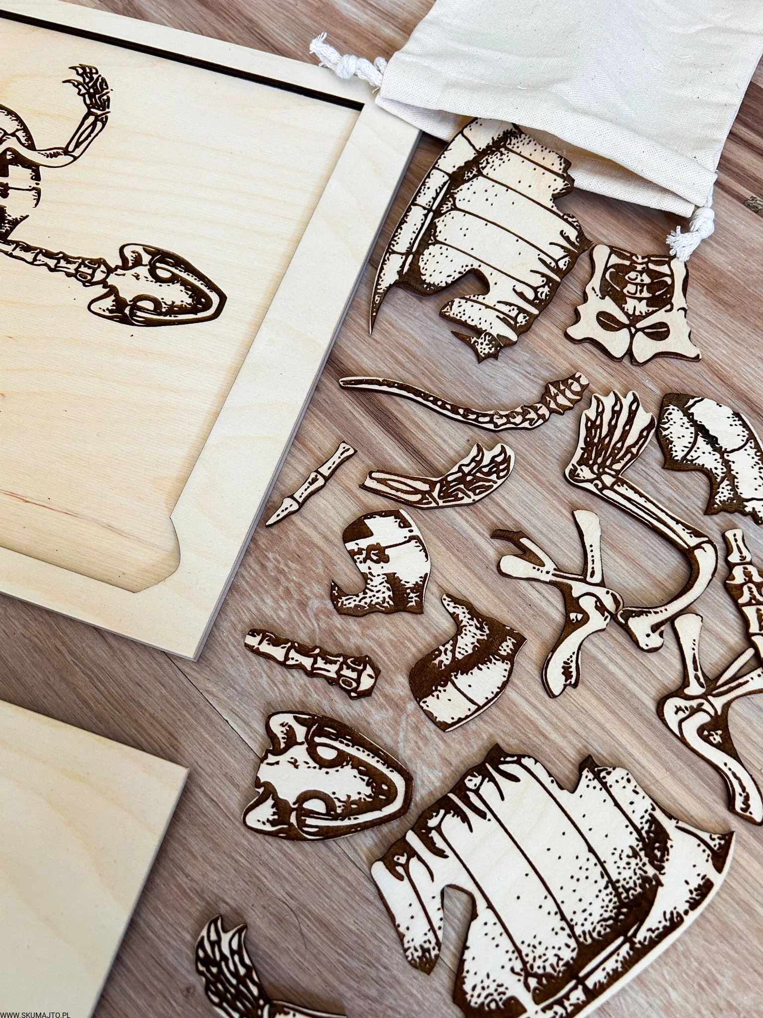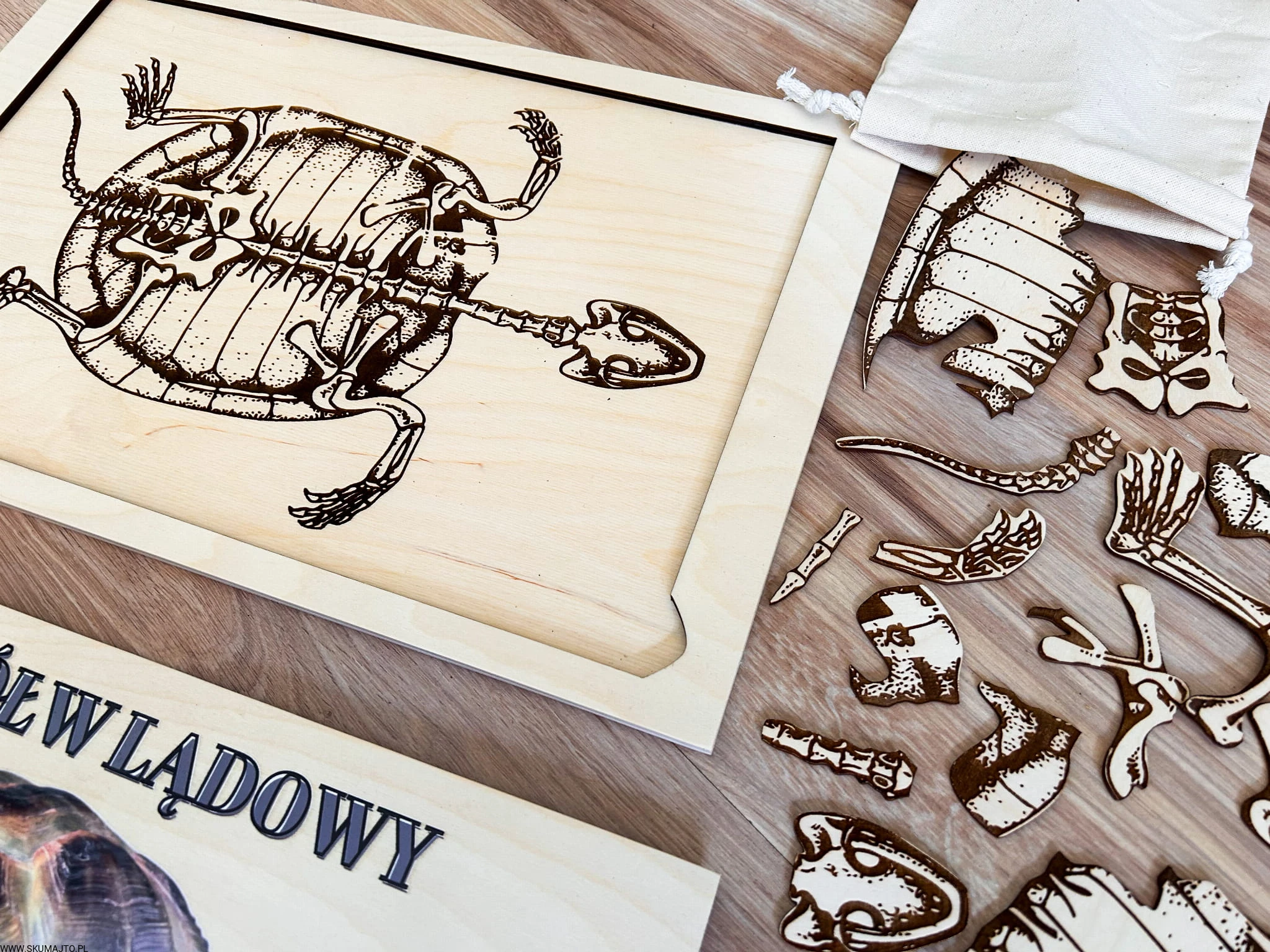 - Zestaw zawiera: Drewnianą podstawę z wygrawerowanym szkieletem żółwia oraz dopasowane drewniane elementy szkieletu do układania.