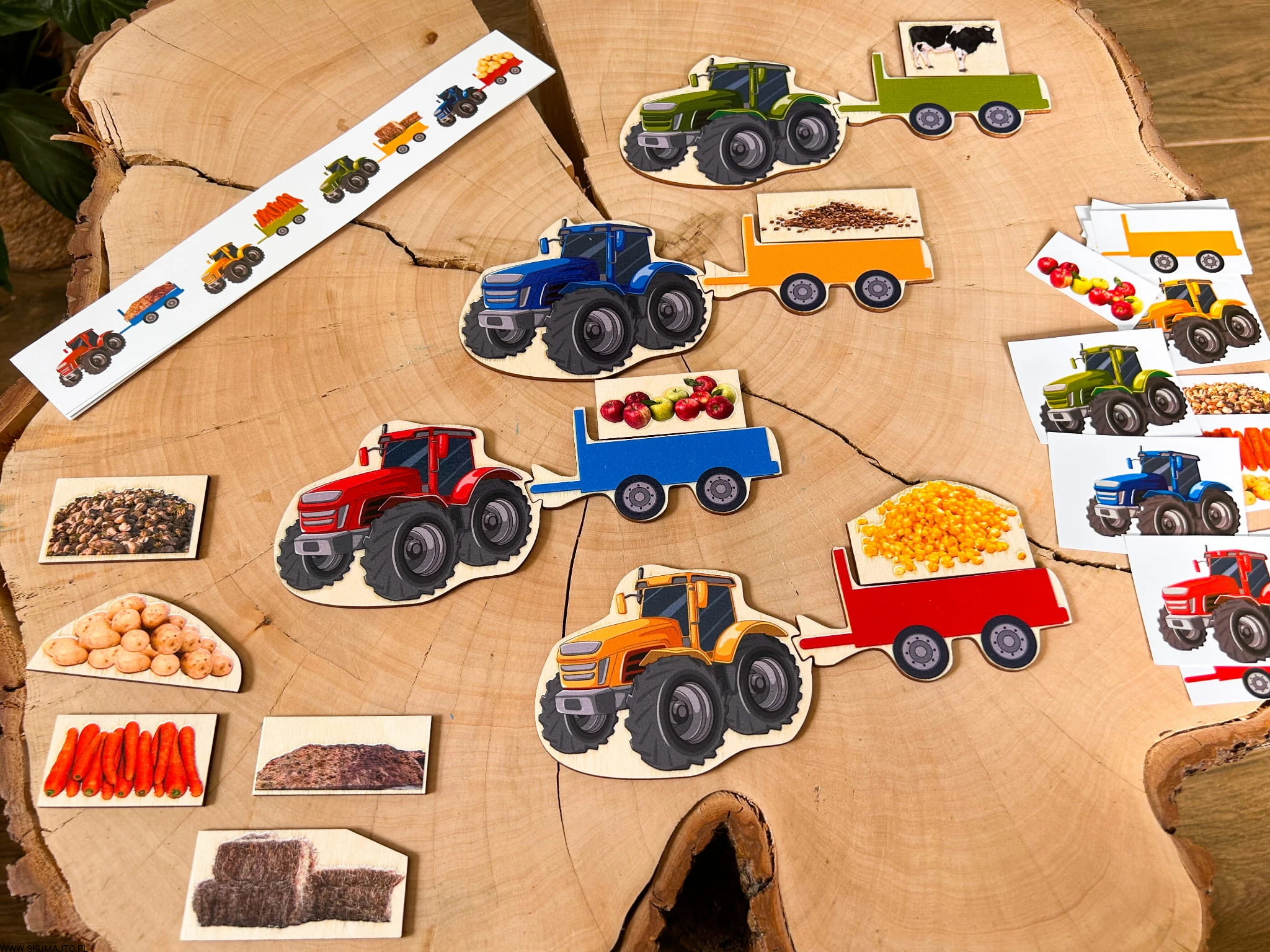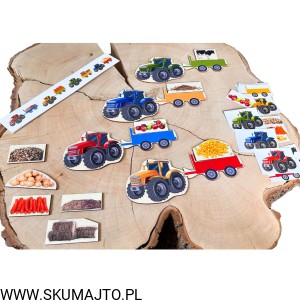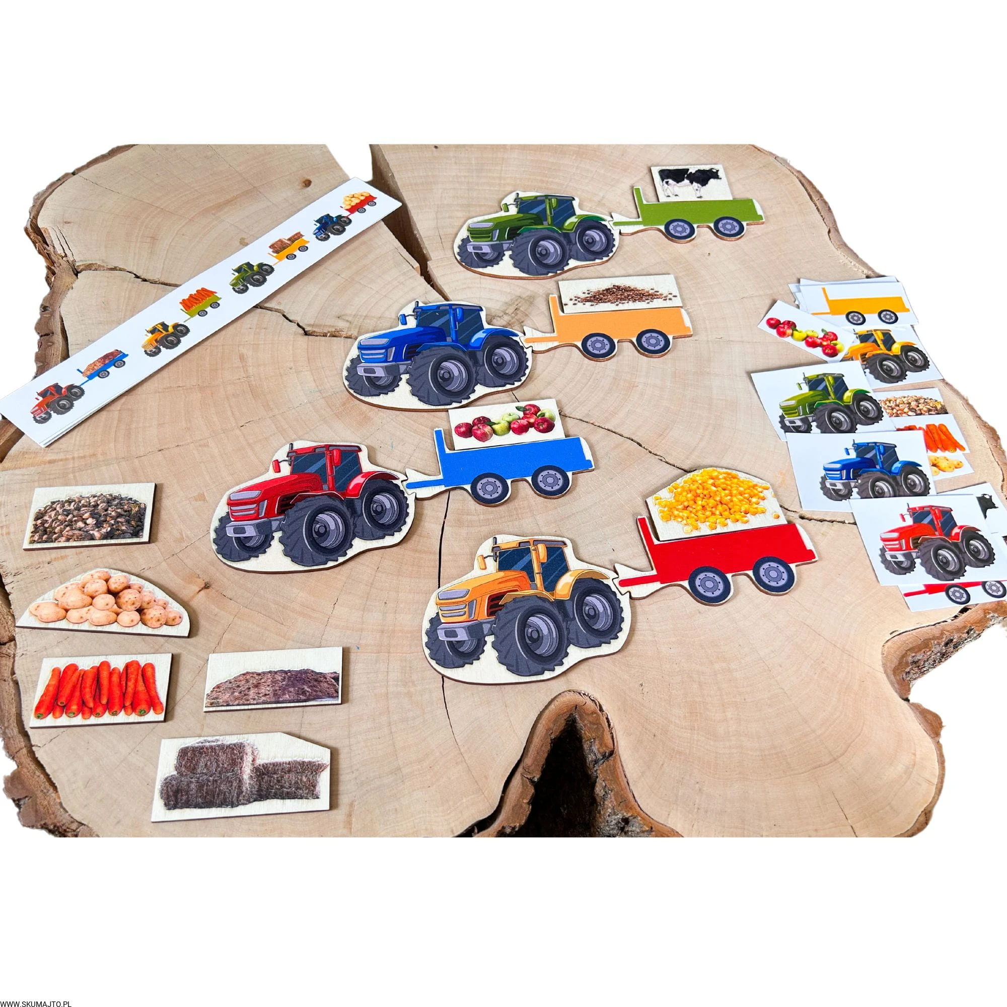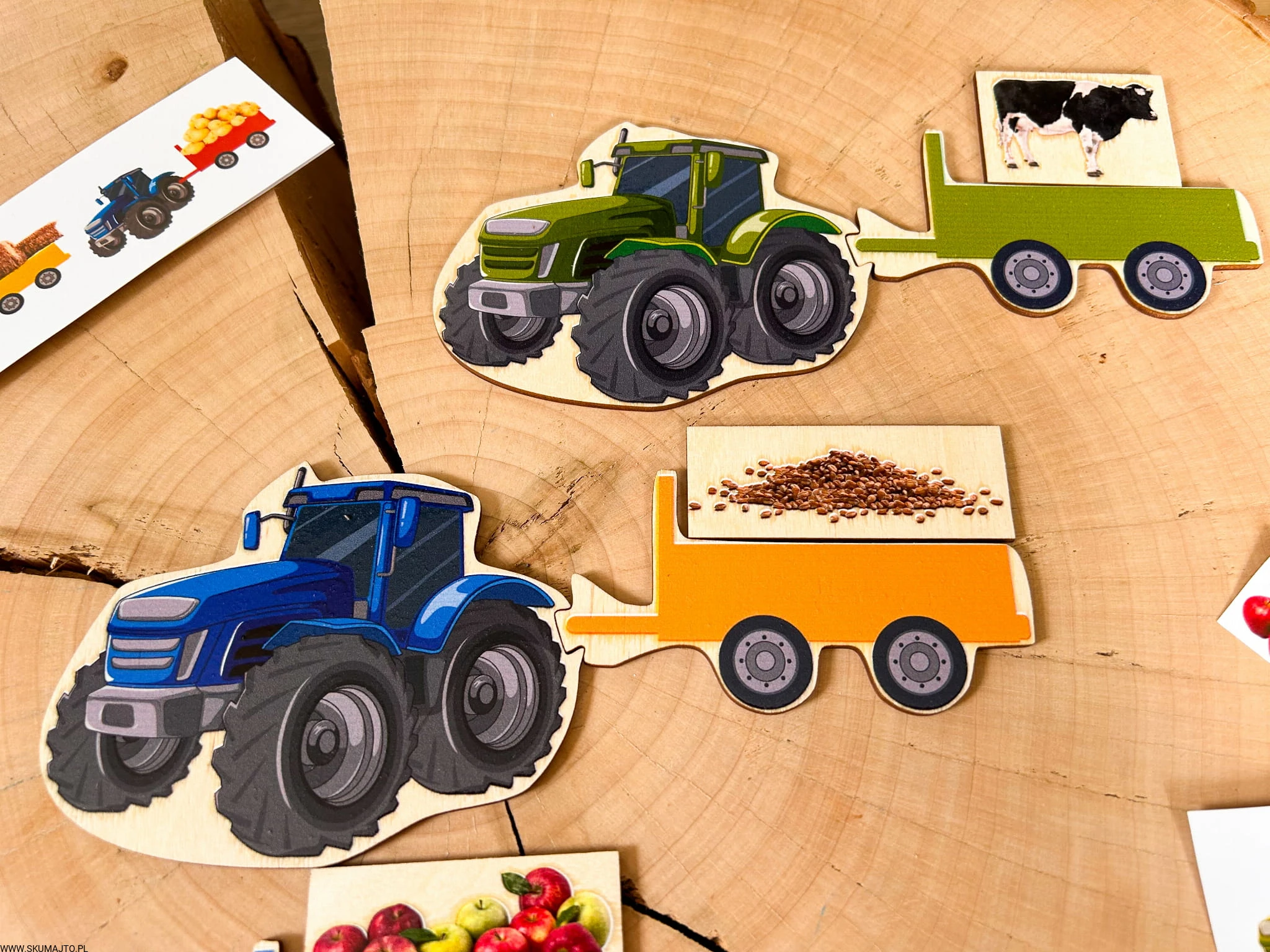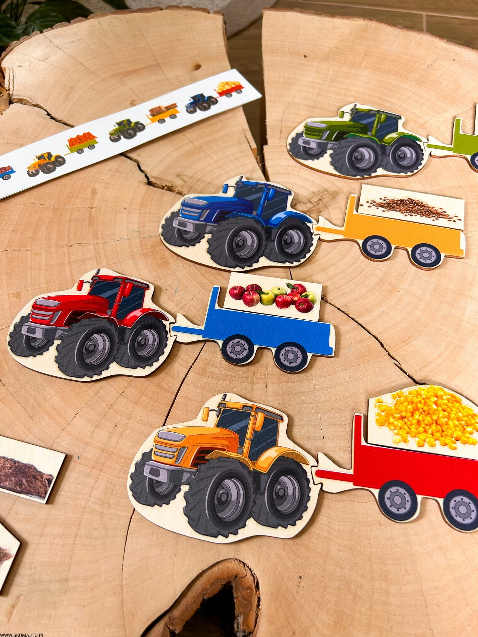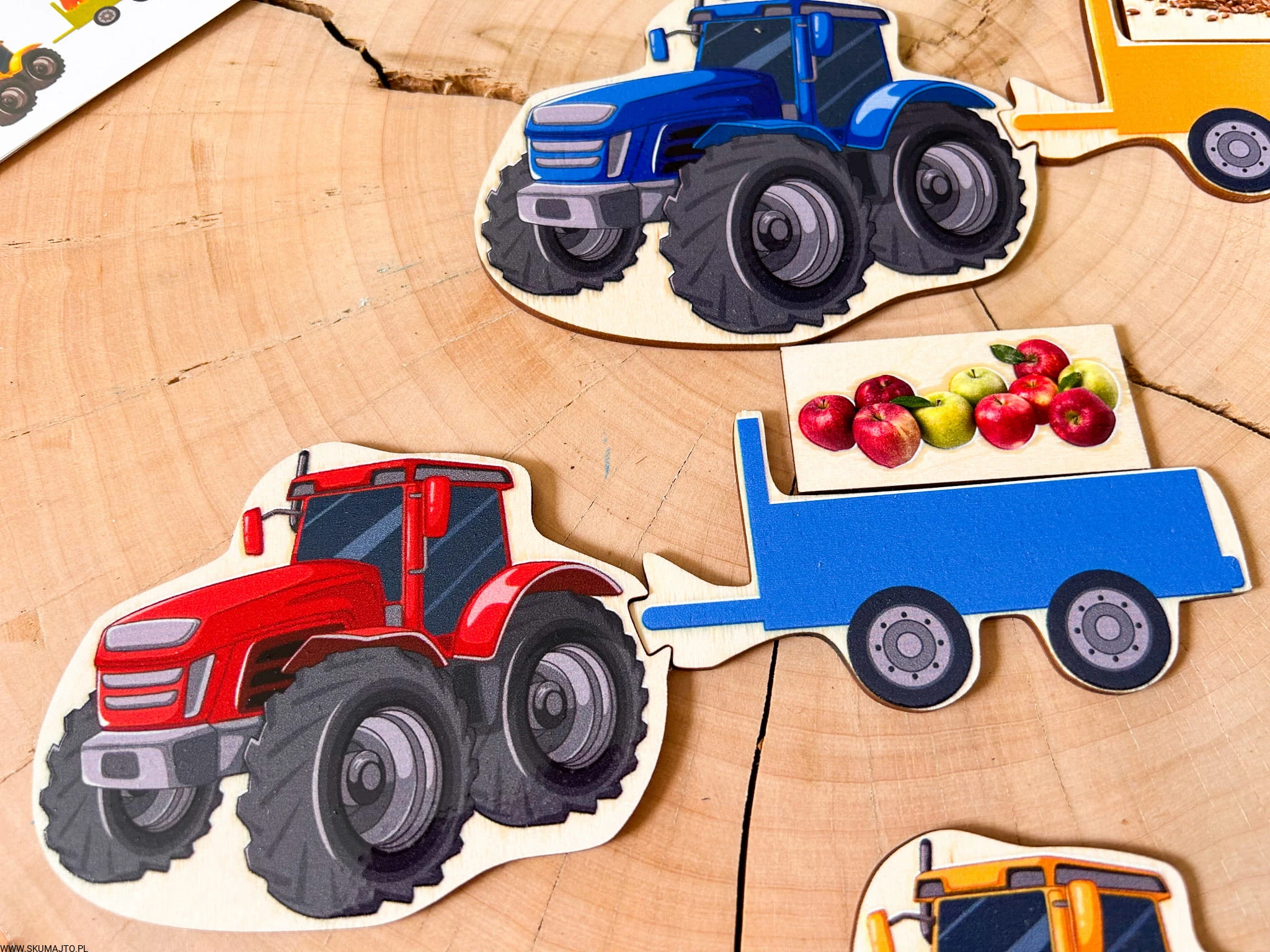 Traktory z przyczepami, drewniana układanka do odwzorowywania