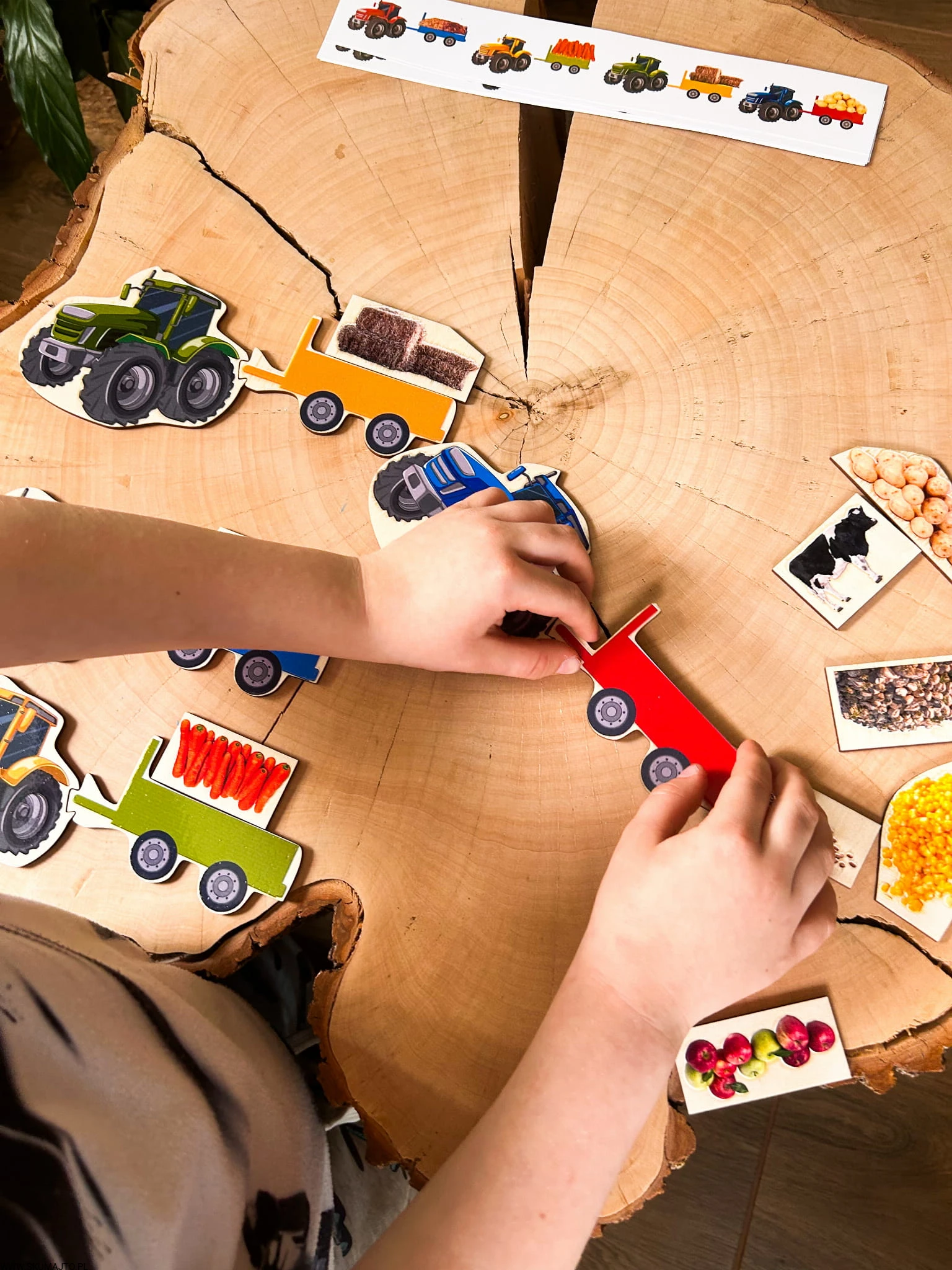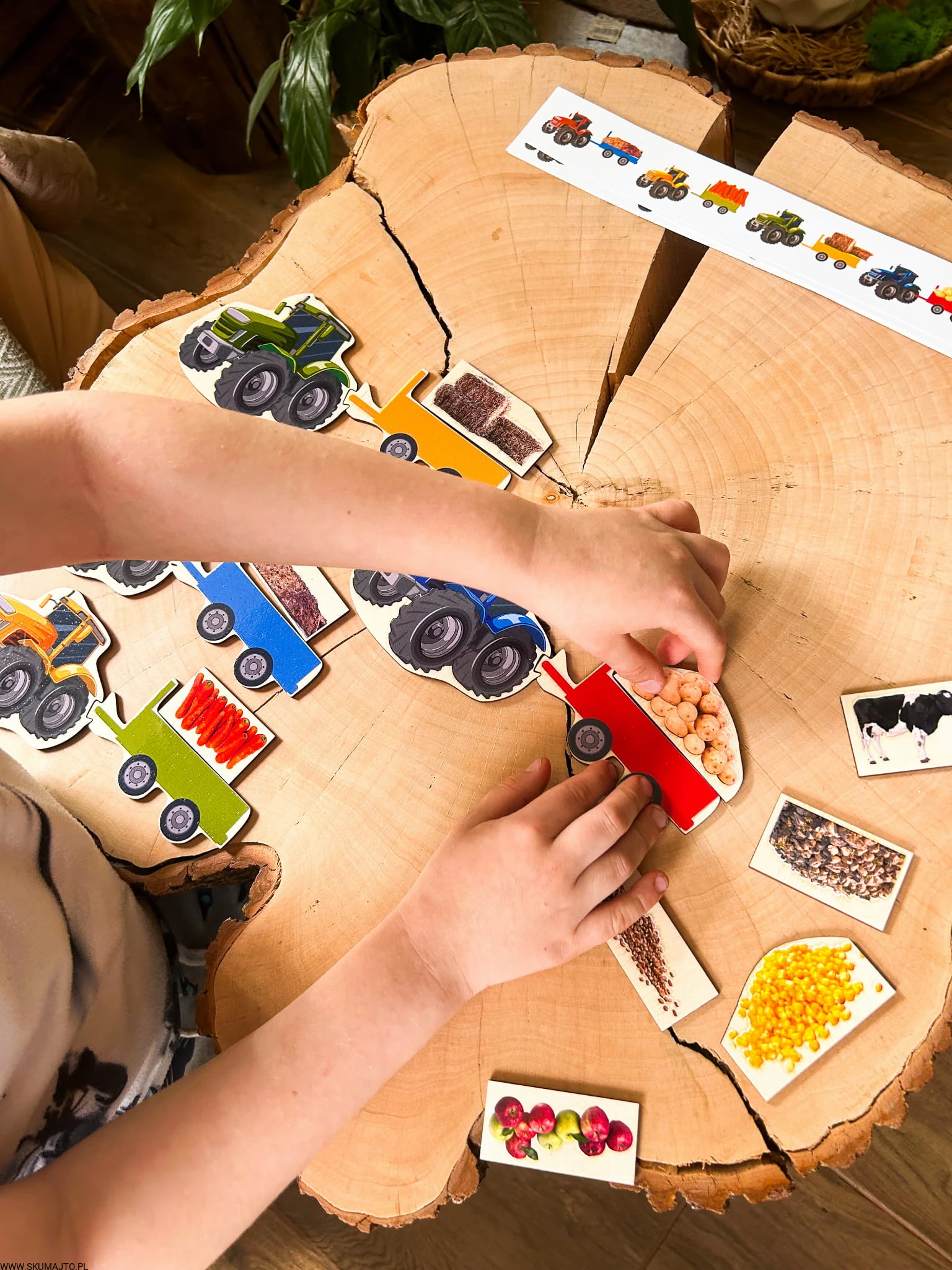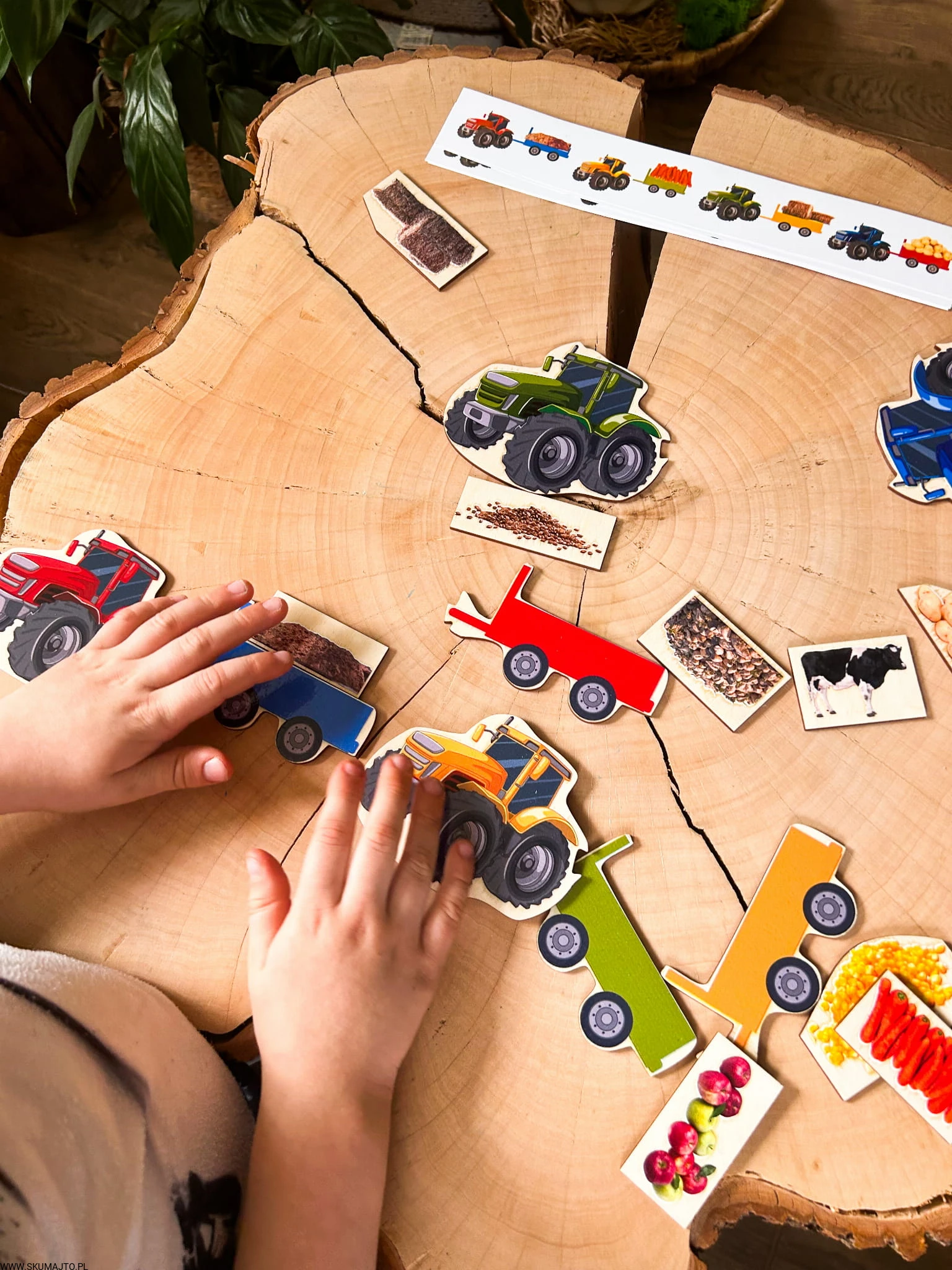 Stymulacja Logicznego Myślenia: Dopasowywanie traktorów do przyczep oraz układanie ładunków zgodnie z kartami do odwzorowywania zachęca do logicznego myślenia i rozwiązywania problemów.