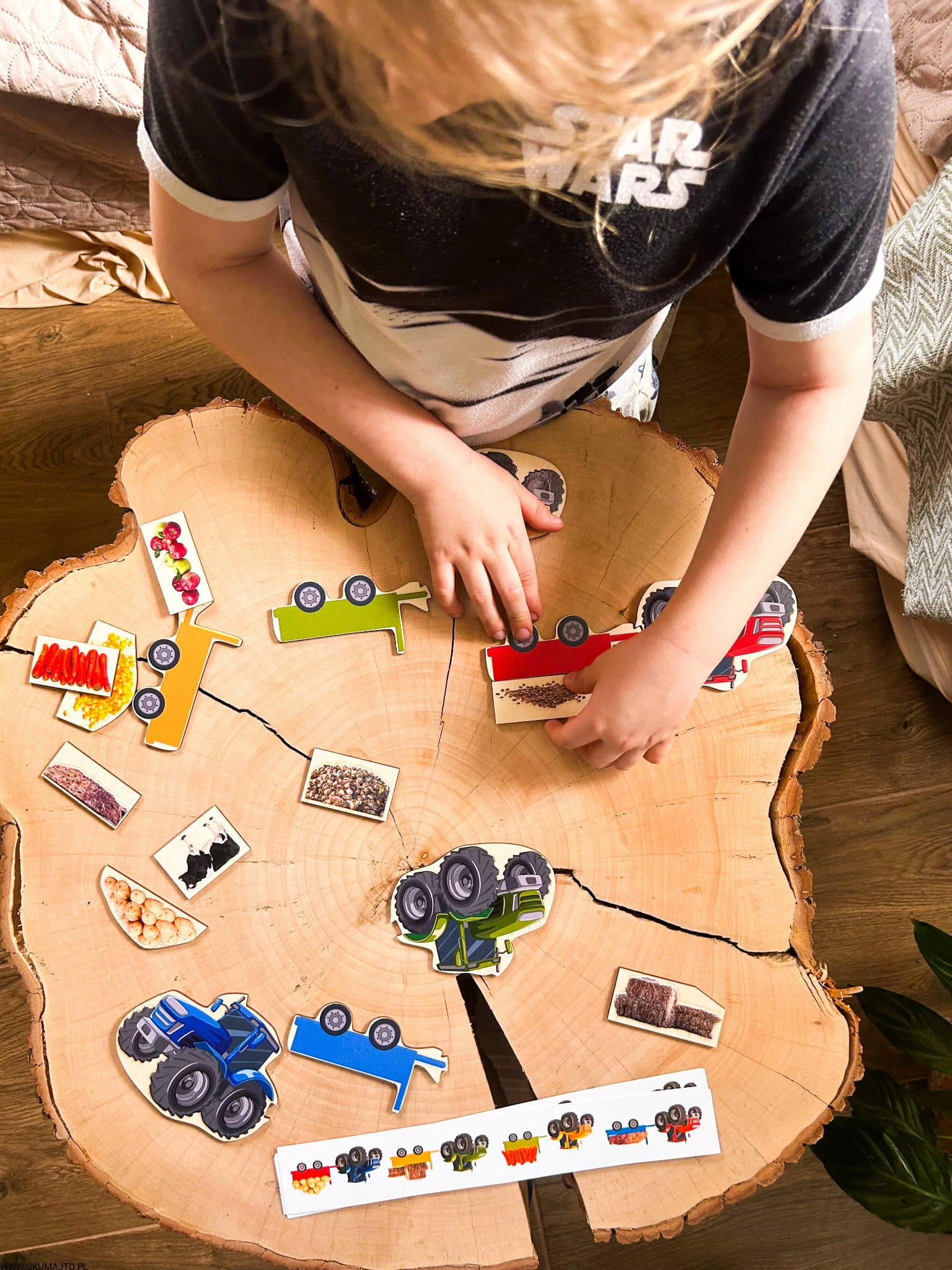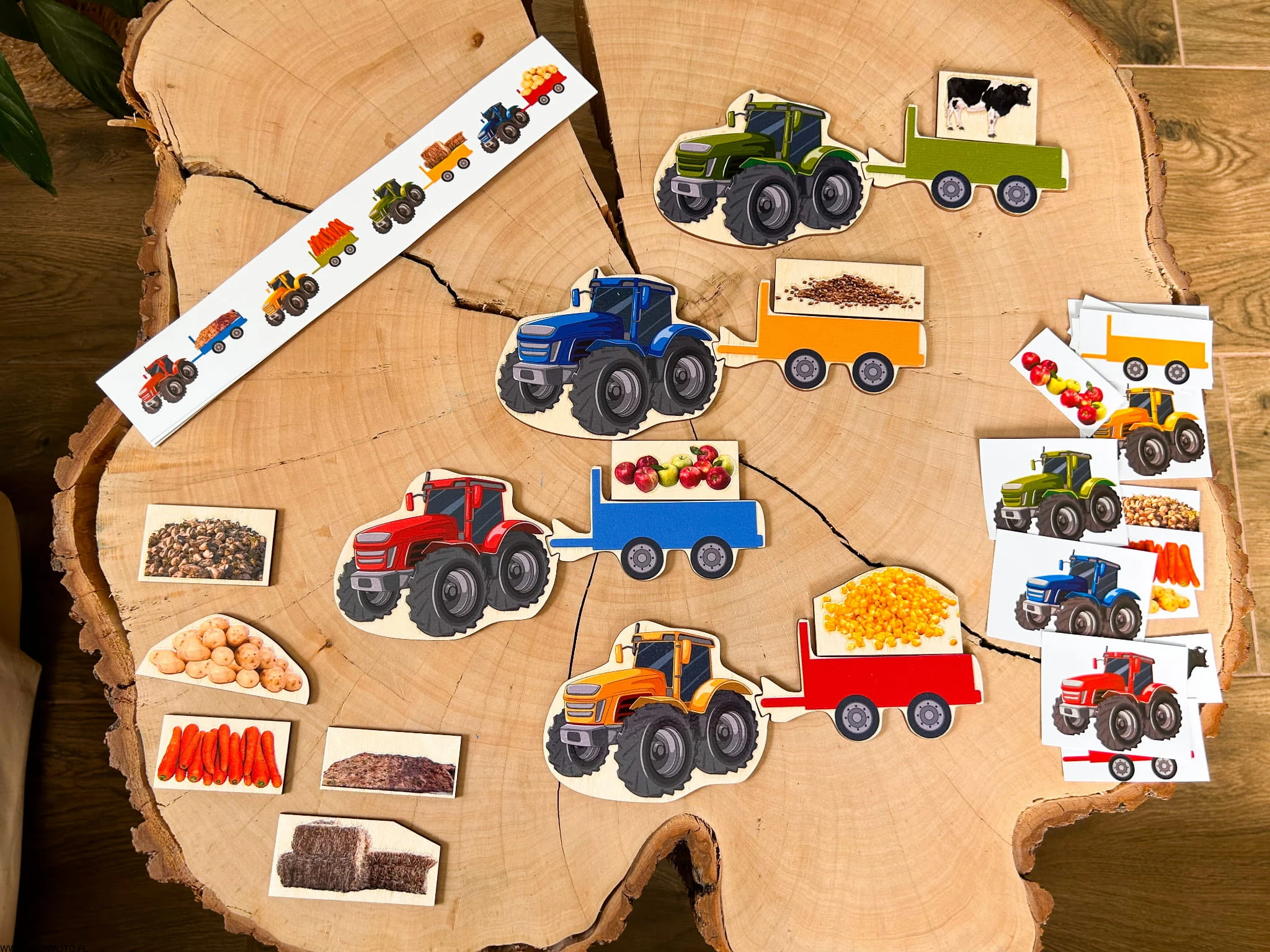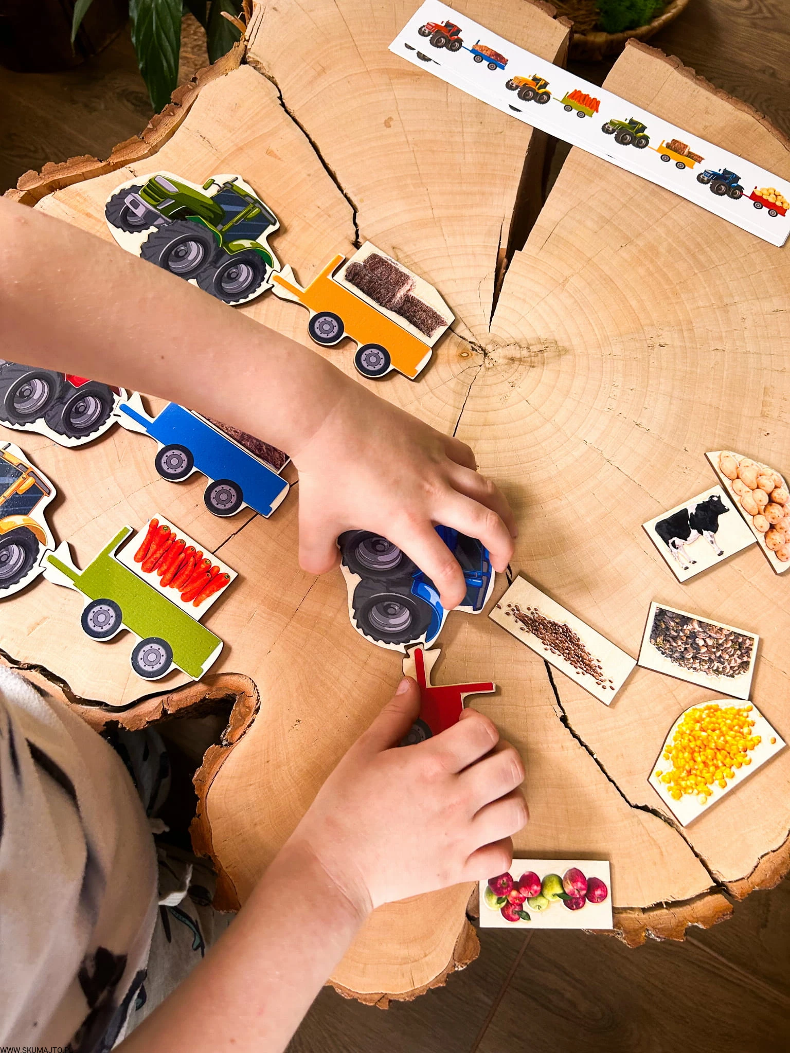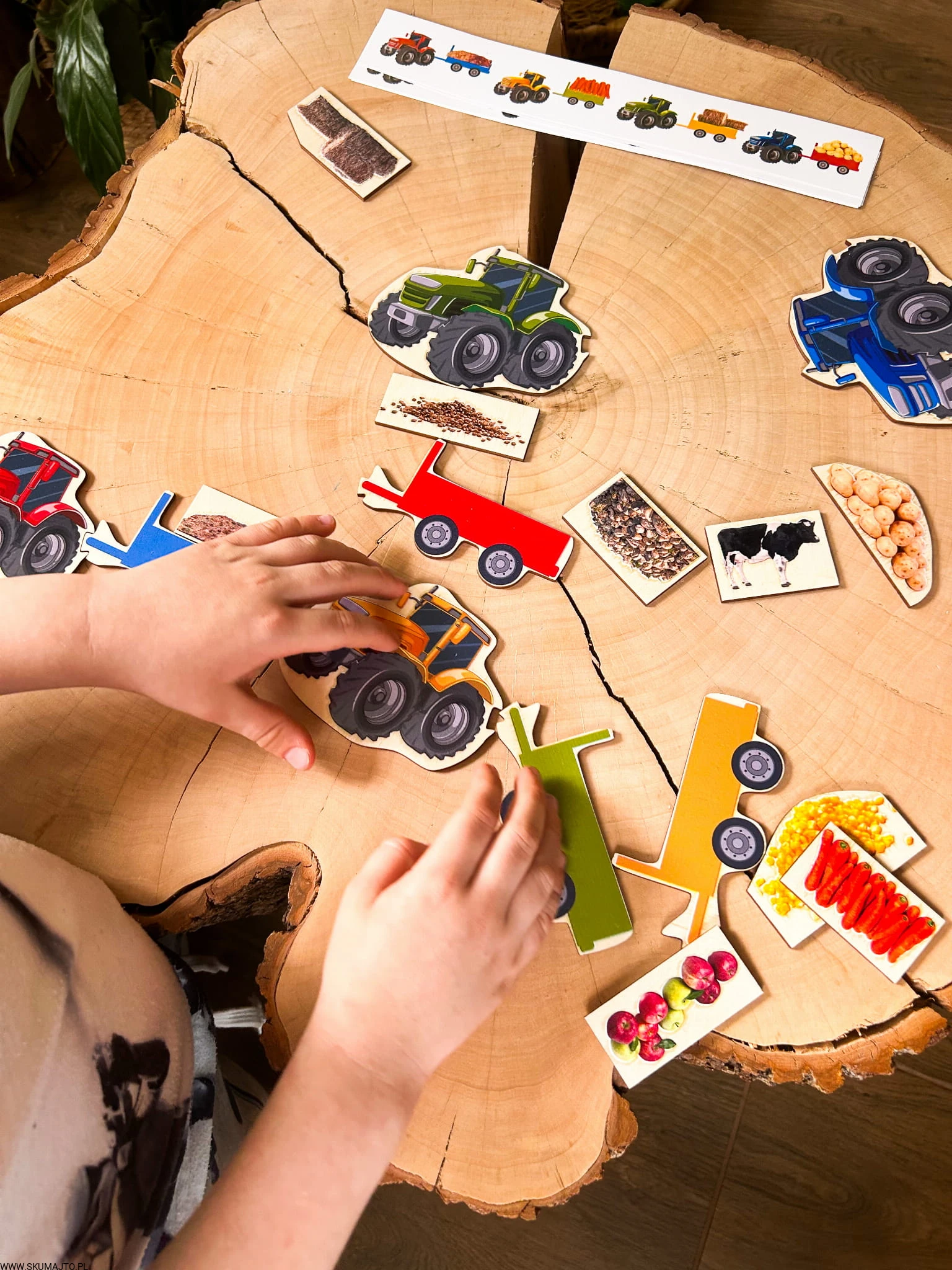 Stymulacja Logicznego Myślenia: Dopasowywanie traktorów do przyczep oraz układanie ładunków zgodnie z kartami do odwzorowywania zachęca do logicznego myślenia i rozwiązywania problemów.