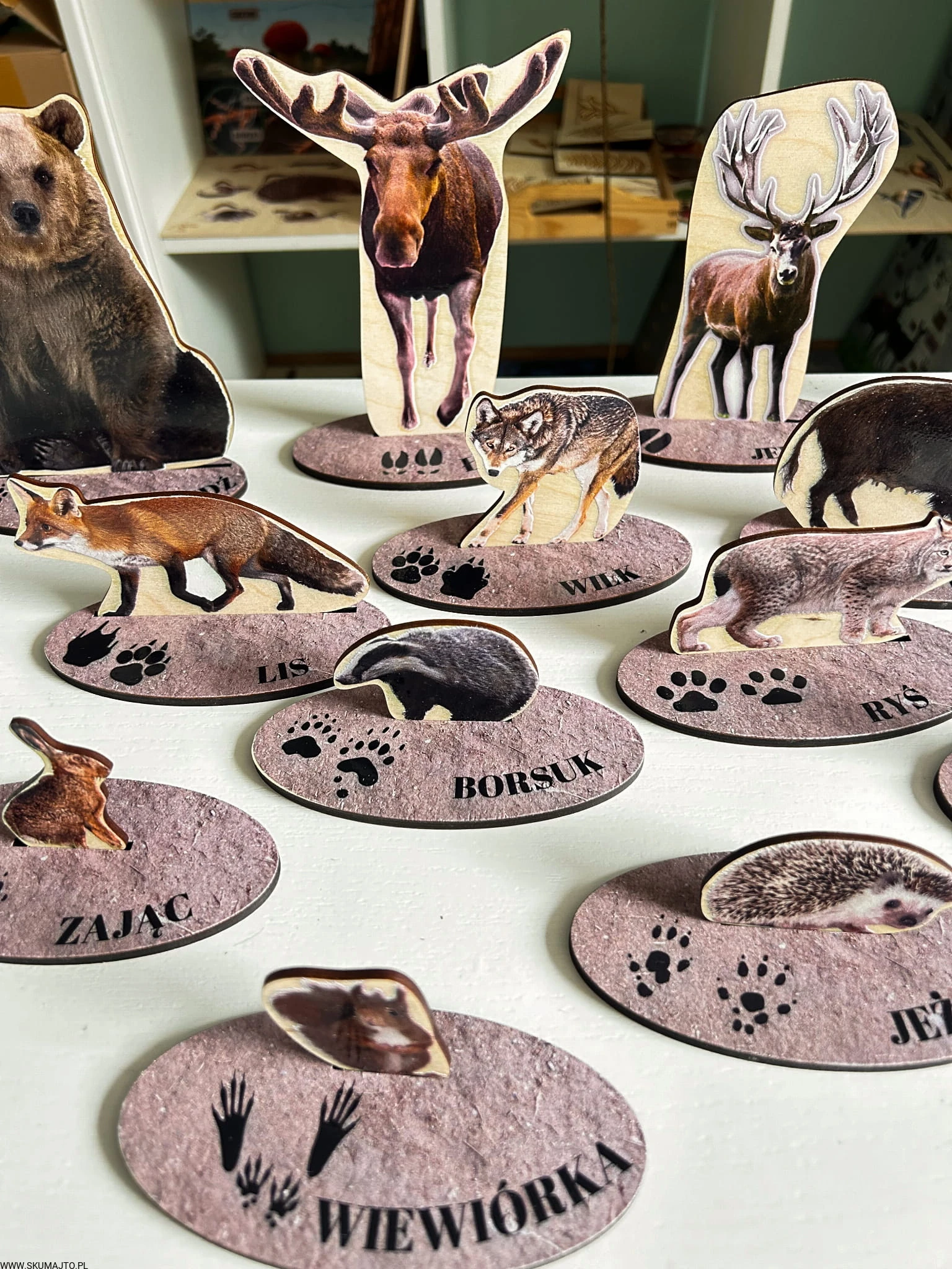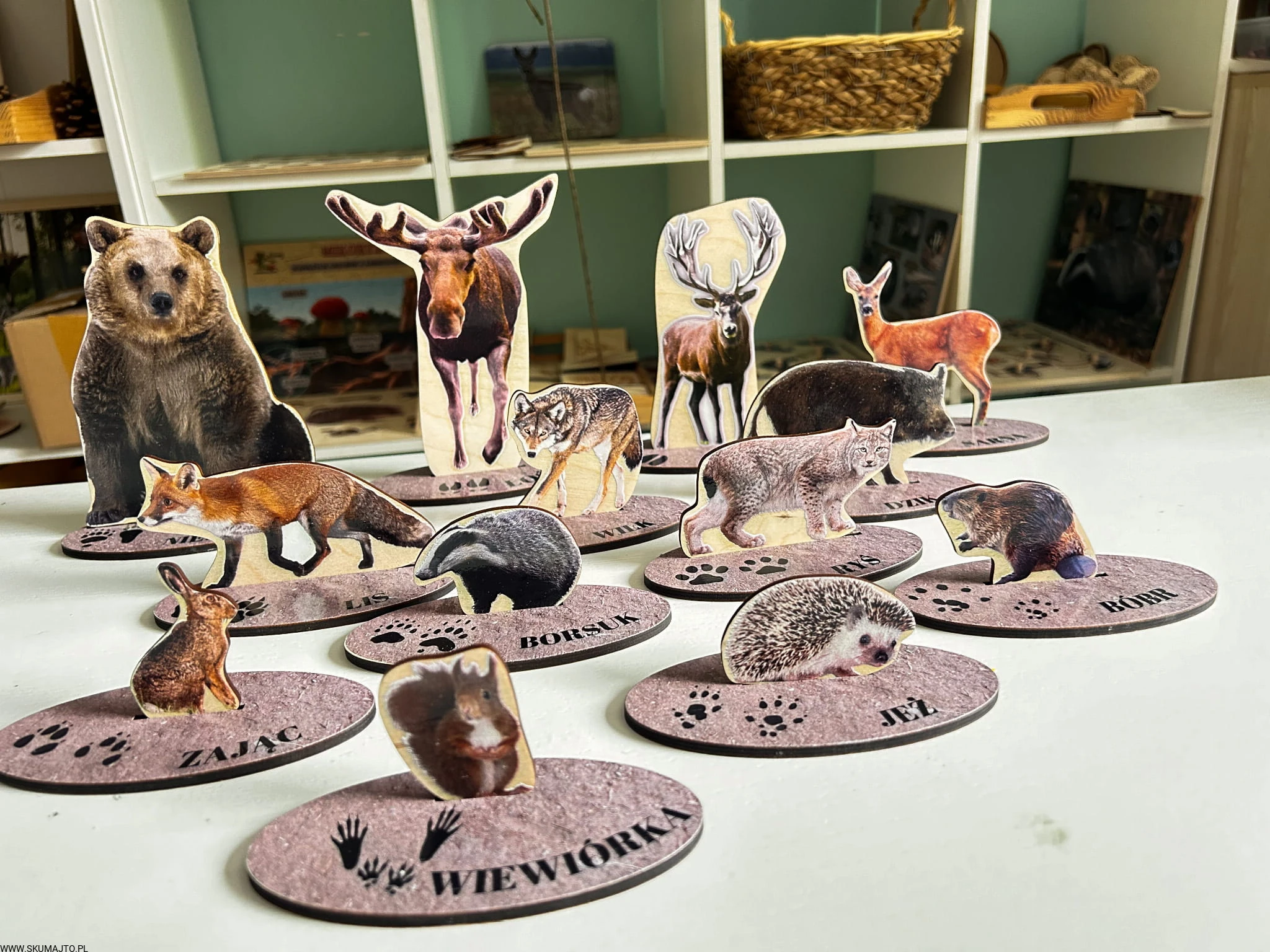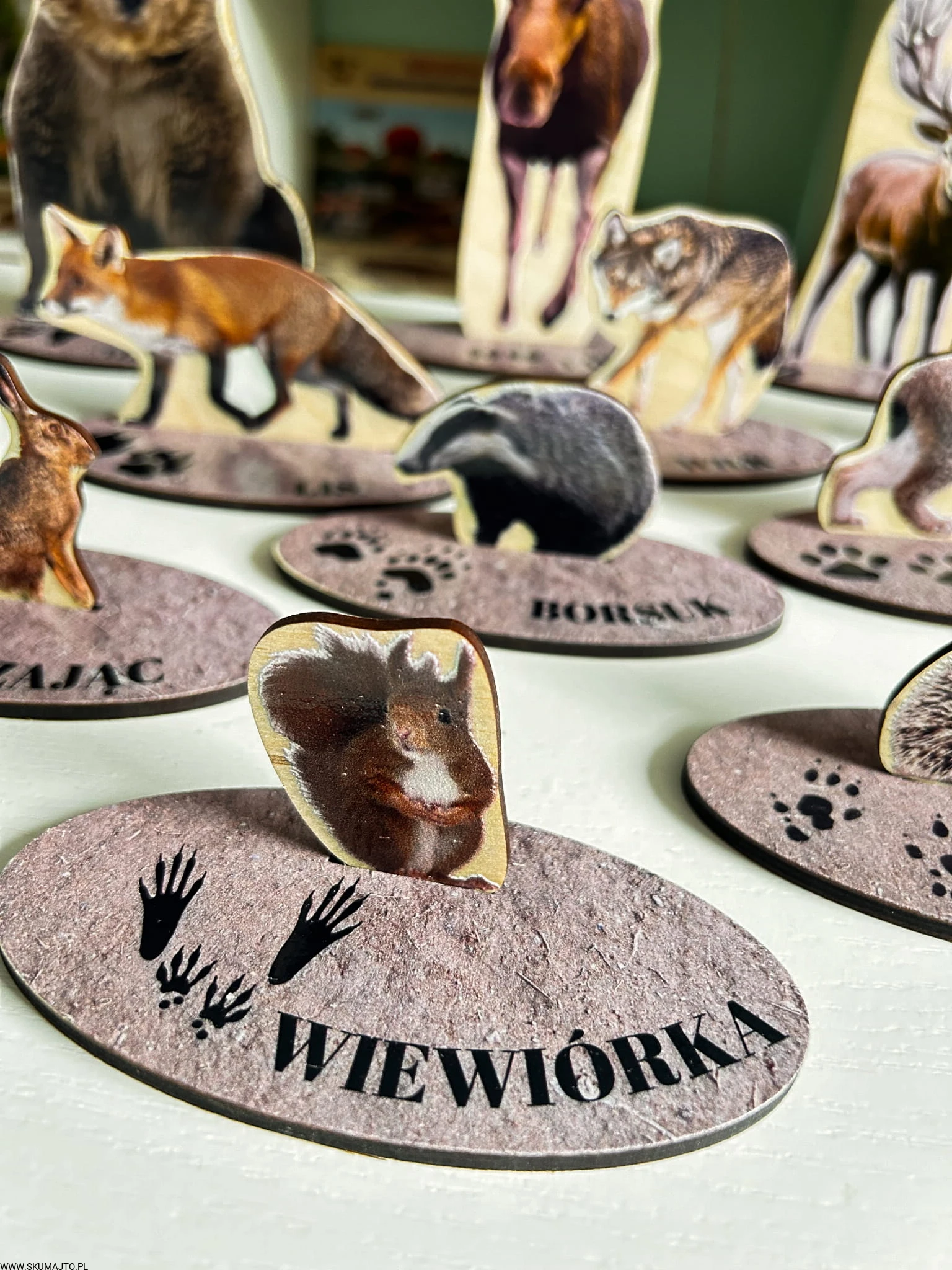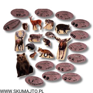 - 13 drewnianych podstawek (o długości 10 cm), na których znajdują się realistyczne tropy i podpisy zwierząt.